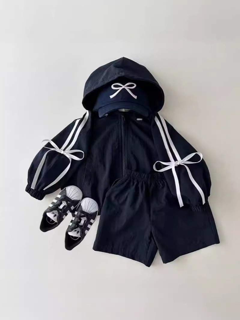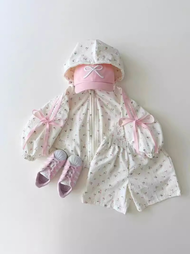 한국 스타일 Ins 후드 지퍼 카디건 세트 반바지 긴 소매 후드 스웨터 꽃 단색 활 여름스토어 가기