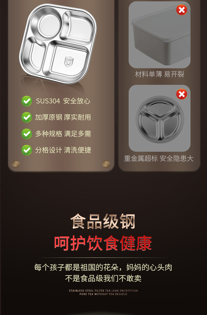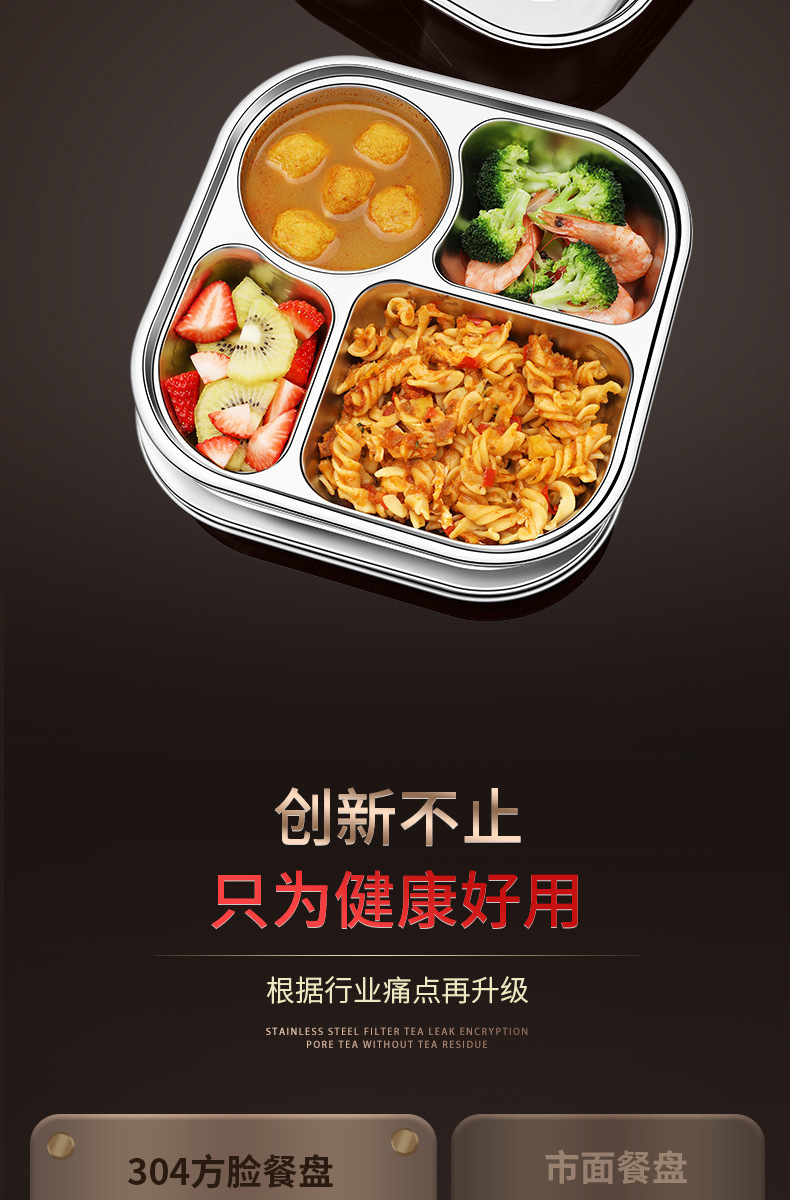• 304 성인 사각형 얼굴 3 구획 플레이트 304 강철 뚜껑 (젓가락과 숟가락 포함)