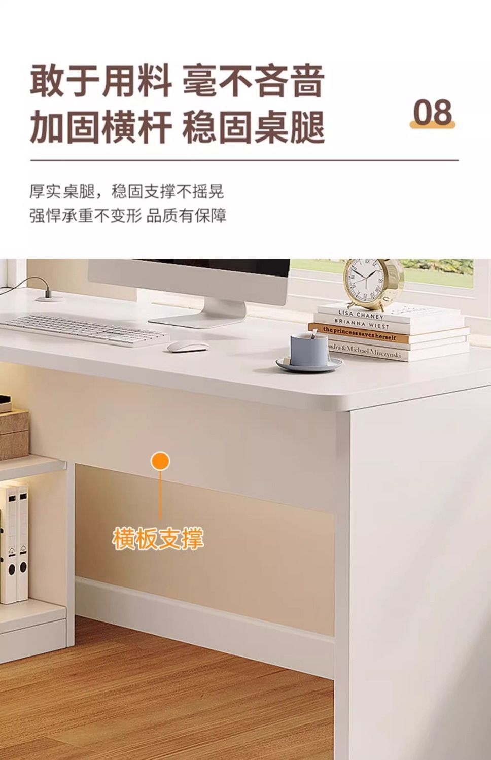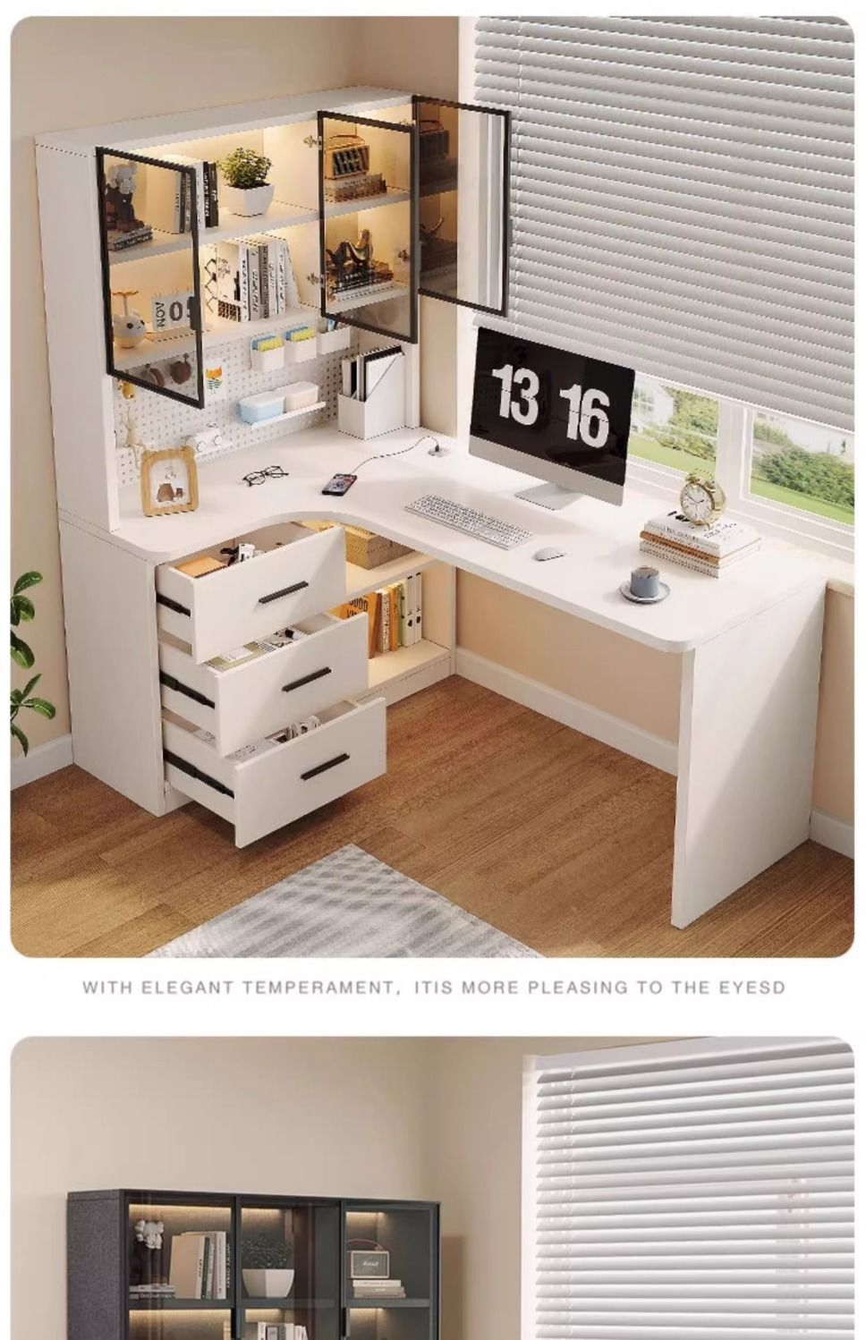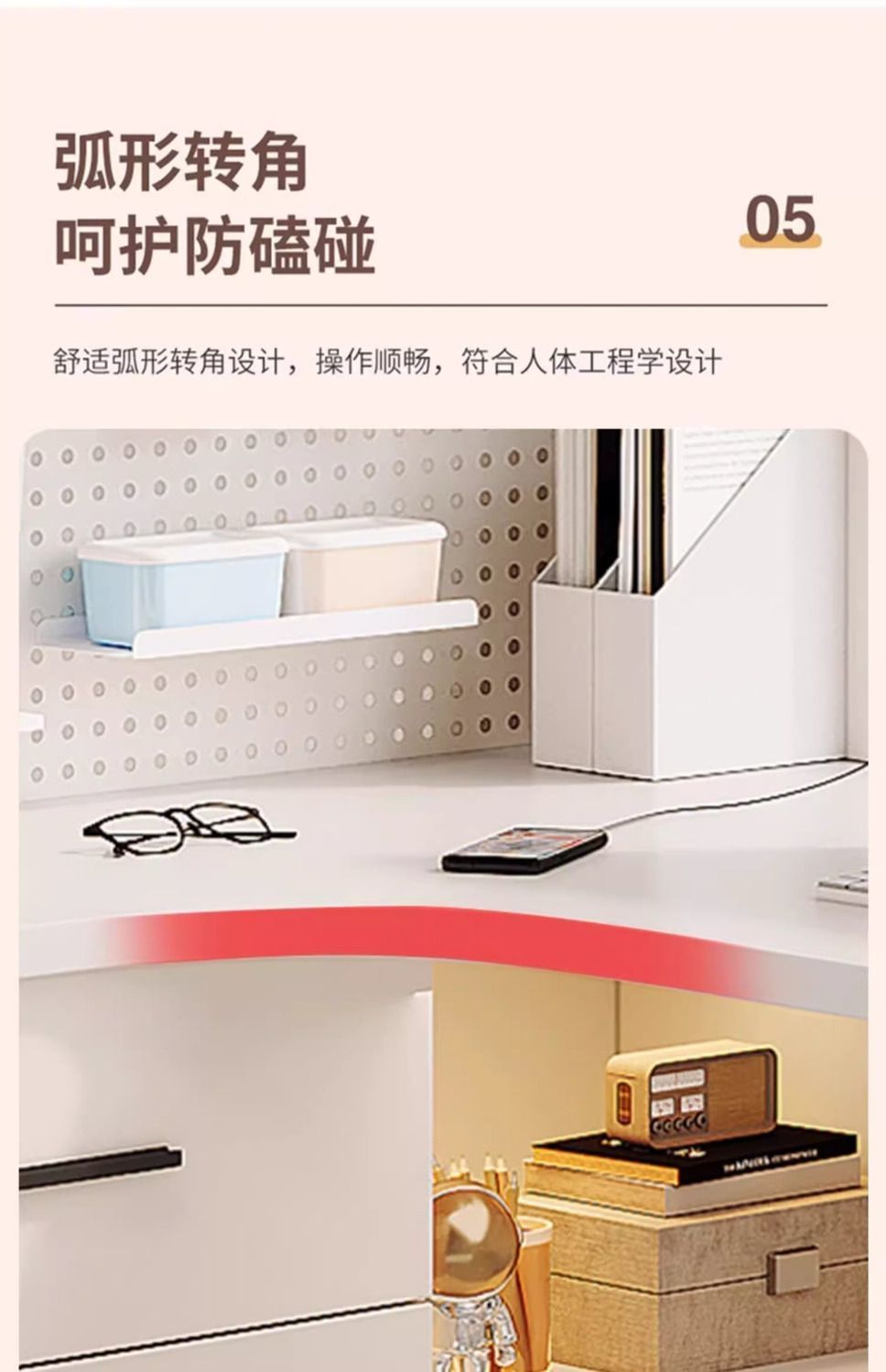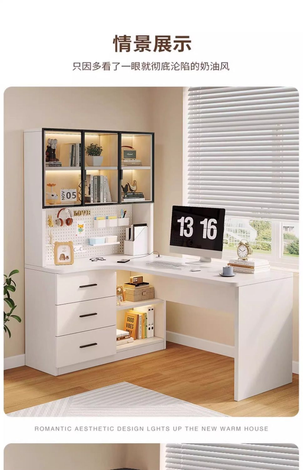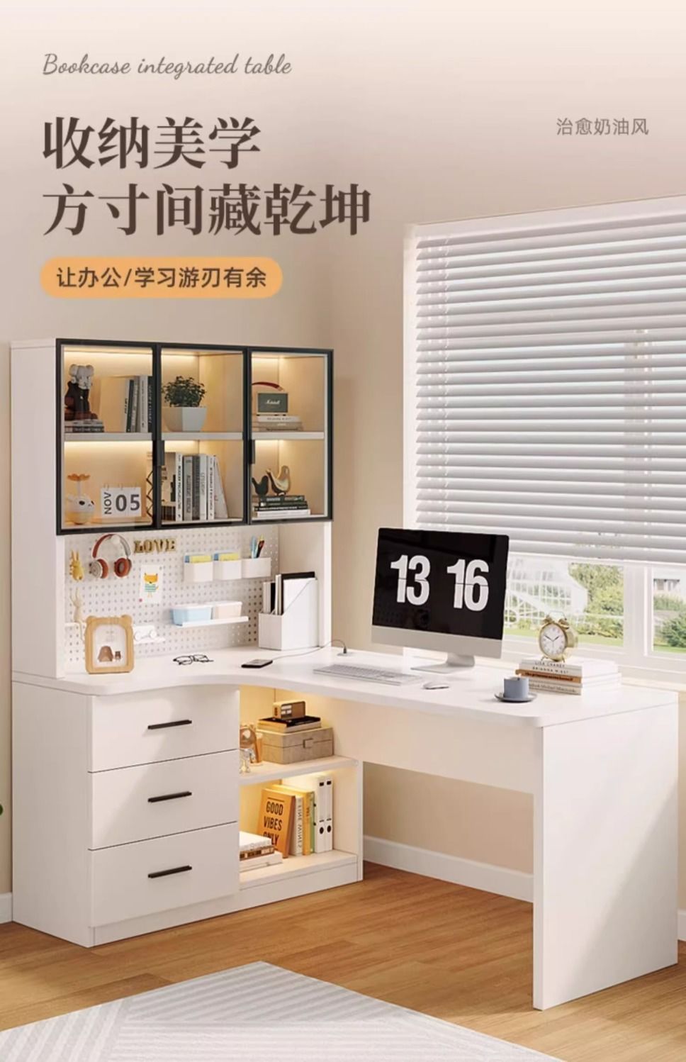 • 크림 화이트 홀 보드 코너 테이블-왼쪽에 책장