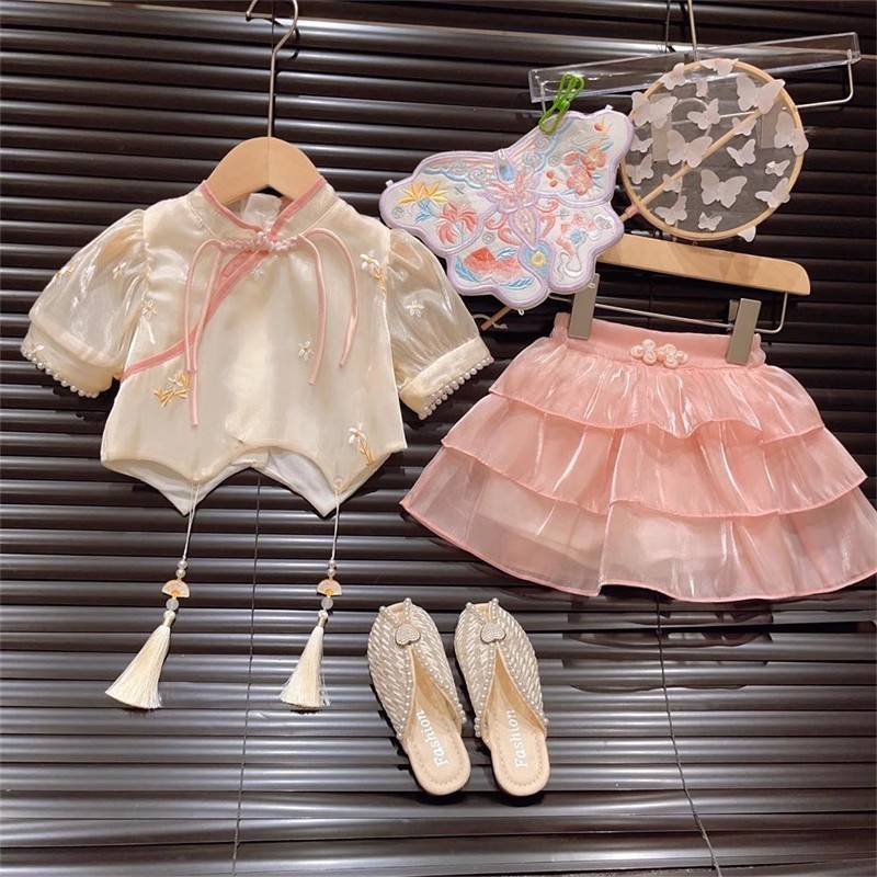 77289 새로운 중국 스타일 소녀의 여름 새로운 2024 레트로 버튼 반팔 셔츠 스커트 투피스 세트