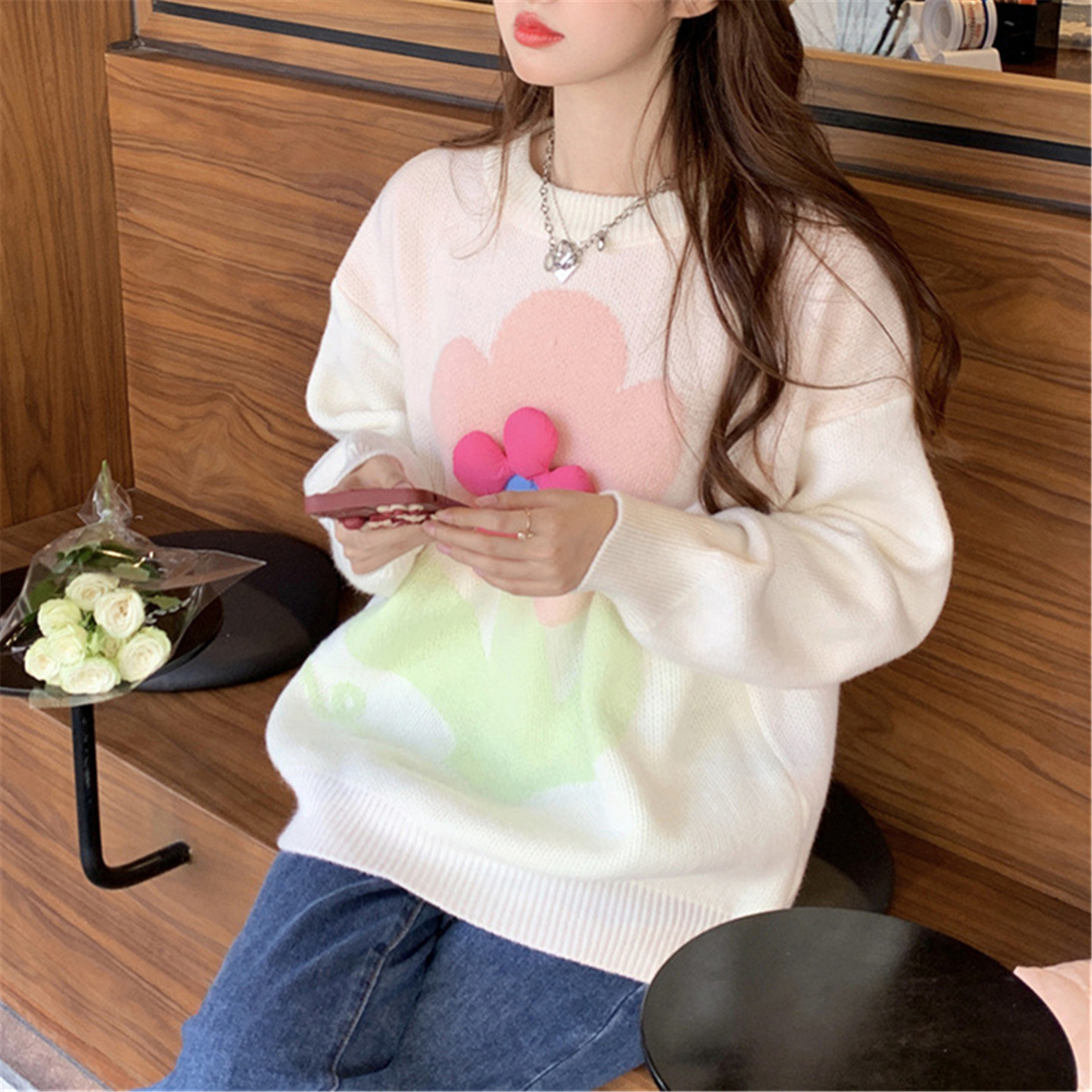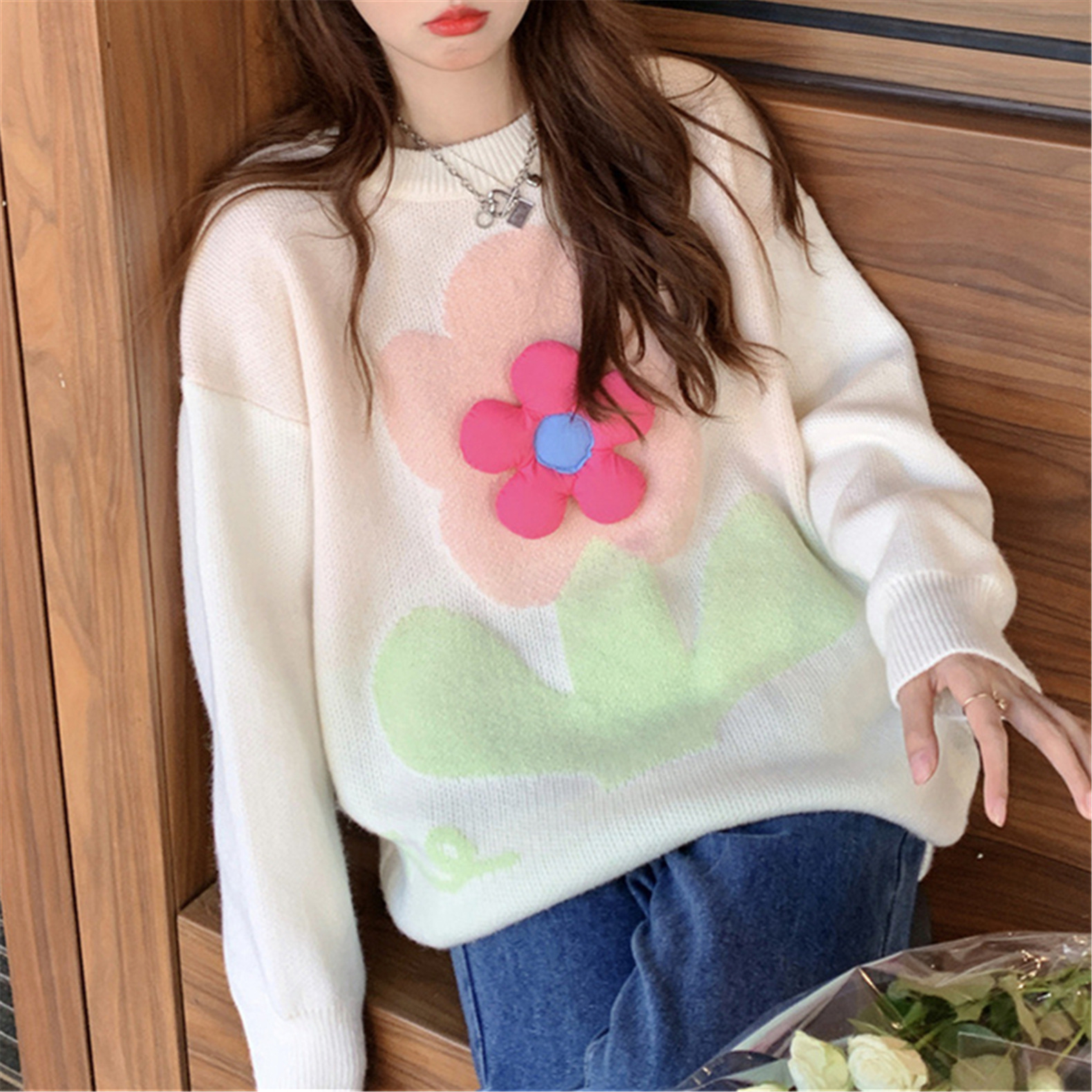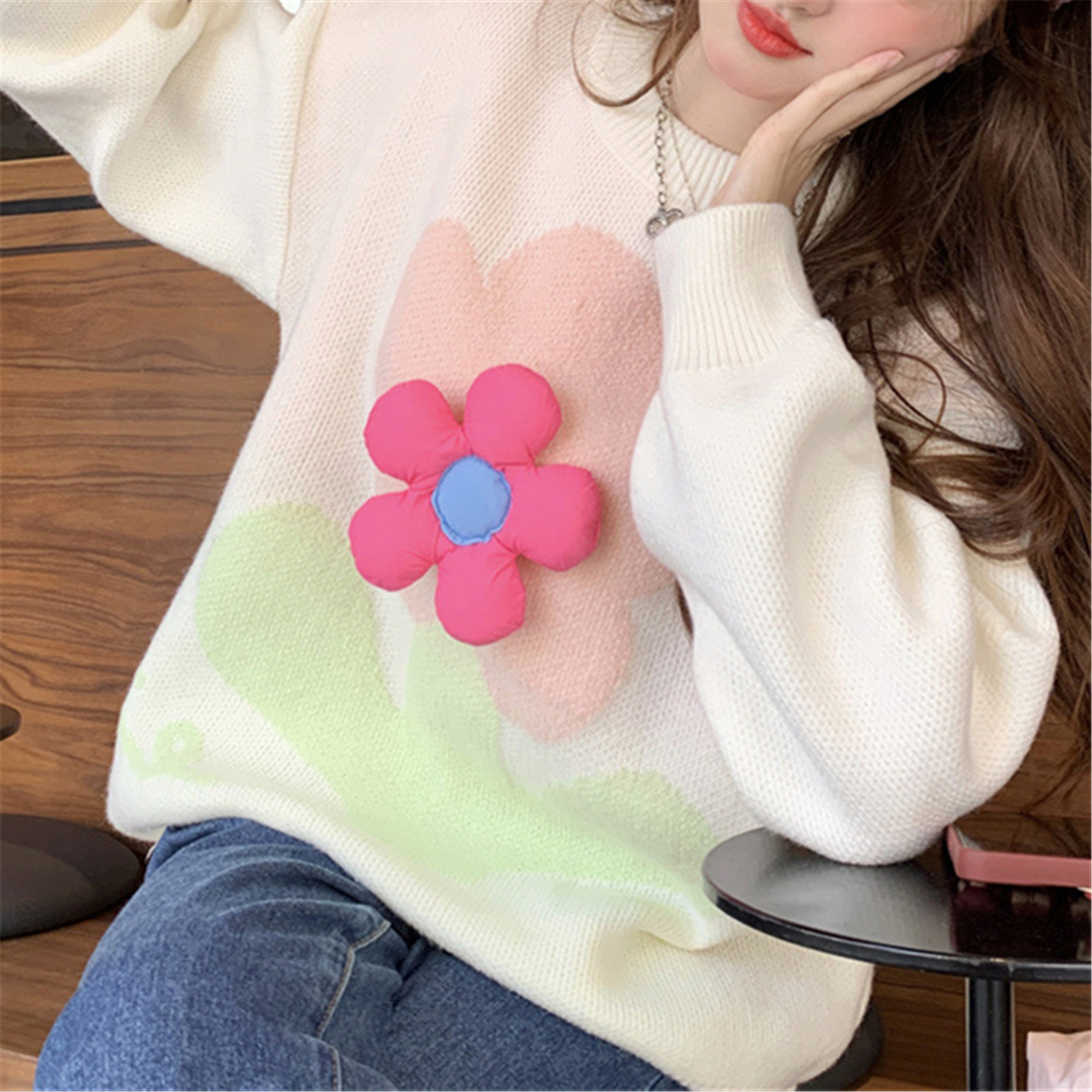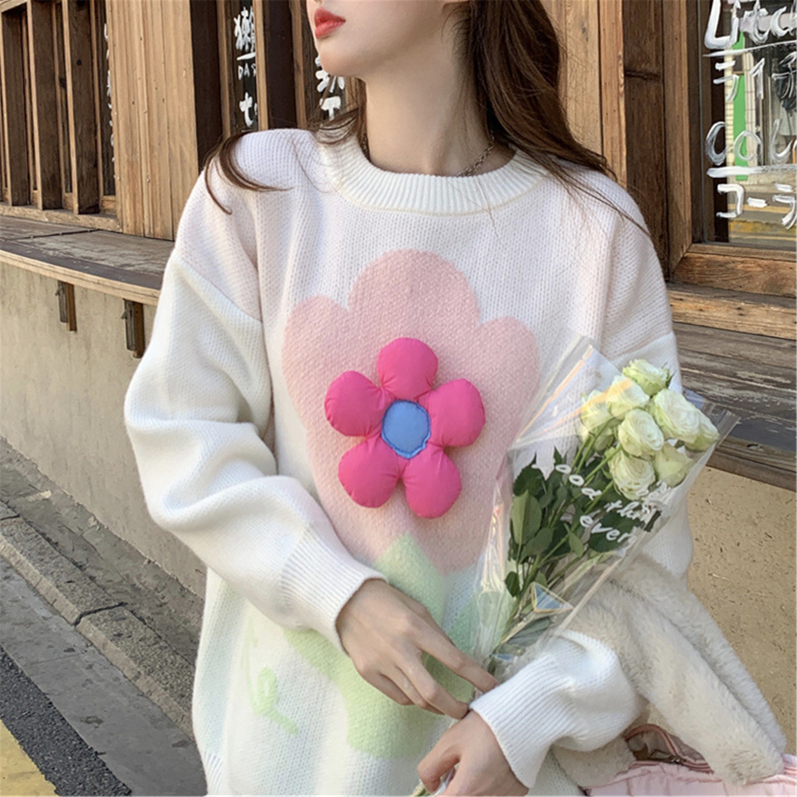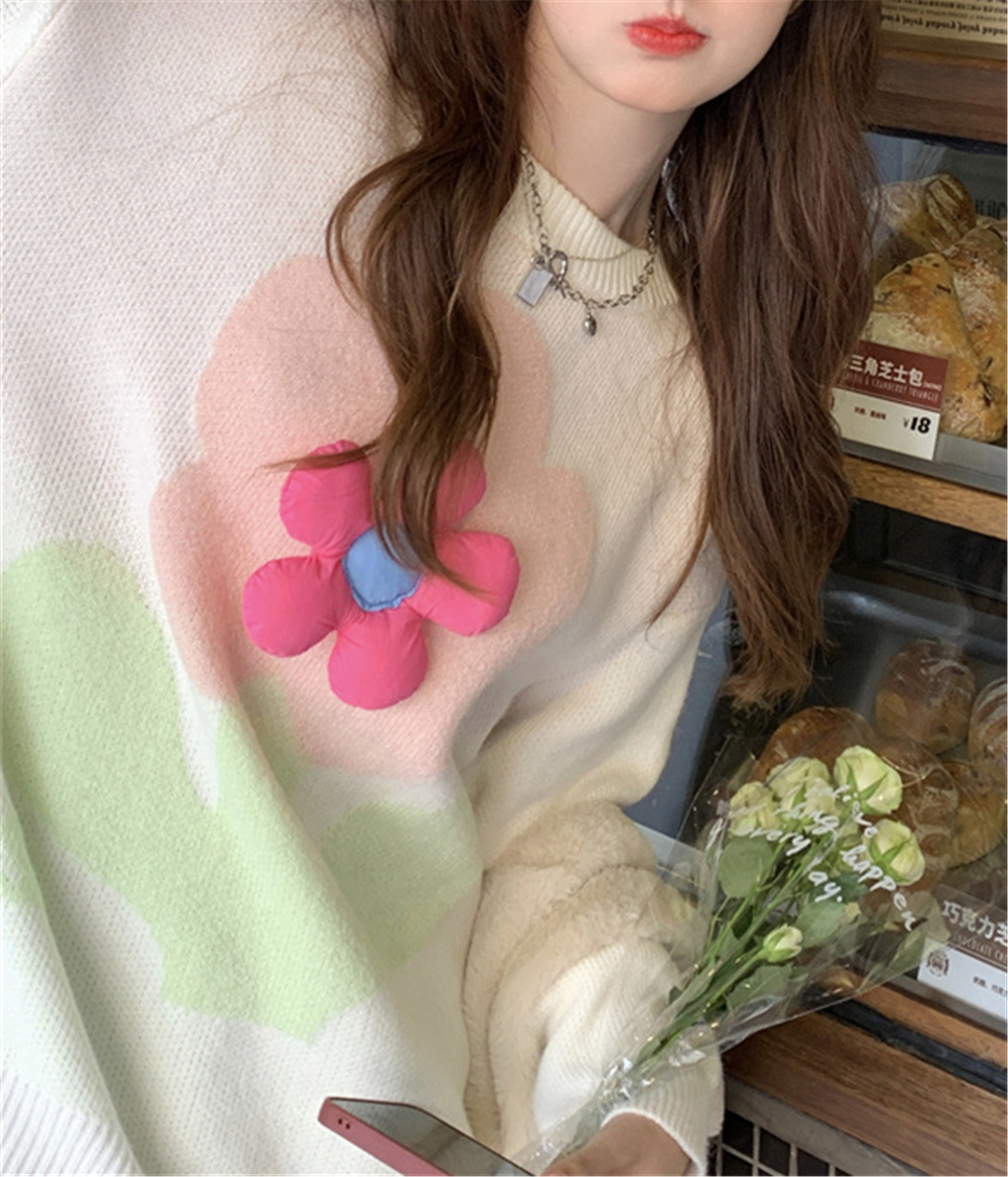 한국식 게으른 스타일 달콤한 연령 감소 부드러운 밀랍 스웨터 여성 가을, 겨울 새로운 입체 꽃 디자인 스웨터 풀오버