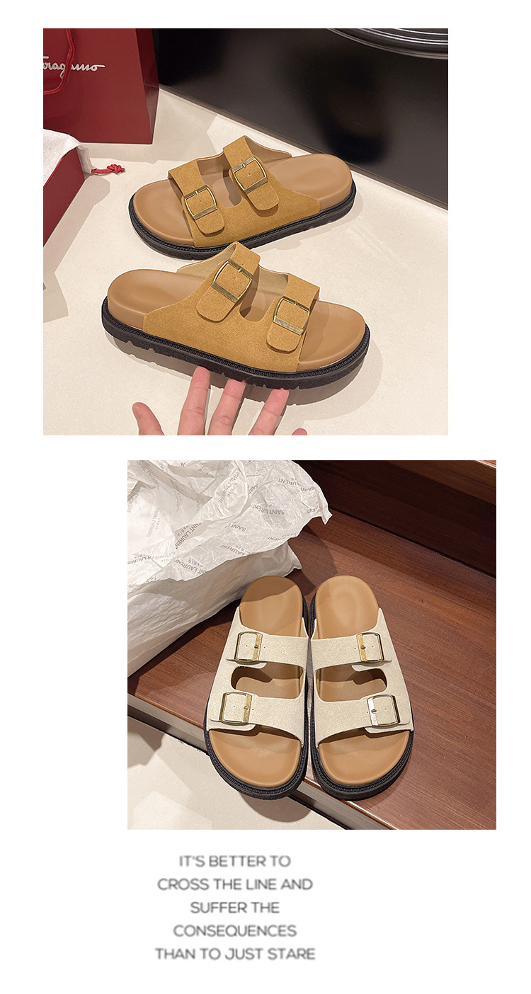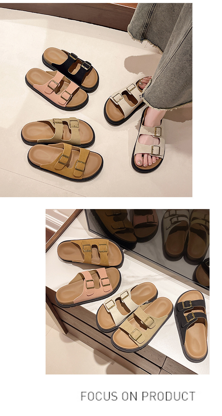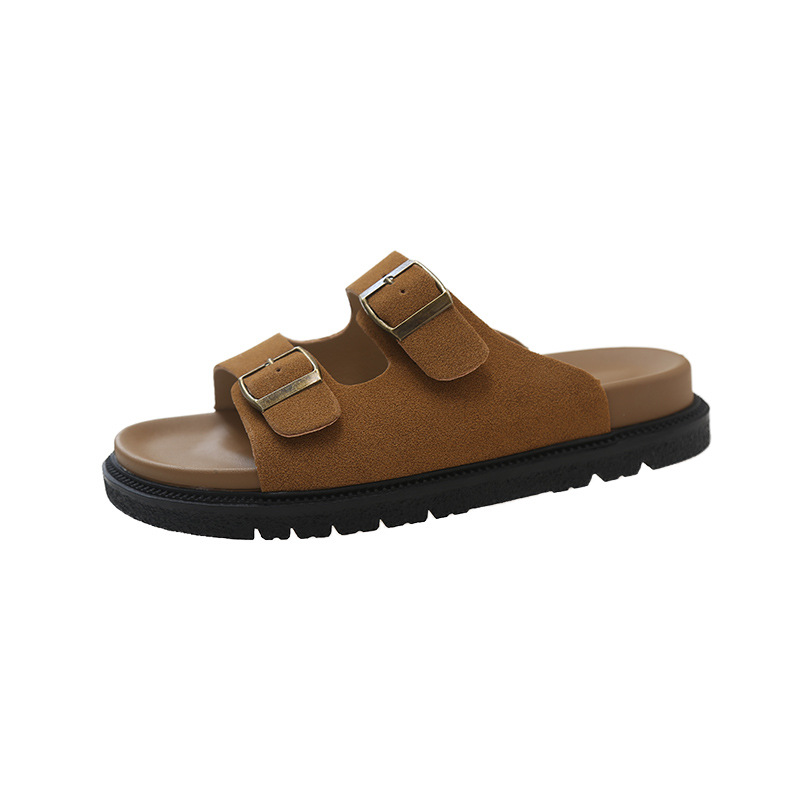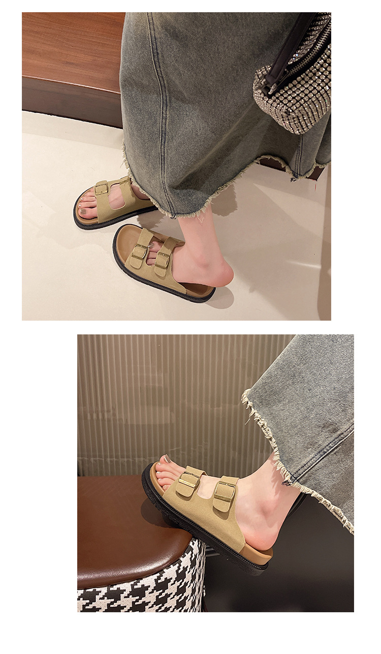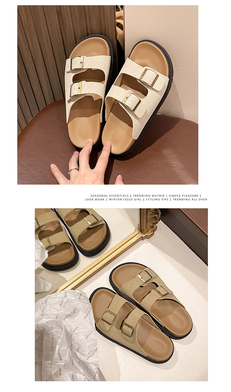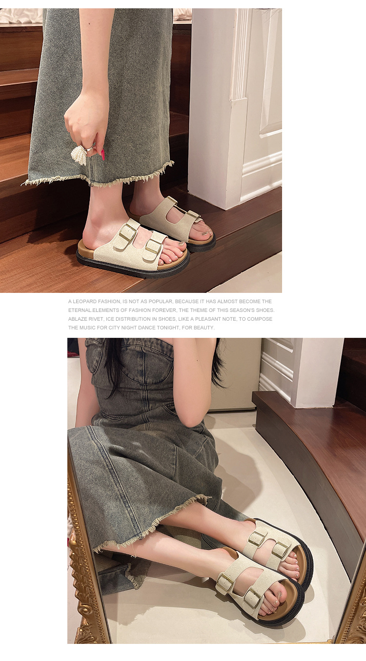 출생 신발 캐주얼 슬리퍼 여성의 2024 년 여름 새 출생 의상 두꺼운 바닥 벨트 버클 플랫 하프 슬리퍼