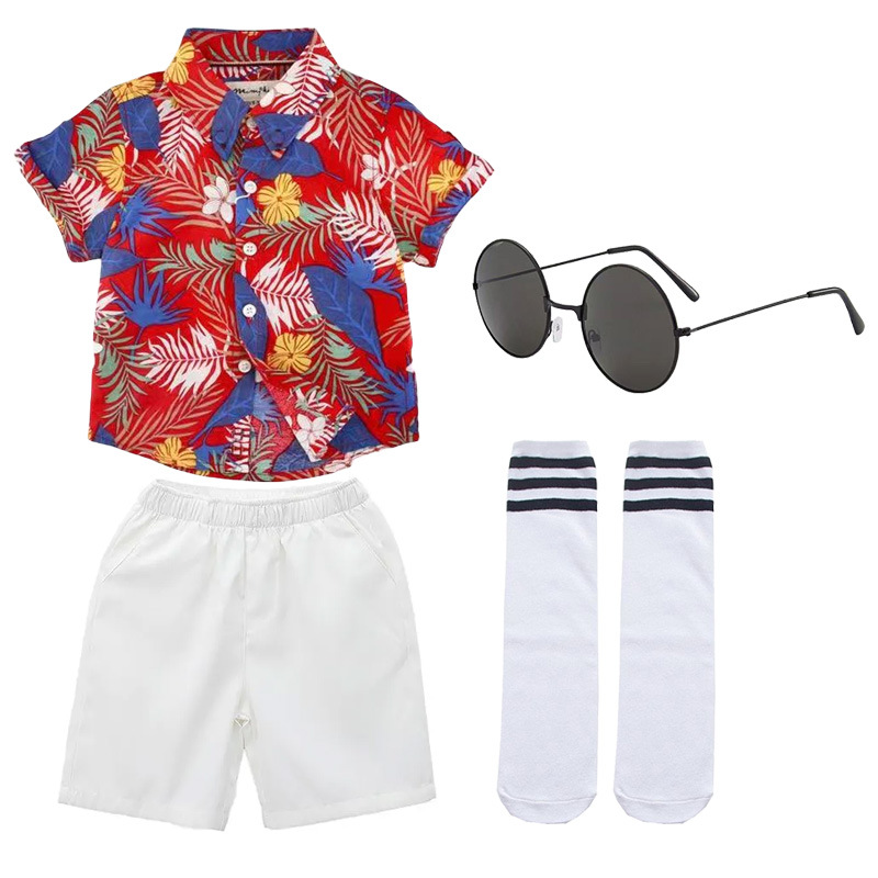 • 꽃 셔츠 반팔 (A) 흰색 반바지 밀짚 모자 선글라스 흰색 양말