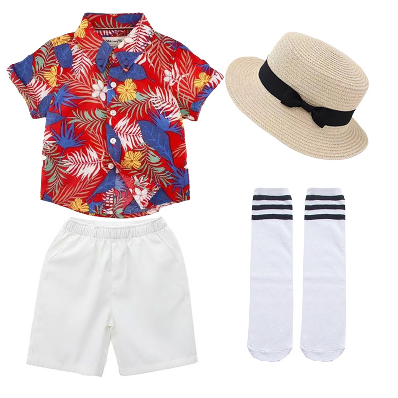 • 꽃 셔츠 반팔 (A) 흰색 반바지 밀짚 모자 흰색 양말
