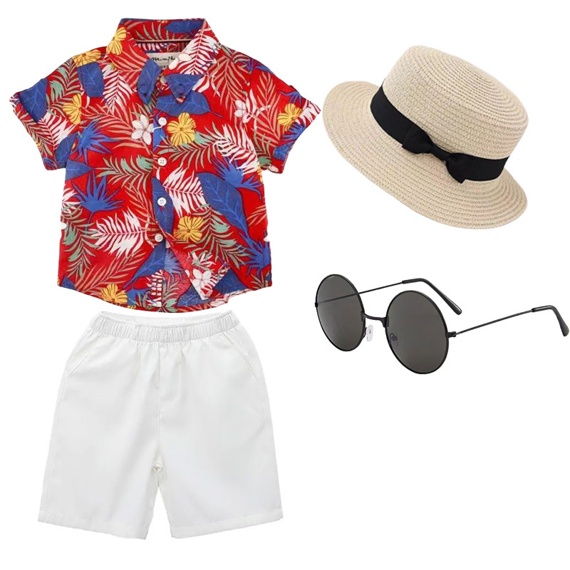 • 꽃 셔츠 반팔 (A) 흰색 반바지 밀짚 모자 선글라스