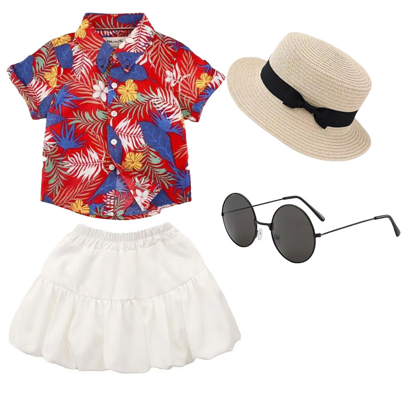• 꽃 셔츠 짧은 소매 (A) 흰색 주름 치마 밀짚 모자 선글라스