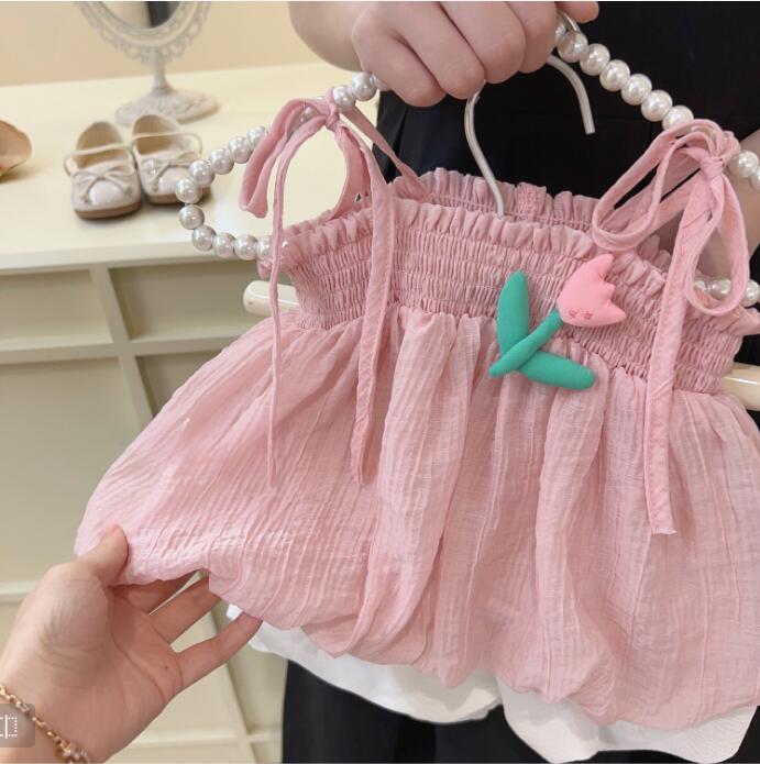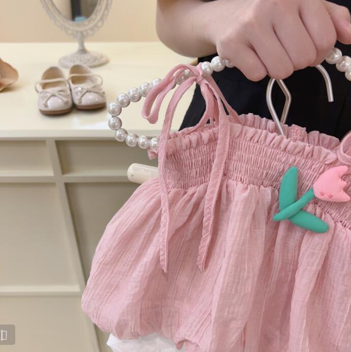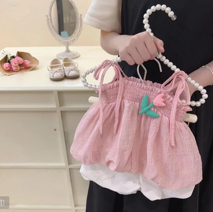 소녀 세트 2024 여름 새 스타일 아기 소녀 슬링 인형 셔츠 세련 된 아기 소녀 외부 착용 반바지 투피스 세트스토어 가기
