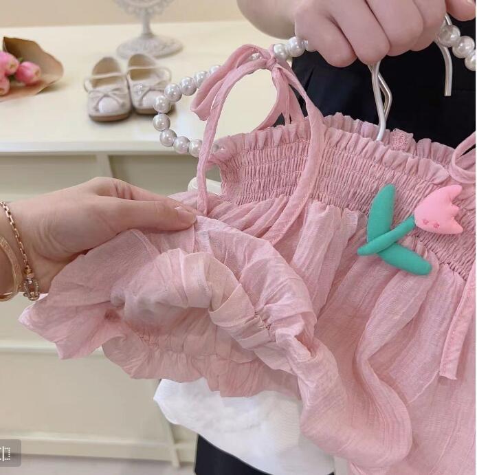 소녀 세트 2024 여름 새 스타일 아기 소녀 슬링 인형 셔츠 세련 된 아기 소녀 외부 착용 반바지 투피스 세트