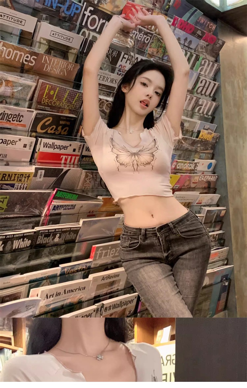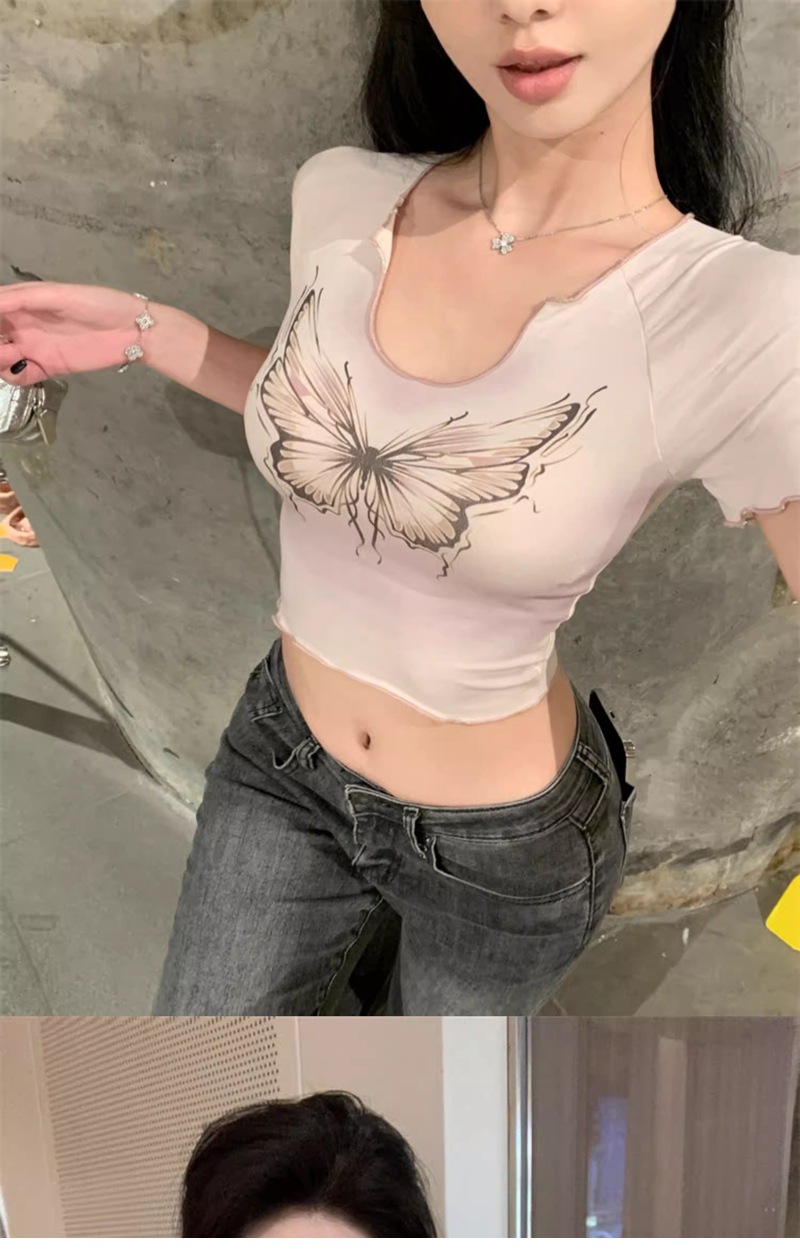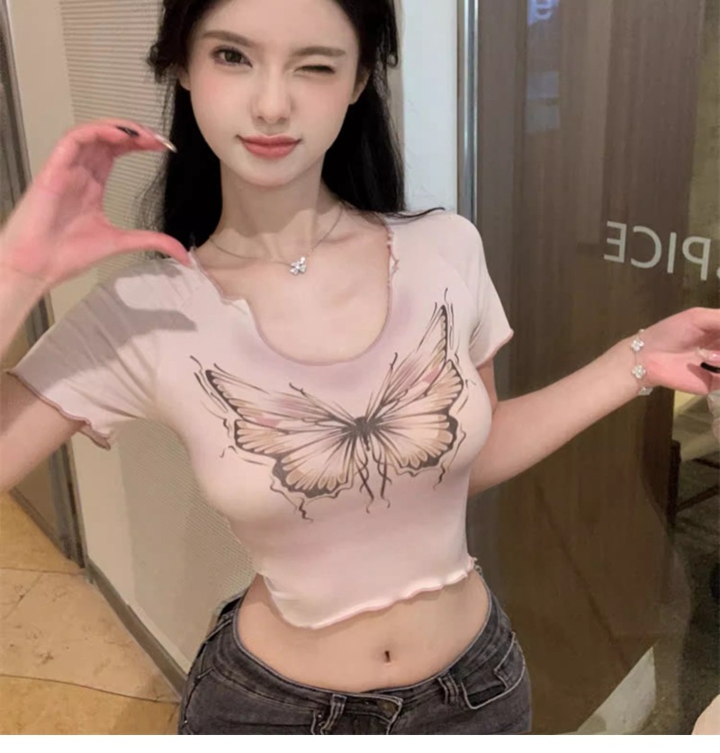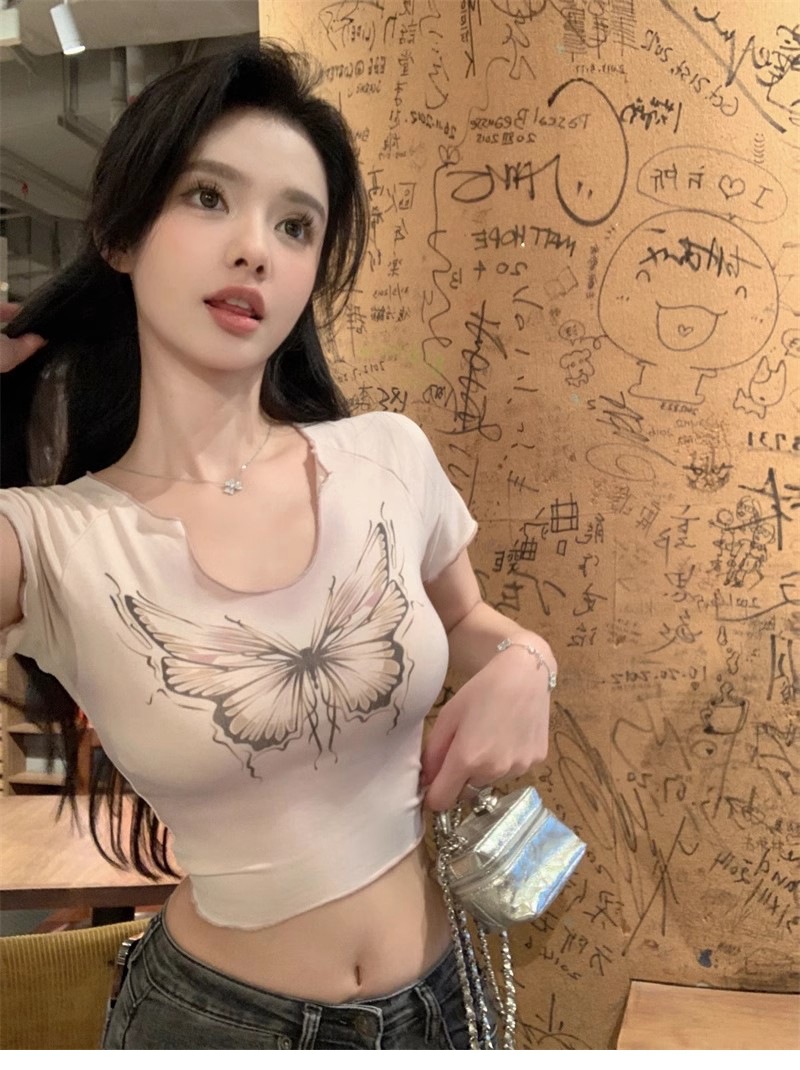 헤일로 나비 반팔 티셔츠 여성 디자인 센스 니쉬 여름 순수 스위트 스파이스 소녀 섹시한 슬림 U-넥 쇼트 탑스토어 가기