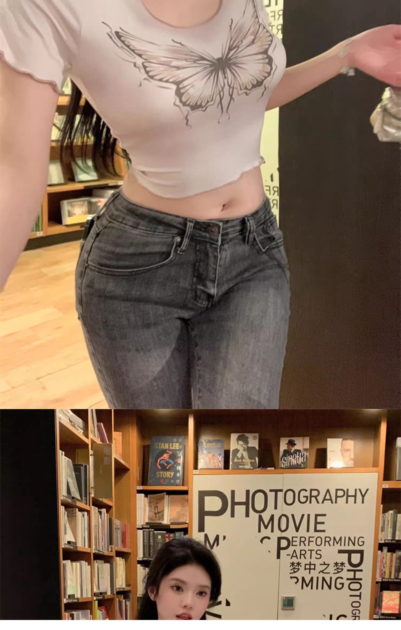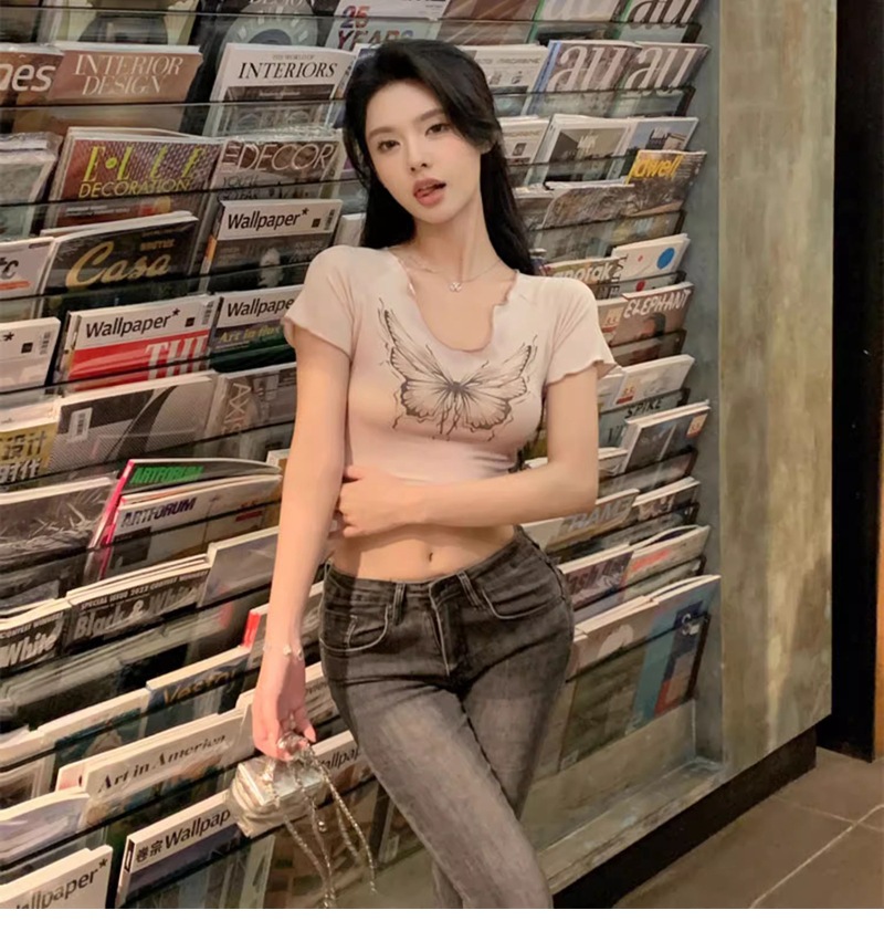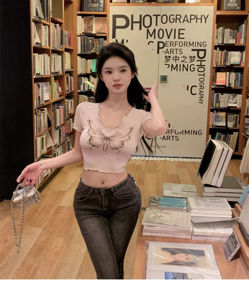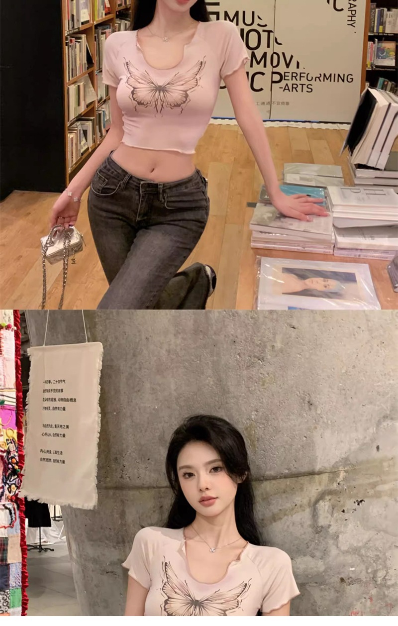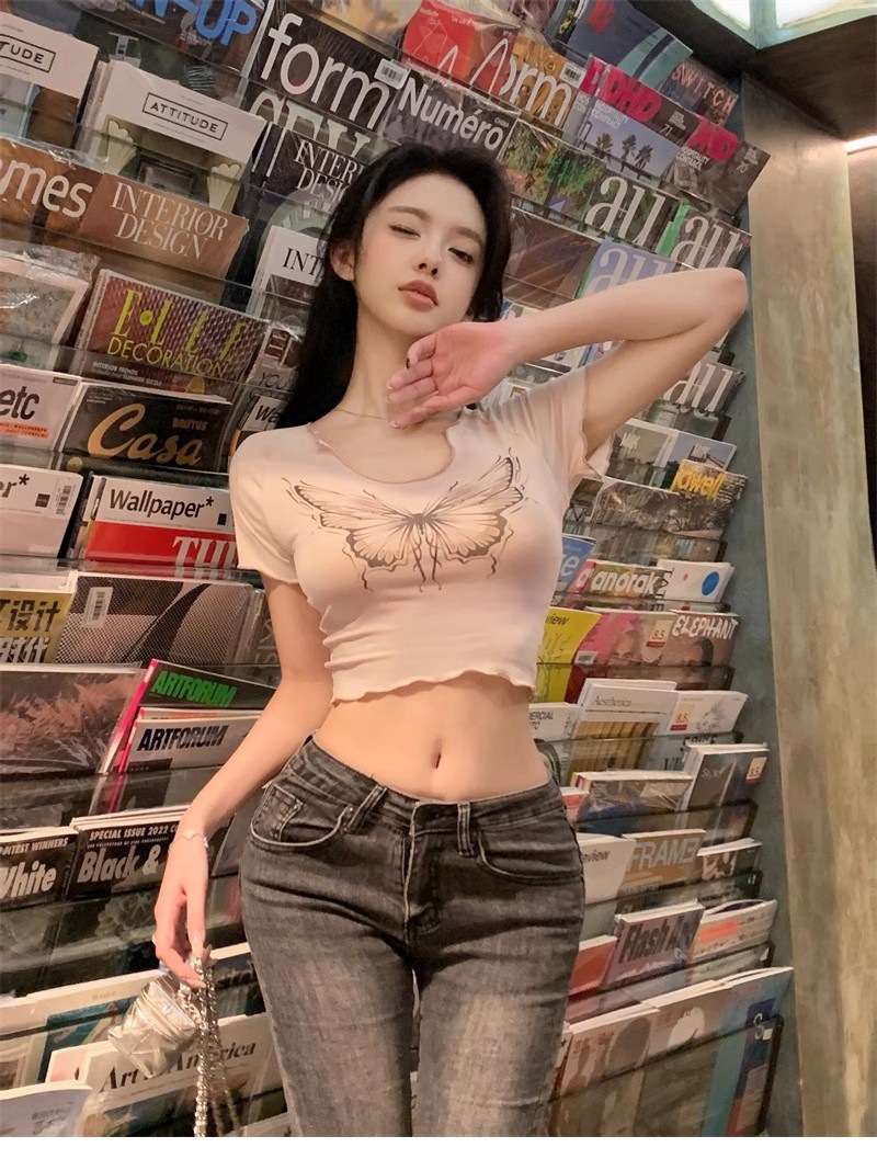 헤일로 나비 반팔 티셔츠 여성 디자인 센스 니쉬 여름 순수 스위트 스파이스 소녀 섹시한 슬림 U-넥 쇼트 탑스토어 가기