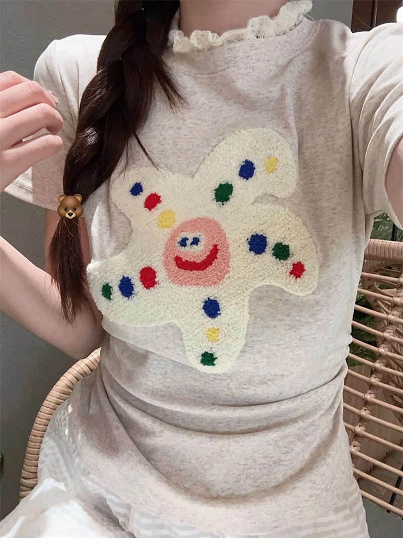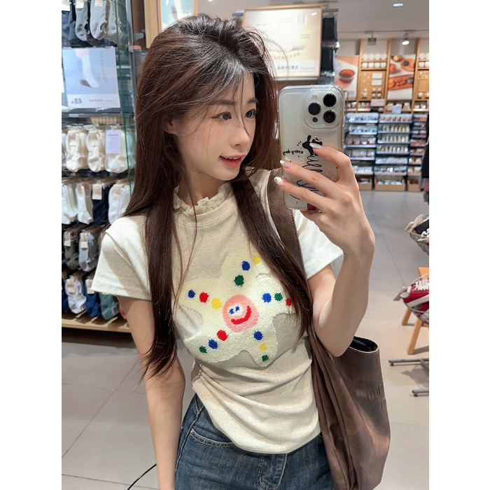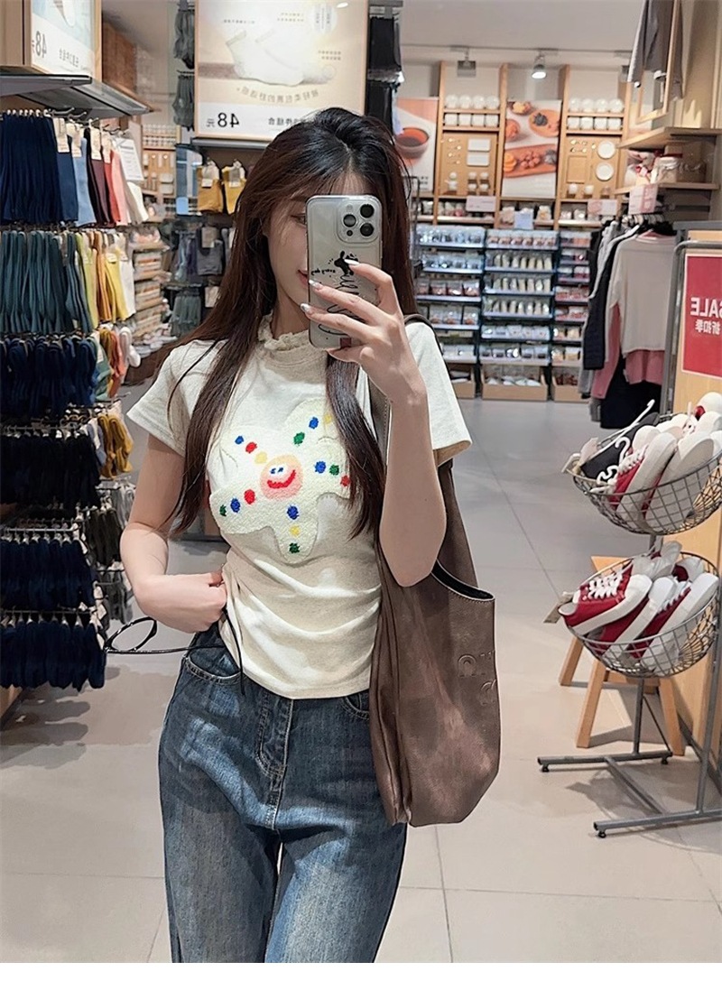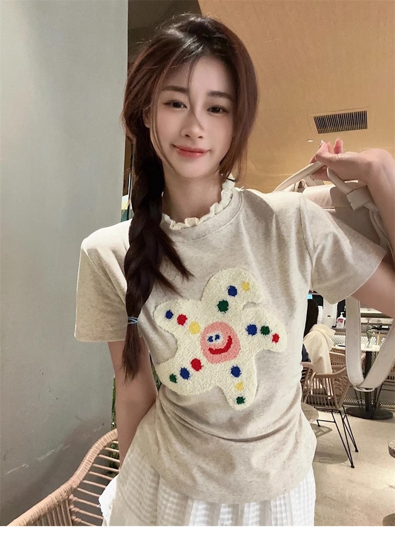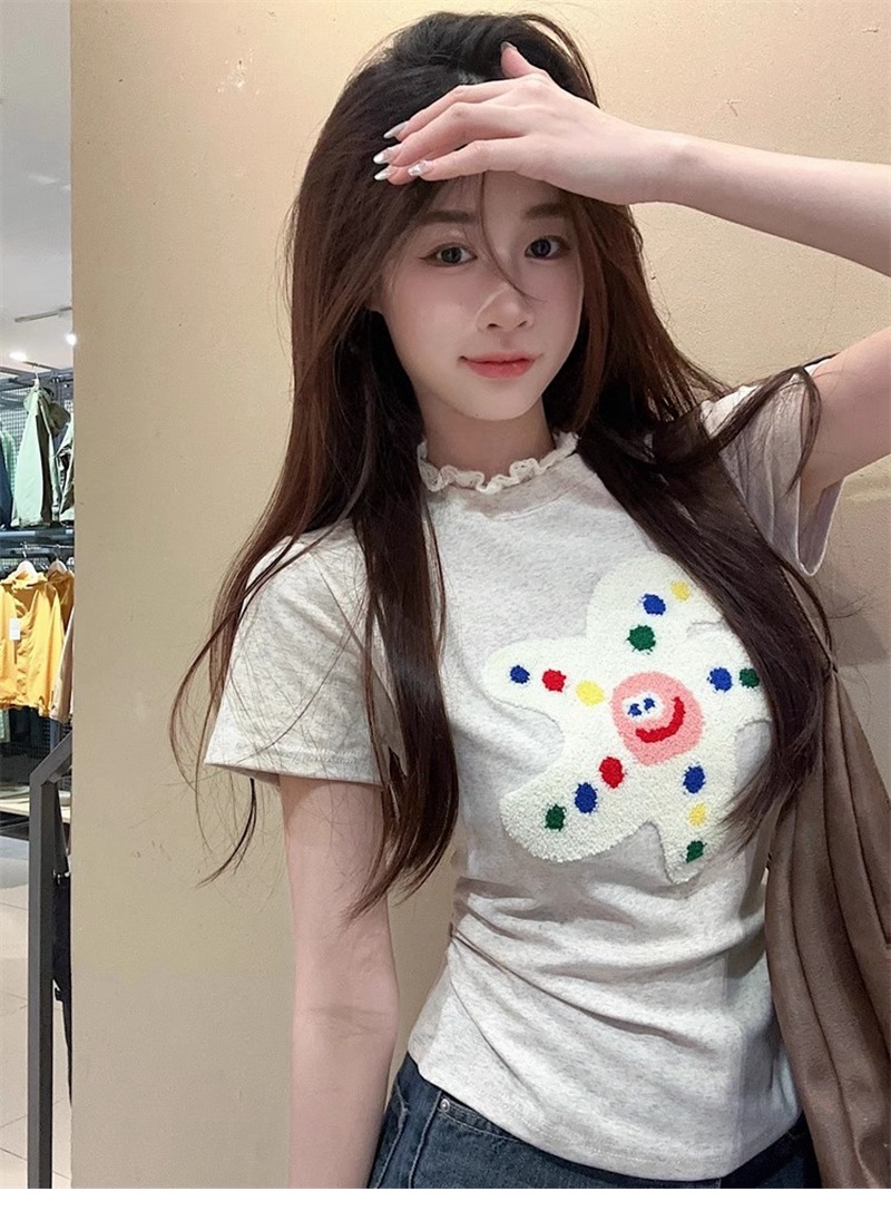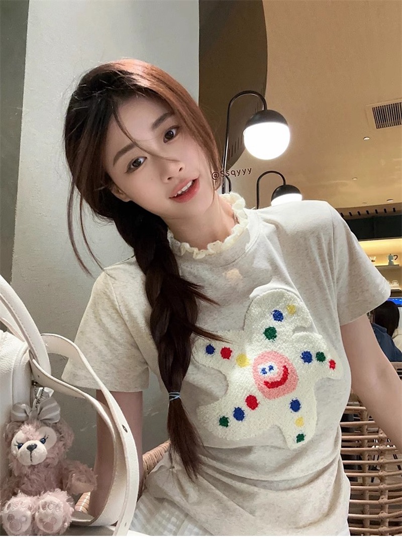 귀여운 잠금 만화 스타 자수 어깨 반팔 티셔츠 여성용 퓨어 코튼 스위트 소녀 쇼트 탑 여성용 여름 뉴스토어 가기