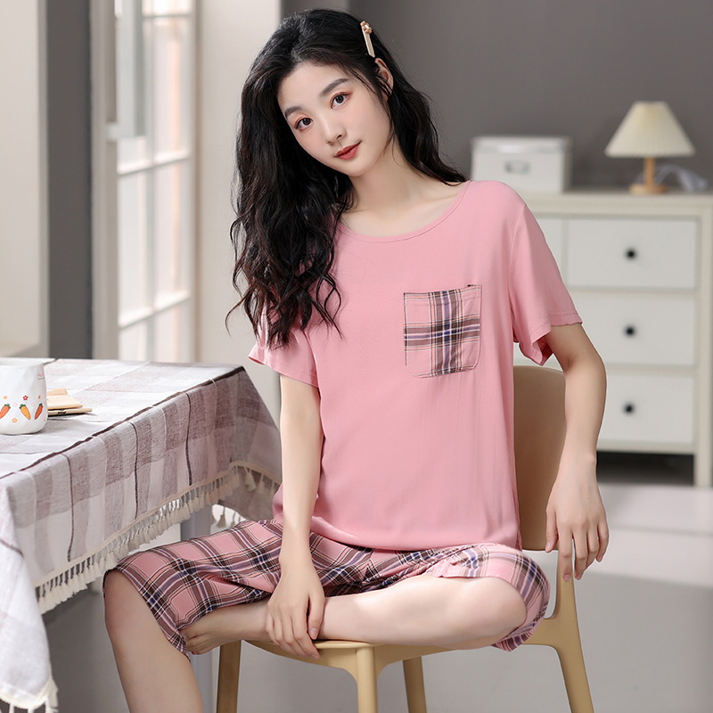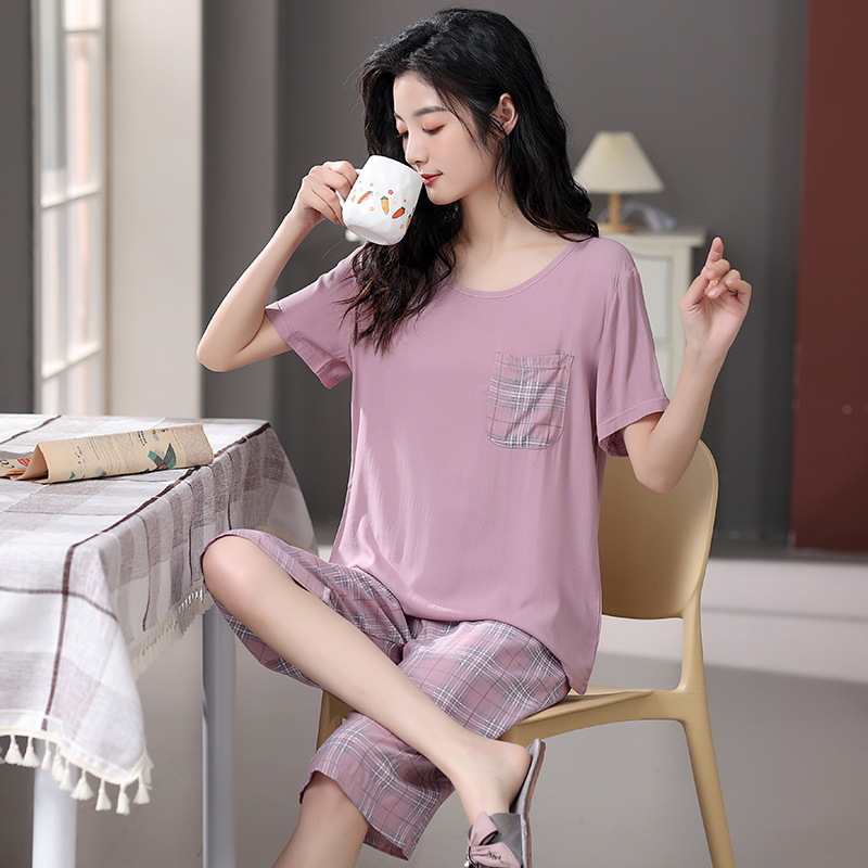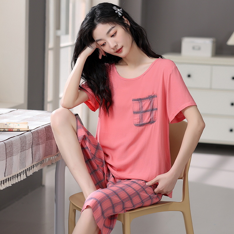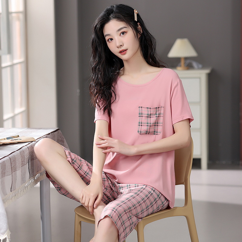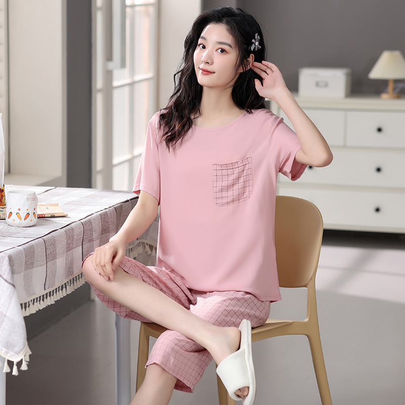 엄마 여름 잠옷 면 얇은 반팔 카프리 바지 중년 여성 홈 의류 여름 겉옷 세트스토어 가기