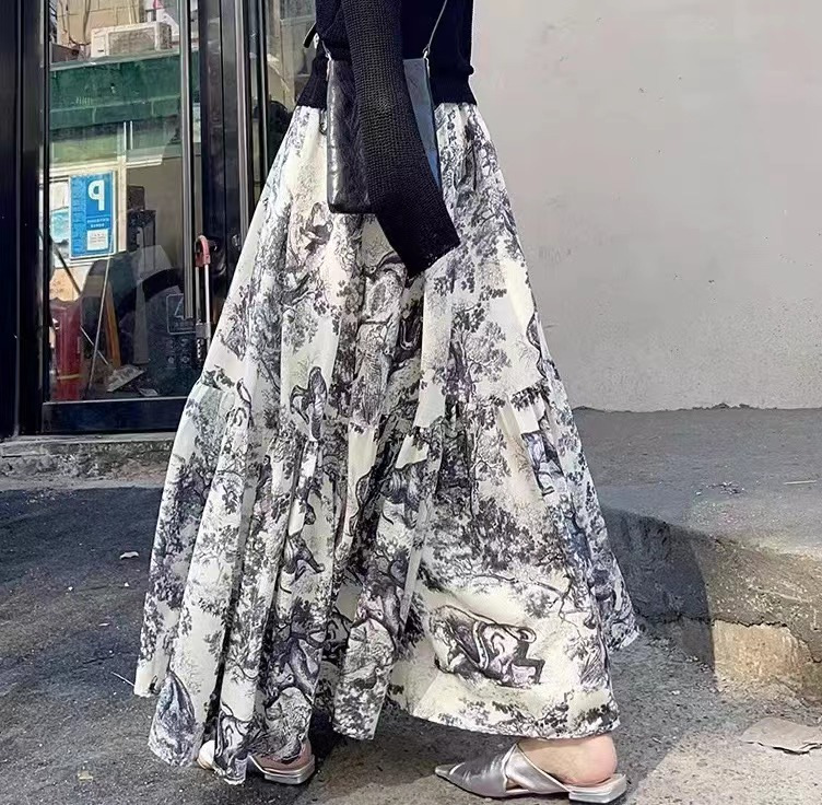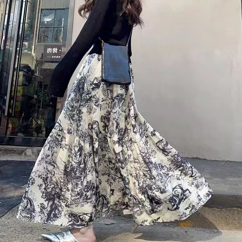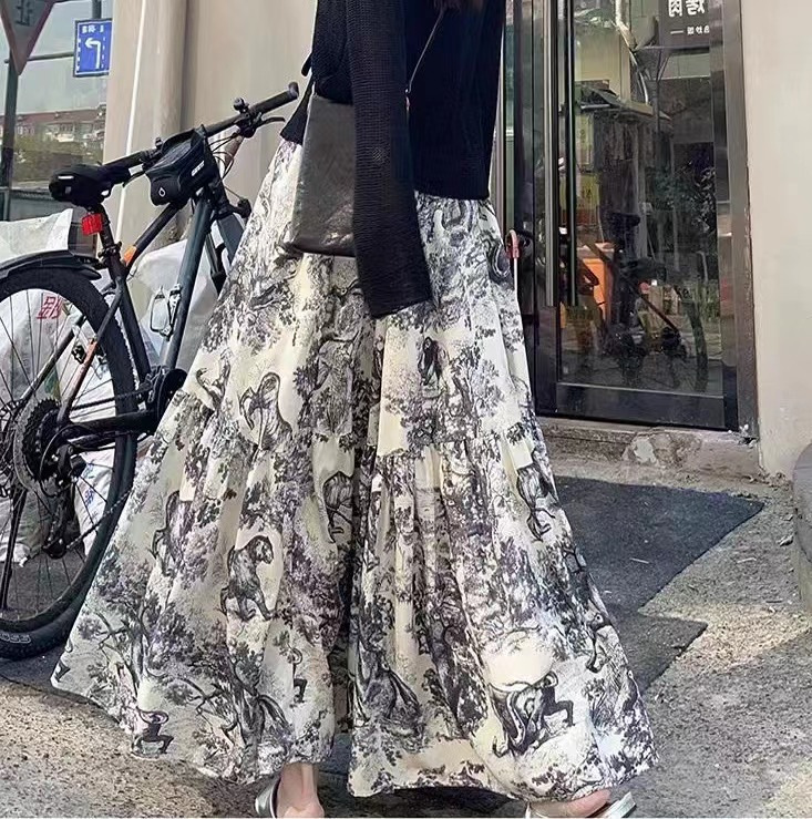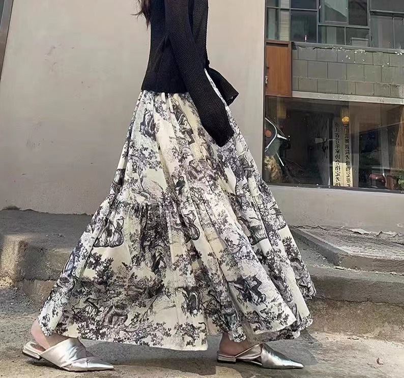 우아한 클래식 슬림 인쇄 바느질 높은 허리 섬세한 치마 먼지 질감 레트로 허리 A 라인 스커트 긴 치마
