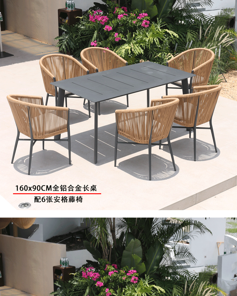 • 160x90 알루미늄 롱테이블 + 의자 6개 (베이지)