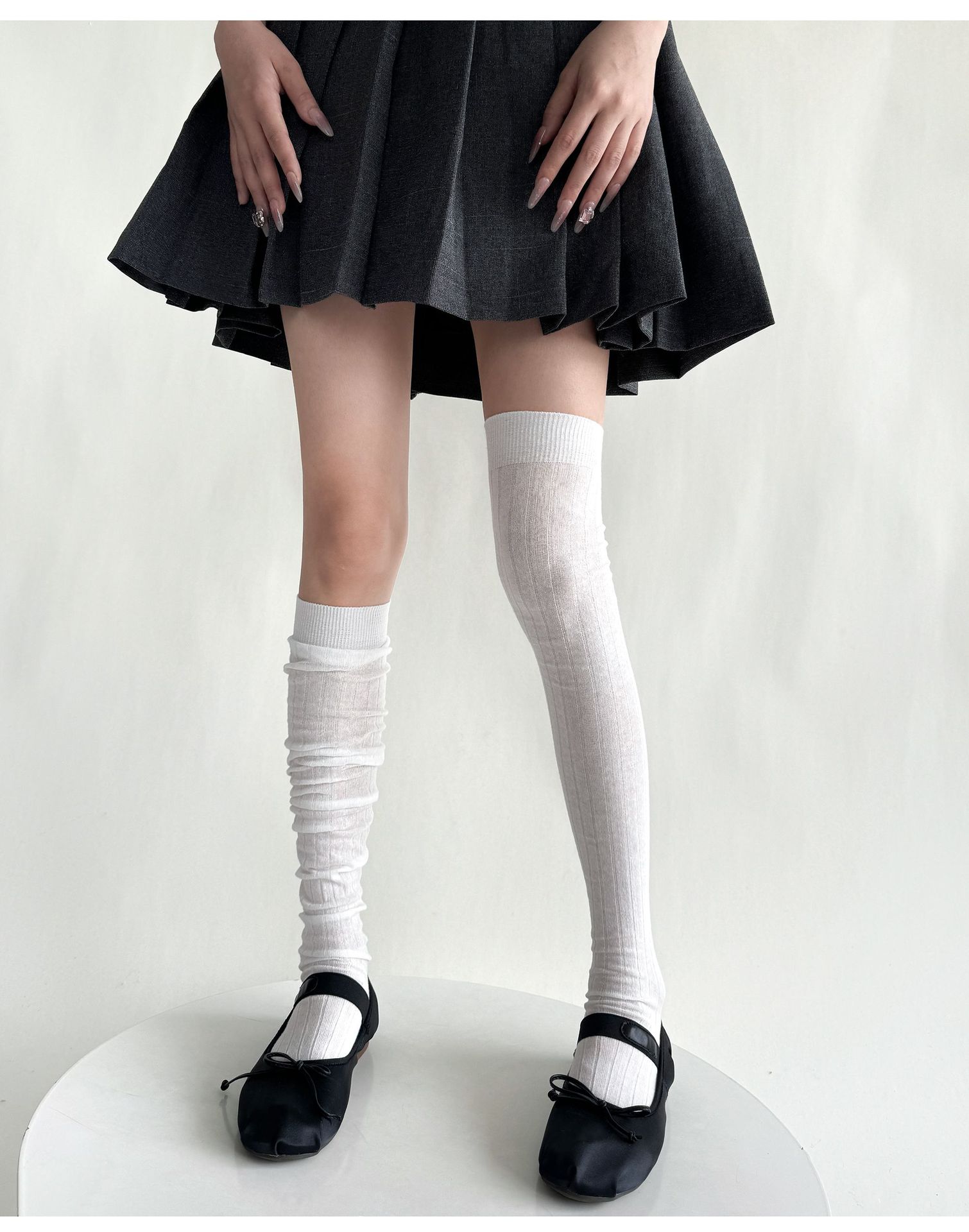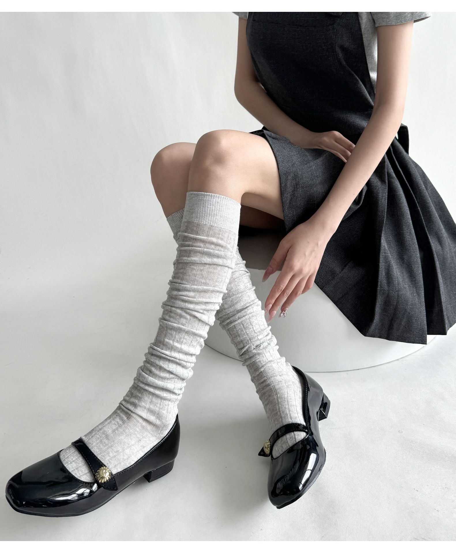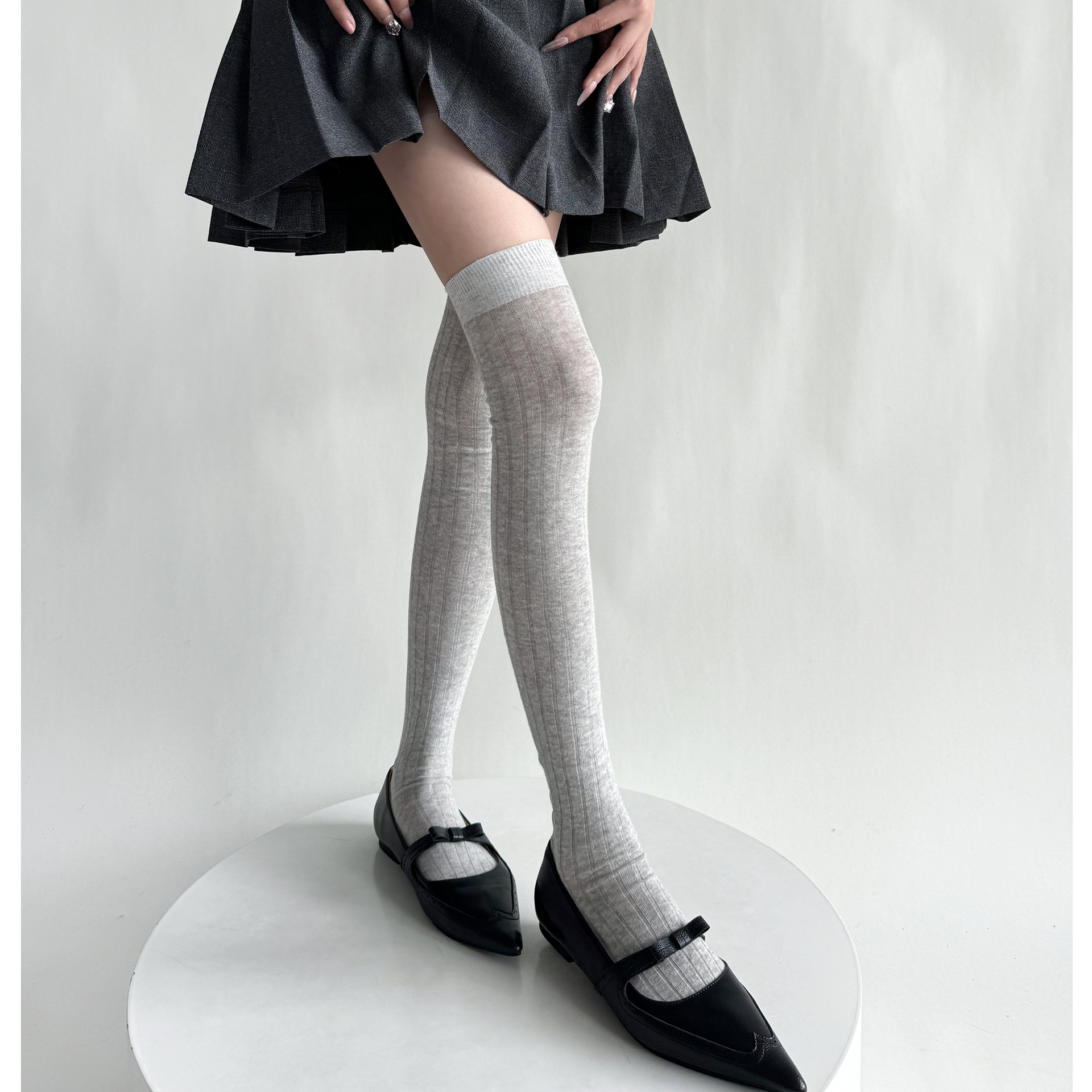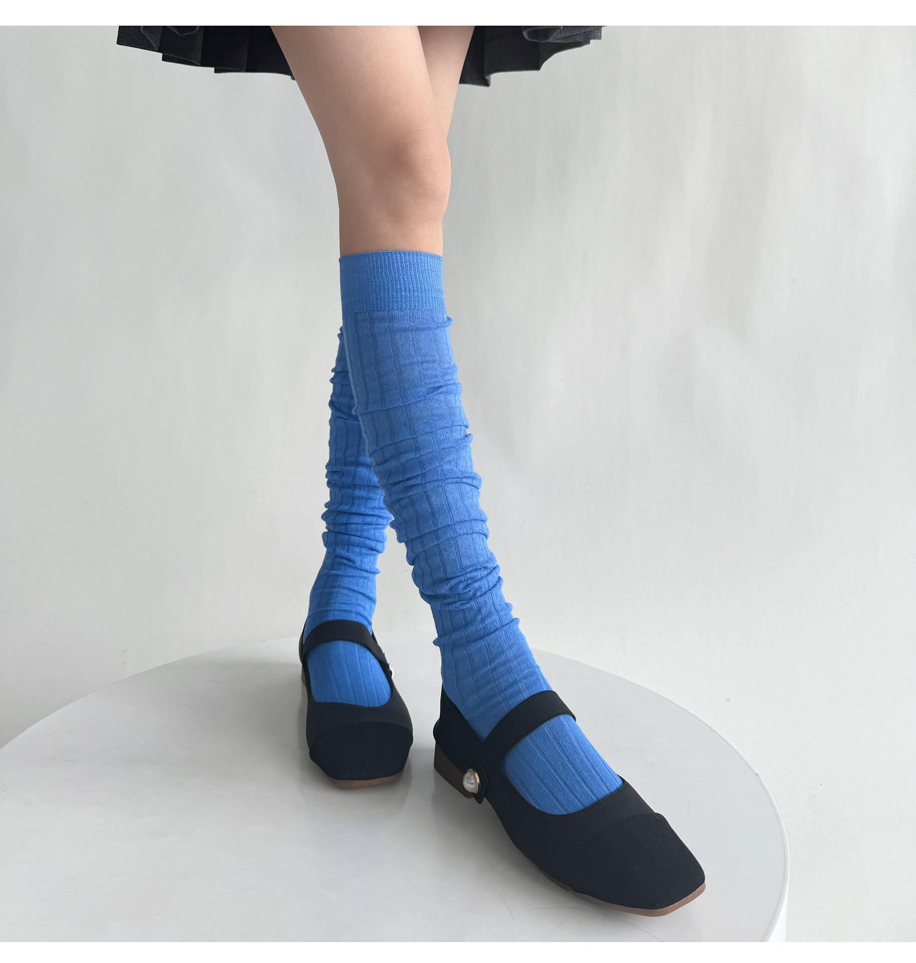 봄과 여름 얇은 면 마이크로 투명 수직 무릎 양말 여성 여름 한국식 슬리밍 높은 양말 단색 간단한 송아지 양말