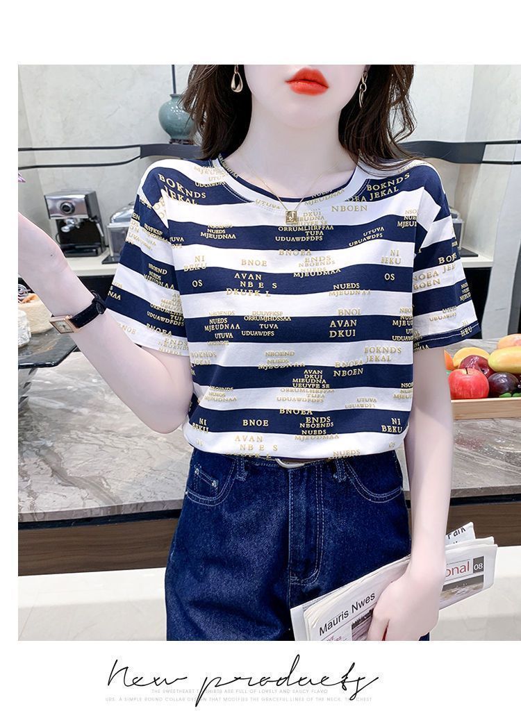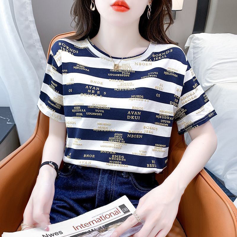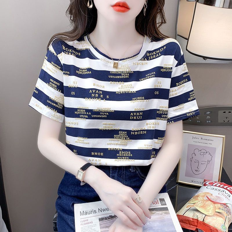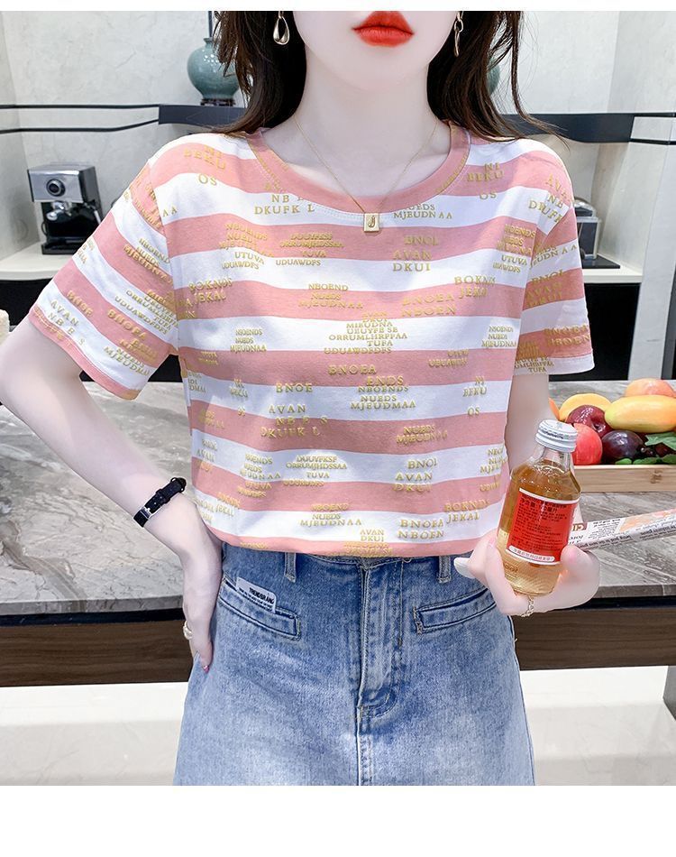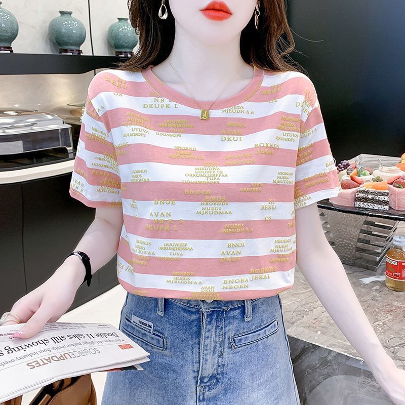 편지 인쇄 줄무늬 반팔 티셔츠 여자 2024 년 여름 새로운 한국식 올매치 라운드 넥 루즈 핫 탑 트렌디