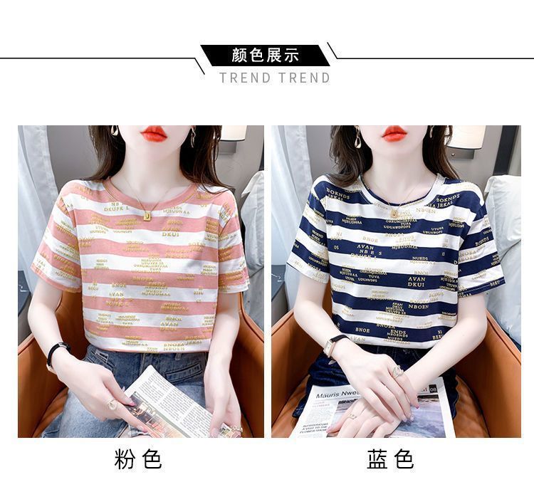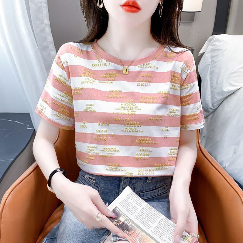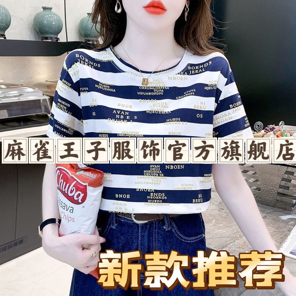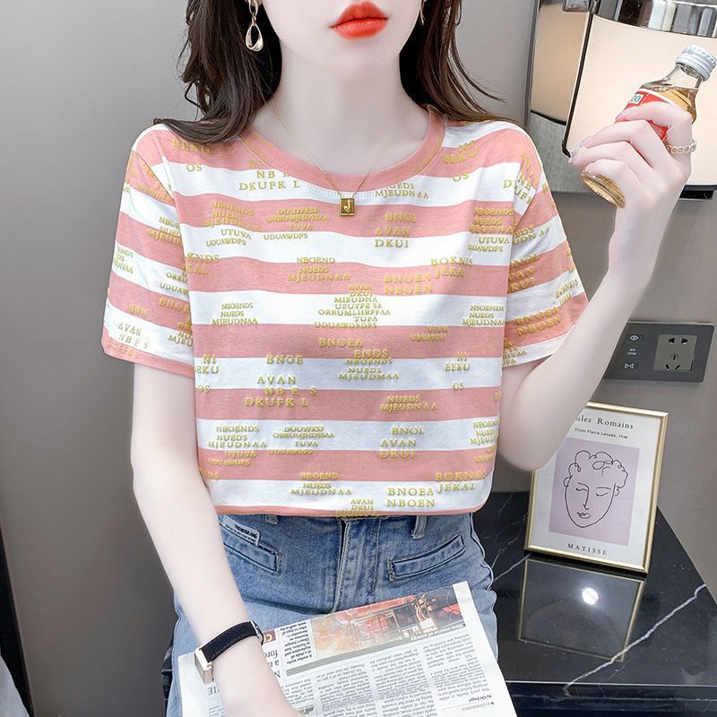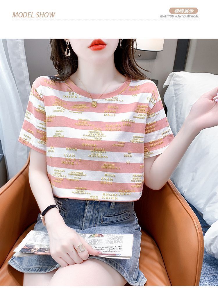편지 인쇄 줄무늬 반팔 티셔츠 여자 2024 년 여름 새로운 한국식 올매치 라운드 넥 루즈 핫 탑 트렌디