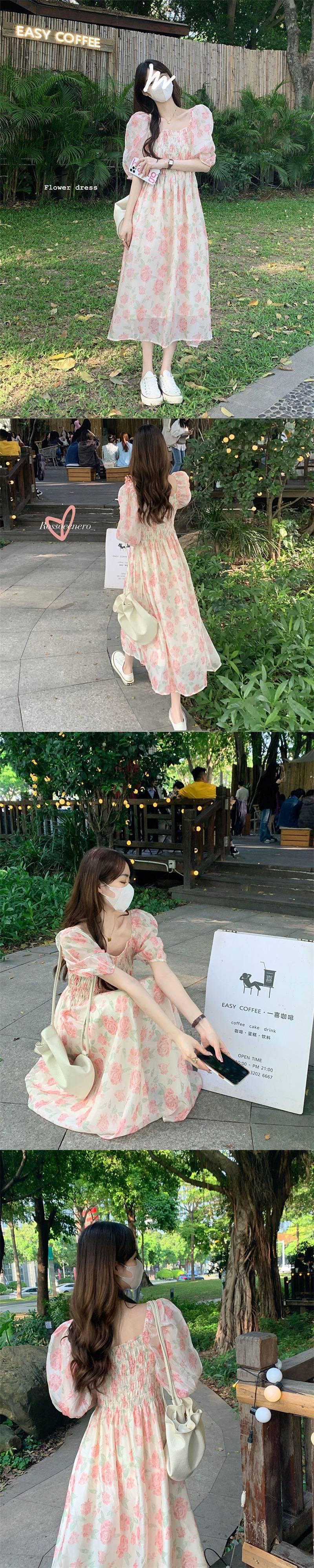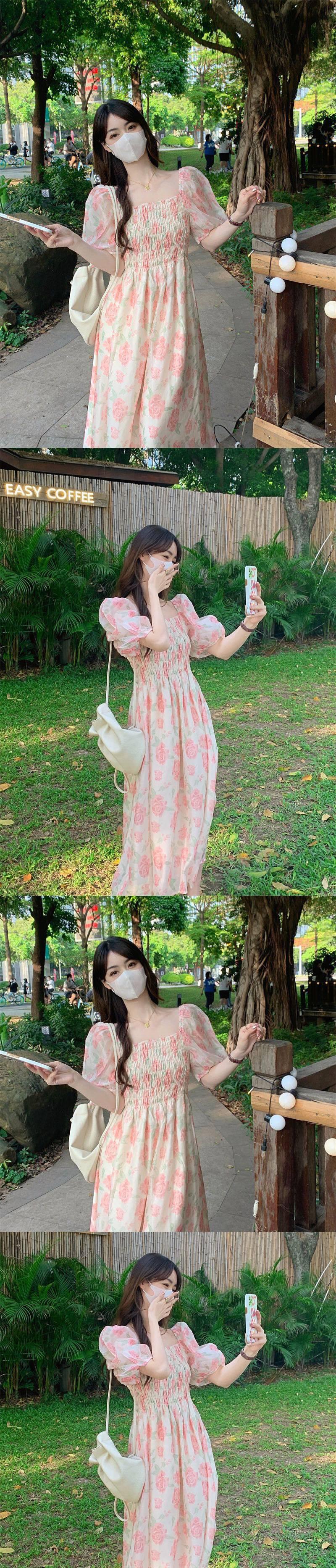 꽃 원피스 2024 여름 새로운 주름 빈티지 인쇄 부드러운 꽉 허리 슈퍼 페어리 슬리밍 중간 길이 스커트스토어 가기
