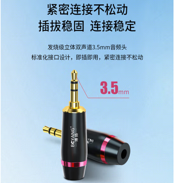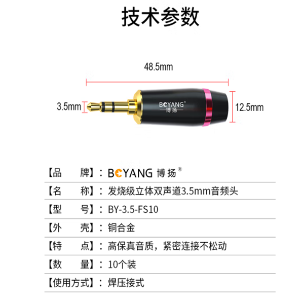 博扬 发烧级立体双声道3.5mm音频头 镀金小三芯双芯咪线3.5头 平衡插头10个装 BY-3.5-FS10*1 合格证
