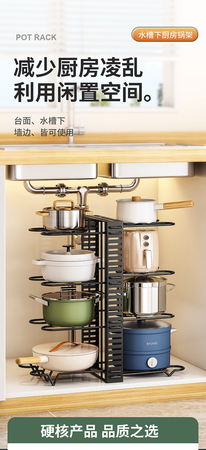 냄비 저장 랙 주방 냄비 랙 조정 가능한 랙 낮은 싱크 스토리지 랙 다층 가정용 캐비닛 내부 레이어 랙