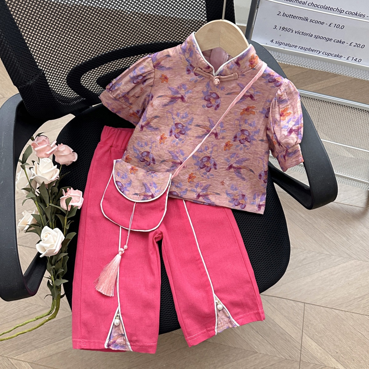 77272 여름 새로운 소녀 국가 스타일 스탠드 칼라 버블 짧은 소매 치파오 탑 와이드 레그 팬츠 백 3 피스 세트스토어 가기