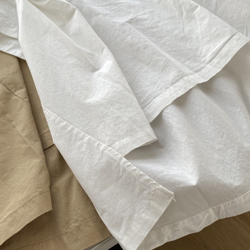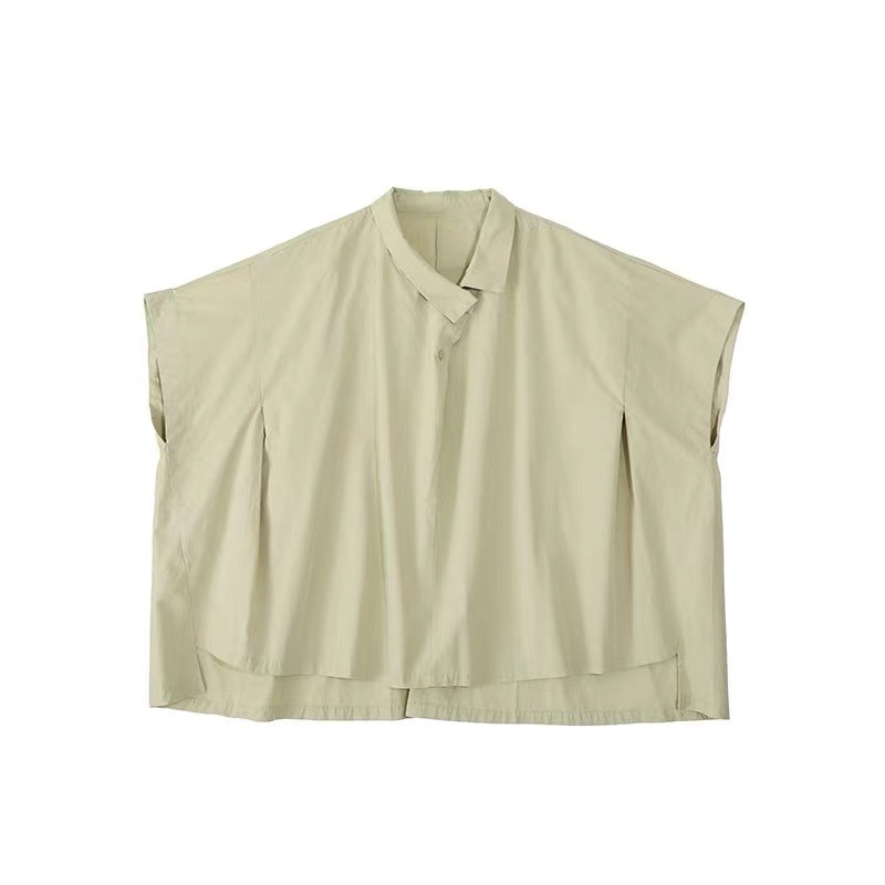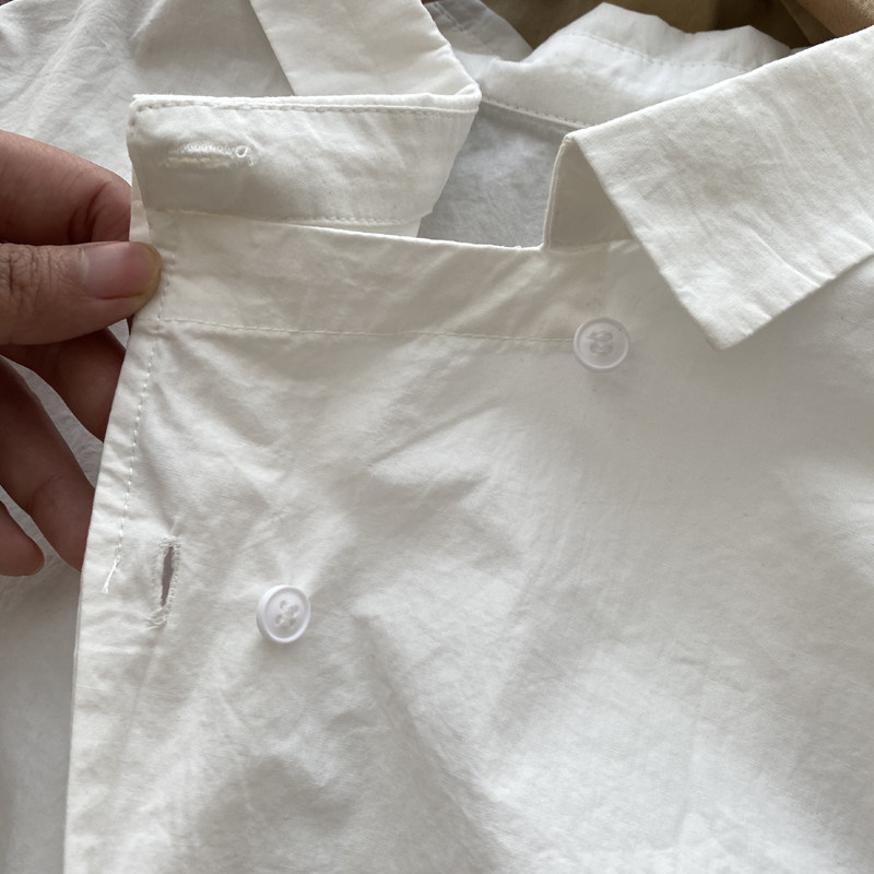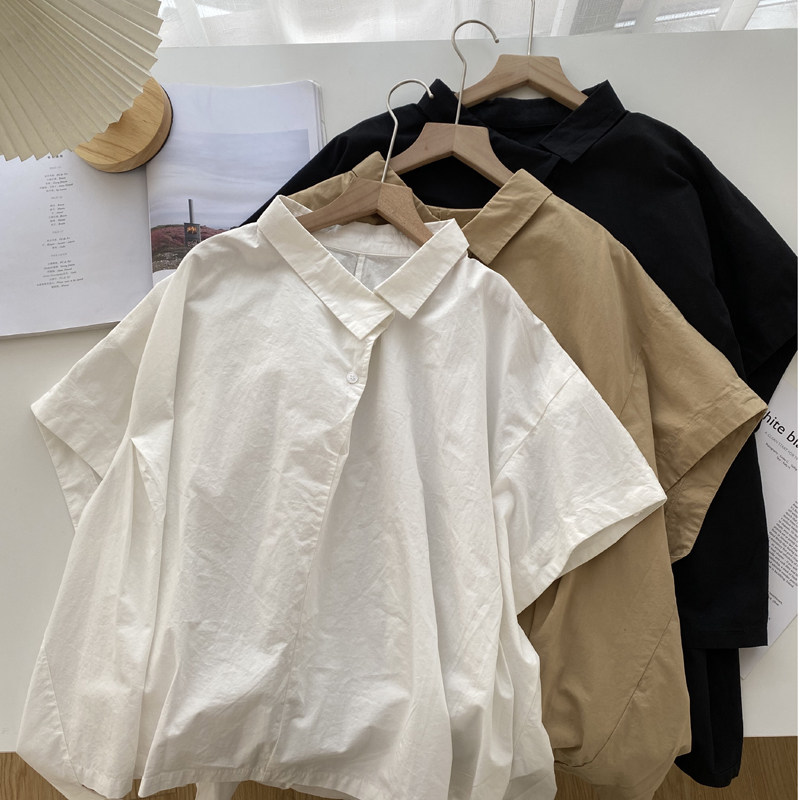 일본 틈새 디자인 센스 폴로 칼라 코튼 화이트 셔츠 여성의 느슨한 여름 새로운 스타일 짧은 앞면과 긴 뒷면