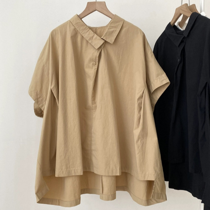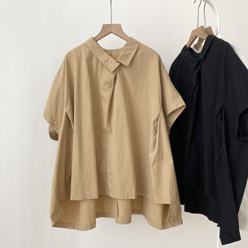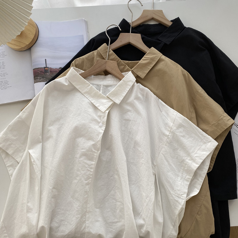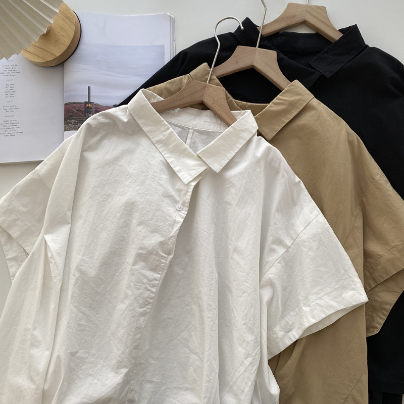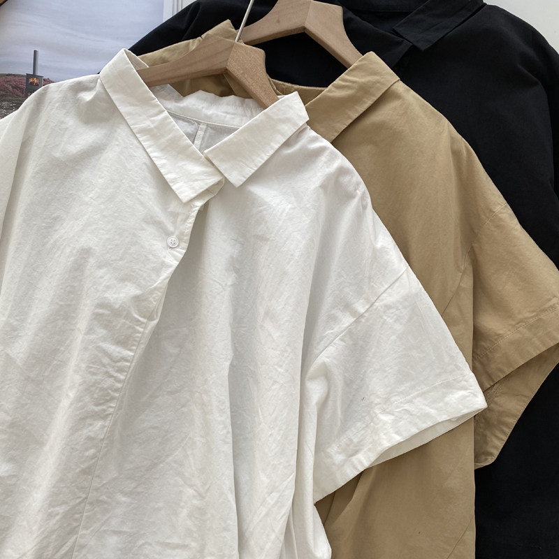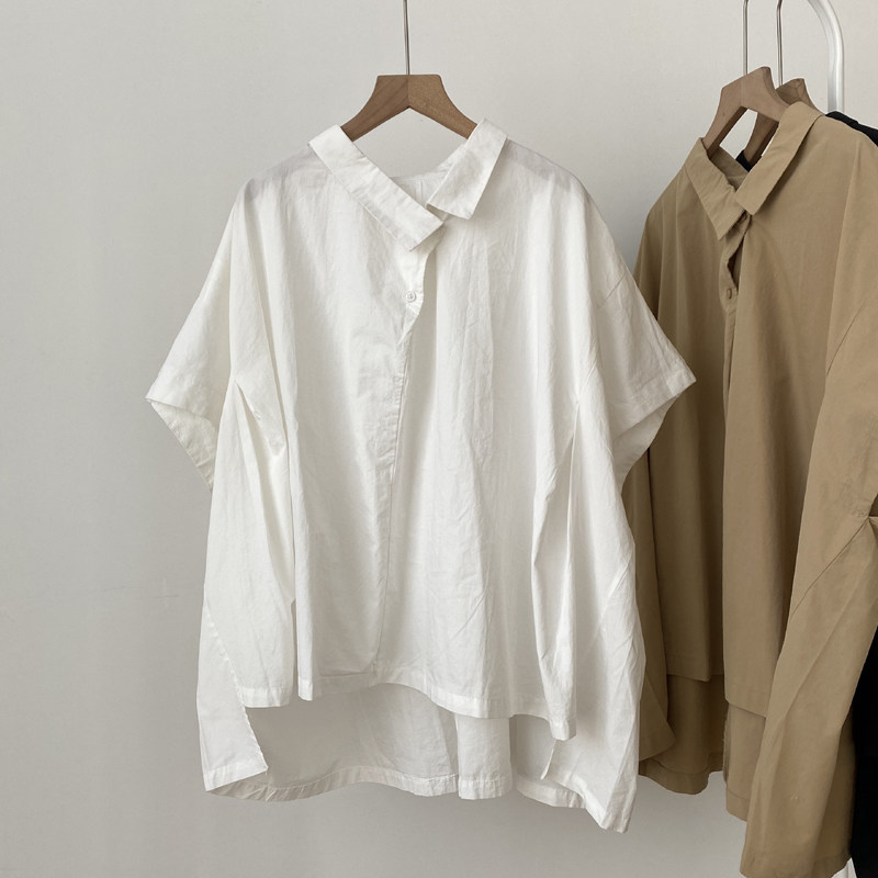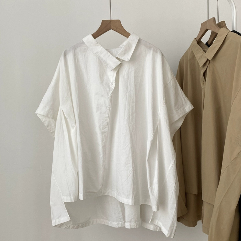 일본 틈새 디자인 센스 폴로 칼라 코튼 화이트 셔츠 여성의 느슨한 여름 새로운 스타일 짧은 앞면과 긴 뒷면스토어 가기