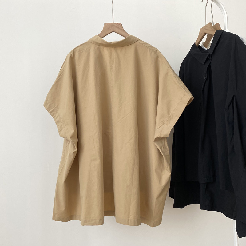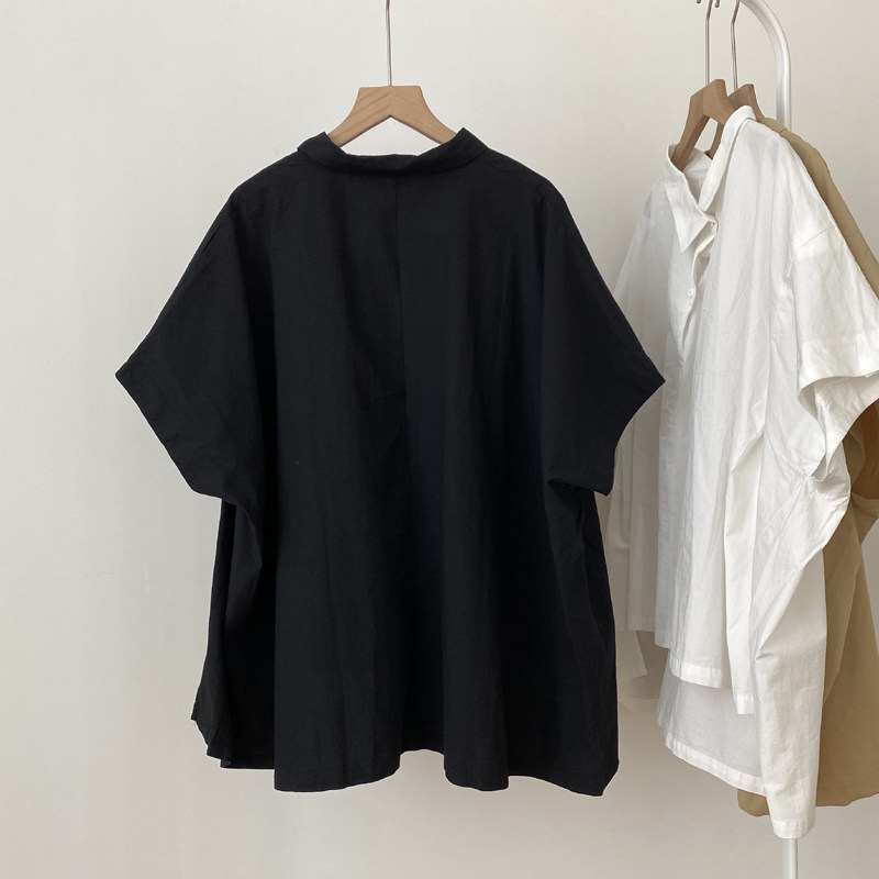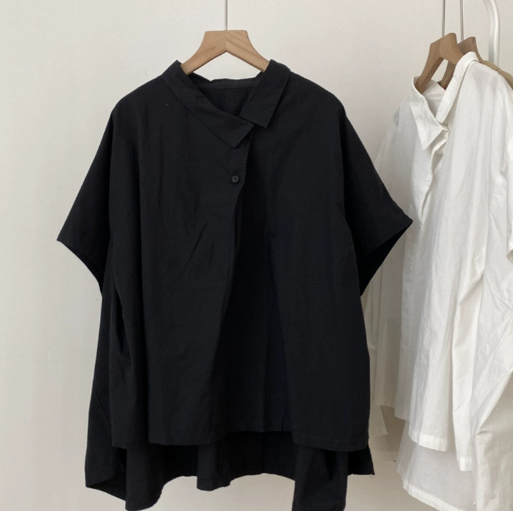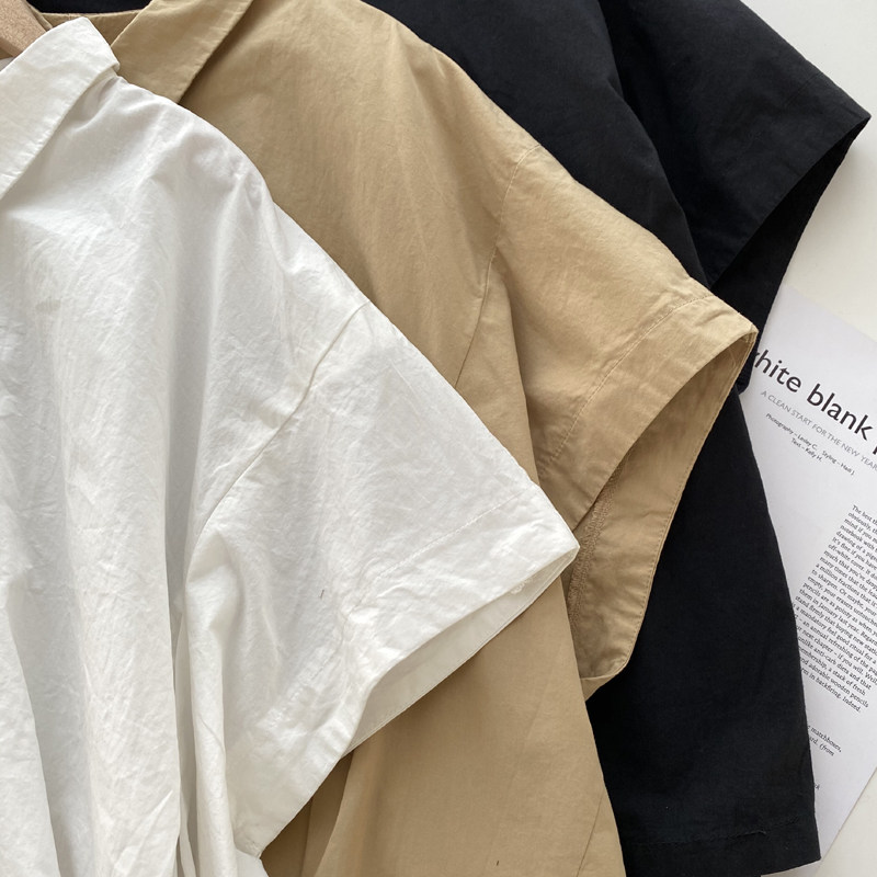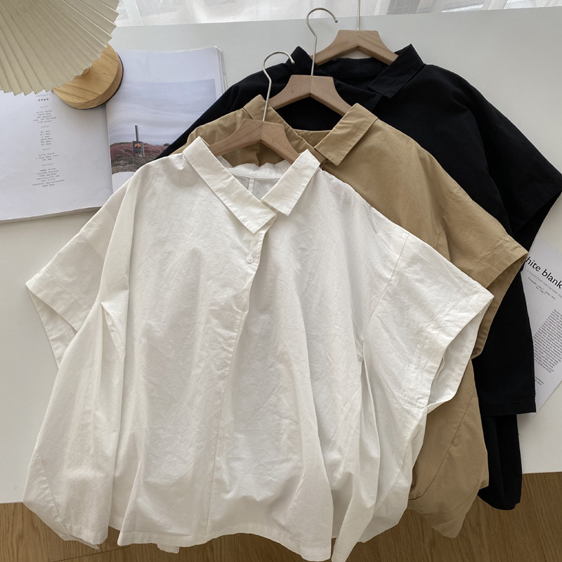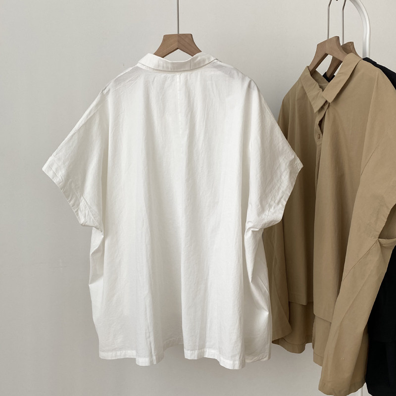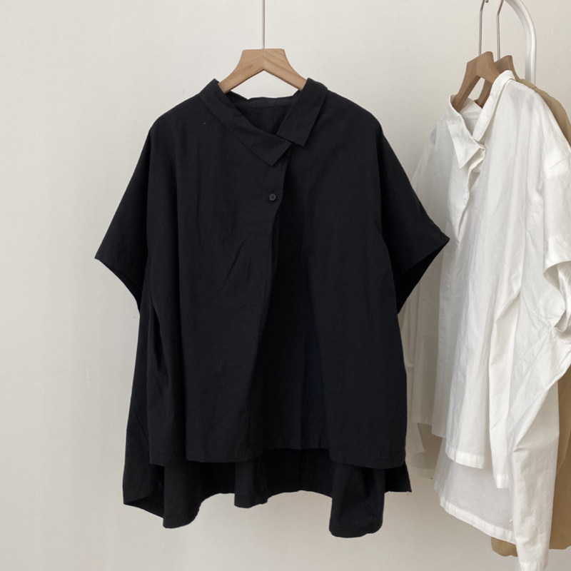 일본 틈새 디자인 센스 폴로 칼라 코튼 화이트 셔츠 여성의 느슨한 여름 새로운 스타일 짧은 앞면과 긴 뒷면스토어 가기