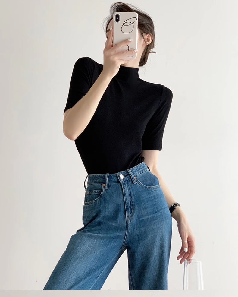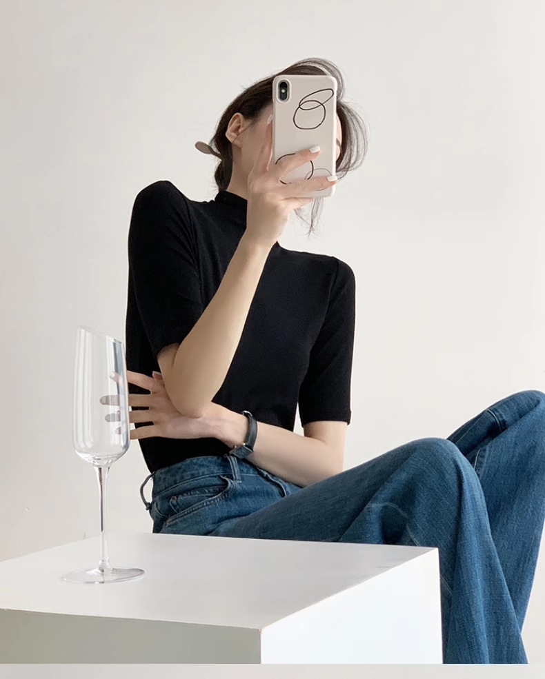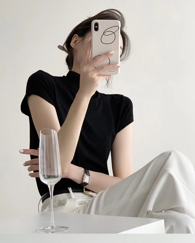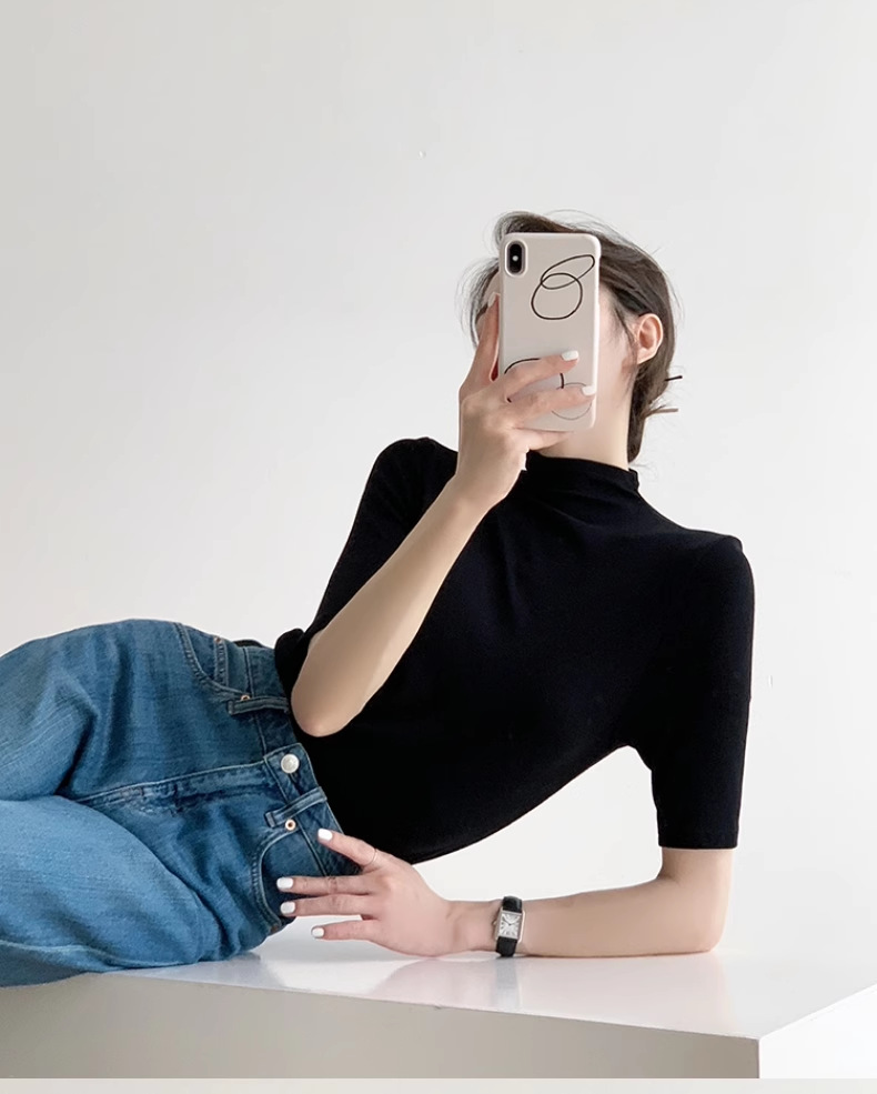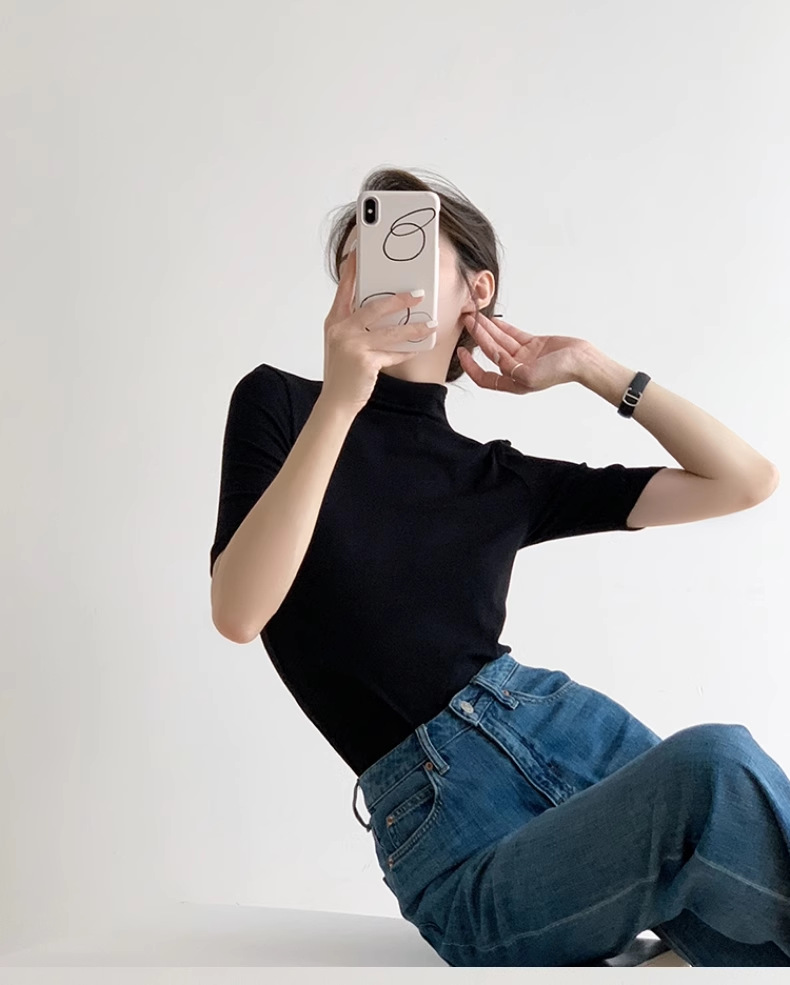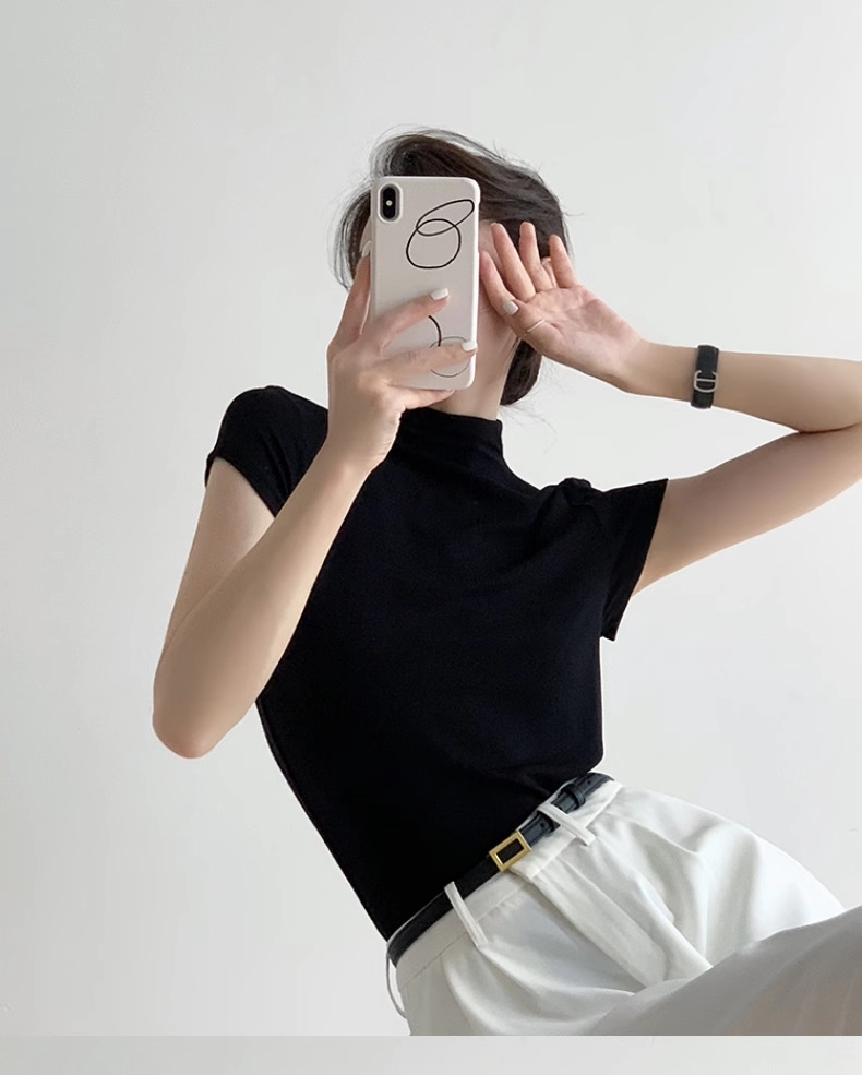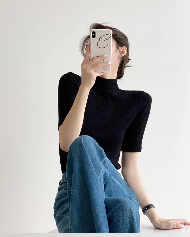 하이 엔드 블랙 하프 하이 넥 반팔 티셔츠 여성용 여름 인테리어 슬림 핏 아이스 실크 니트베이스 셔츠 숄더 탑스토어 가기