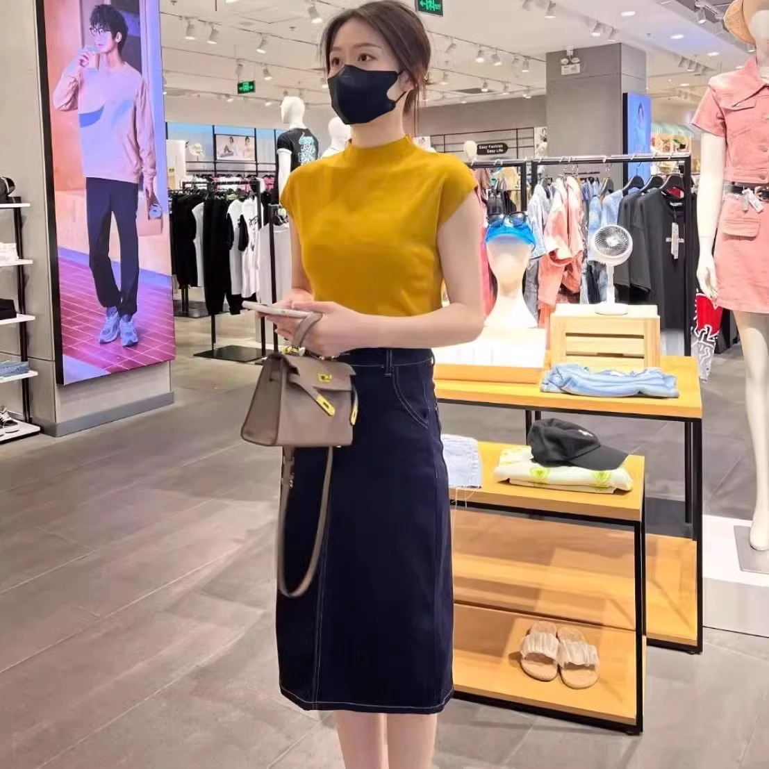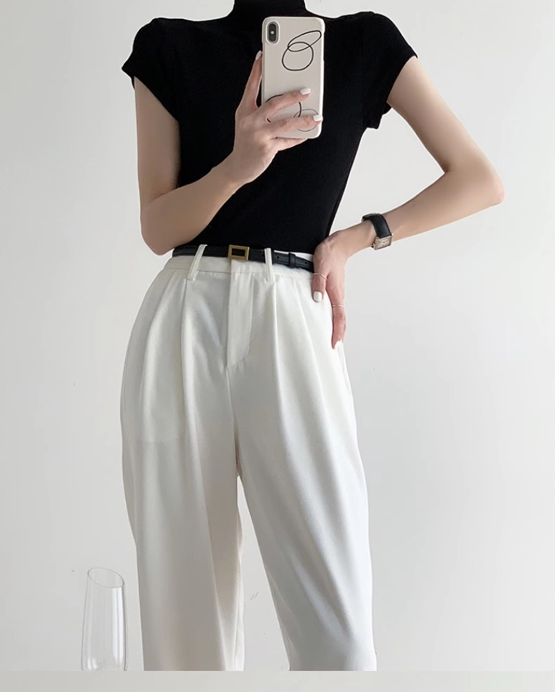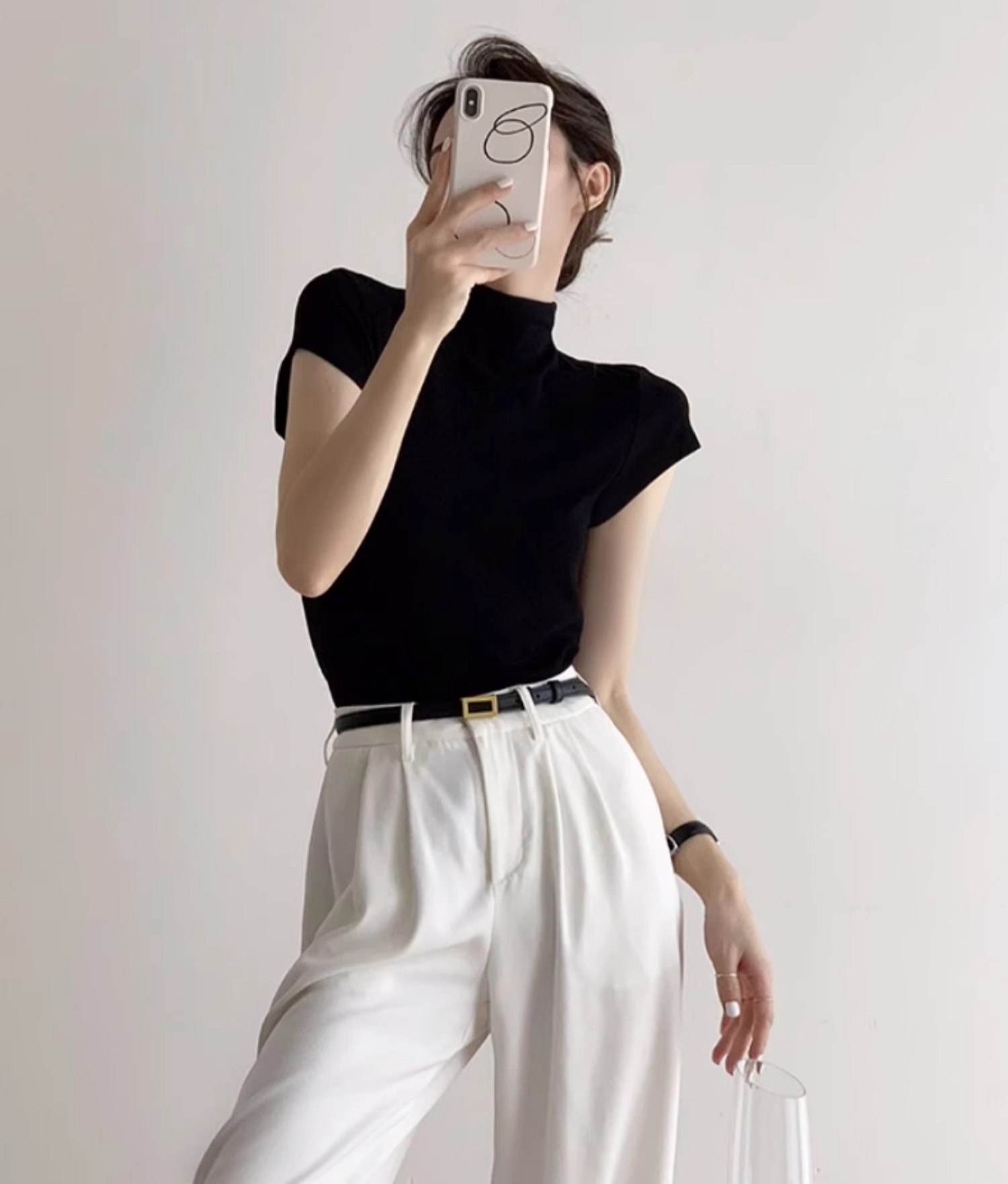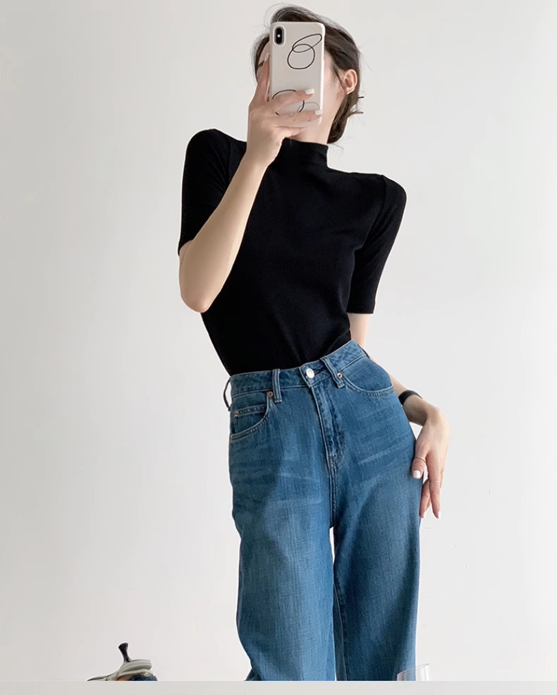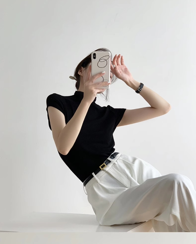 하이 엔드 블랙 하프 하이 넥 반팔 티셔츠 여성용 여름 인테리어 슬림 핏 아이스 실크 니트베이스 셔츠 숄더 탑스토어 가기