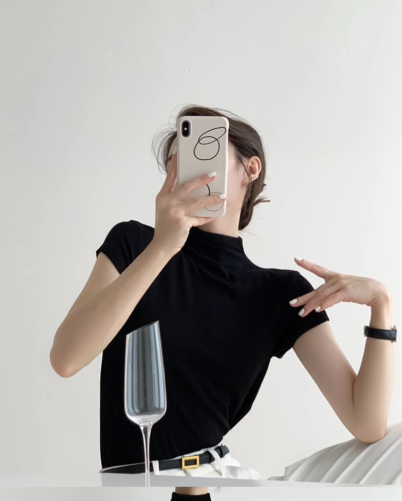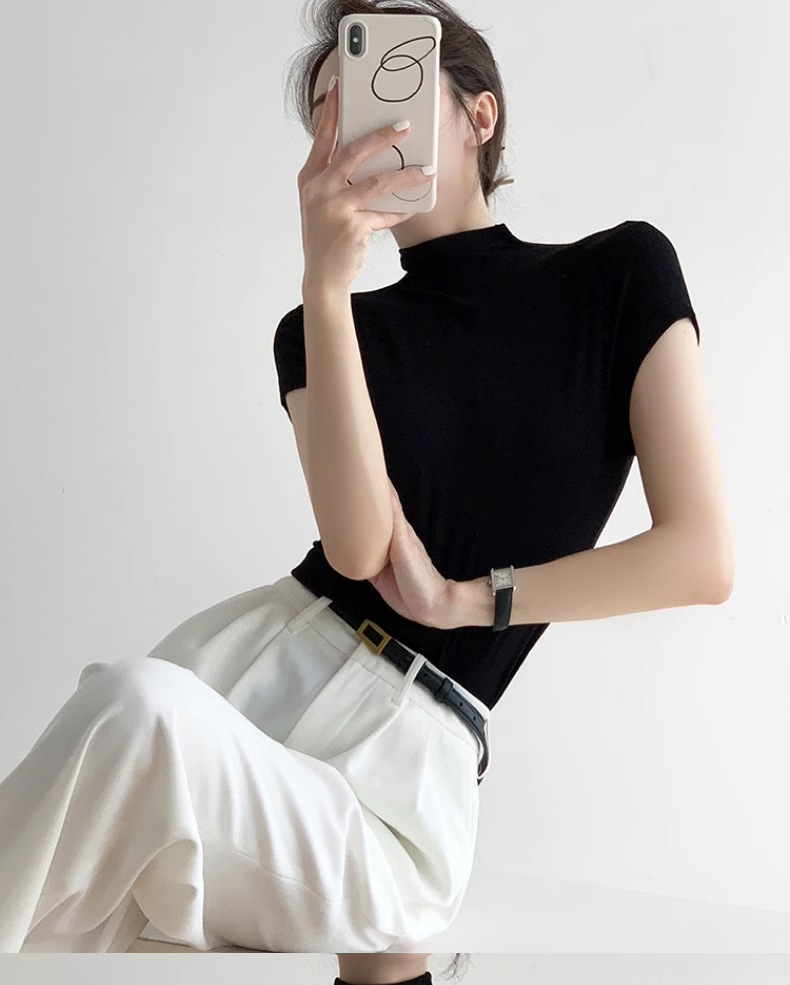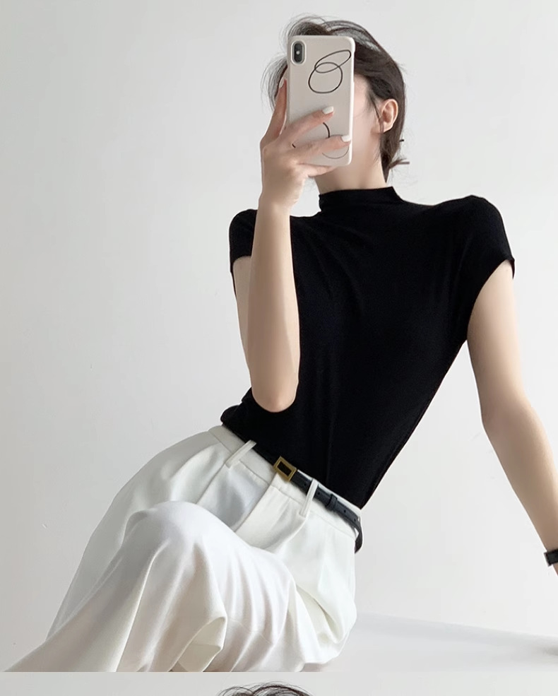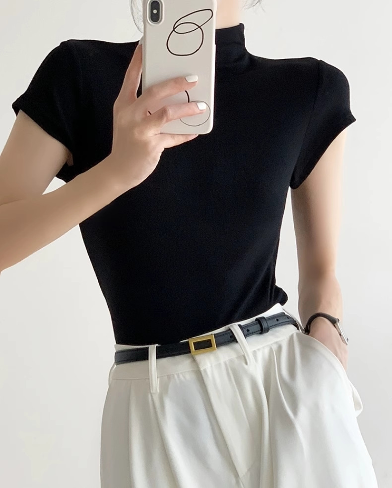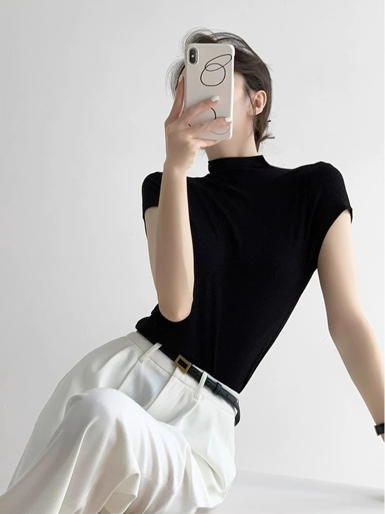 하이 엔드 블랙 하프 하이 넥 반팔 티셔츠 여성용 여름 인테리어 슬림 핏 아이스 실크 니트베이스 셔츠 숄더 탑