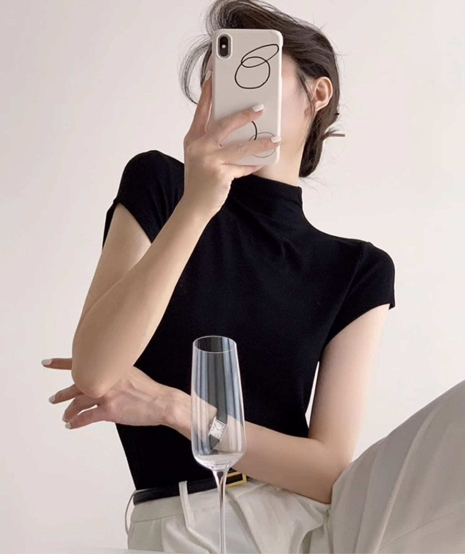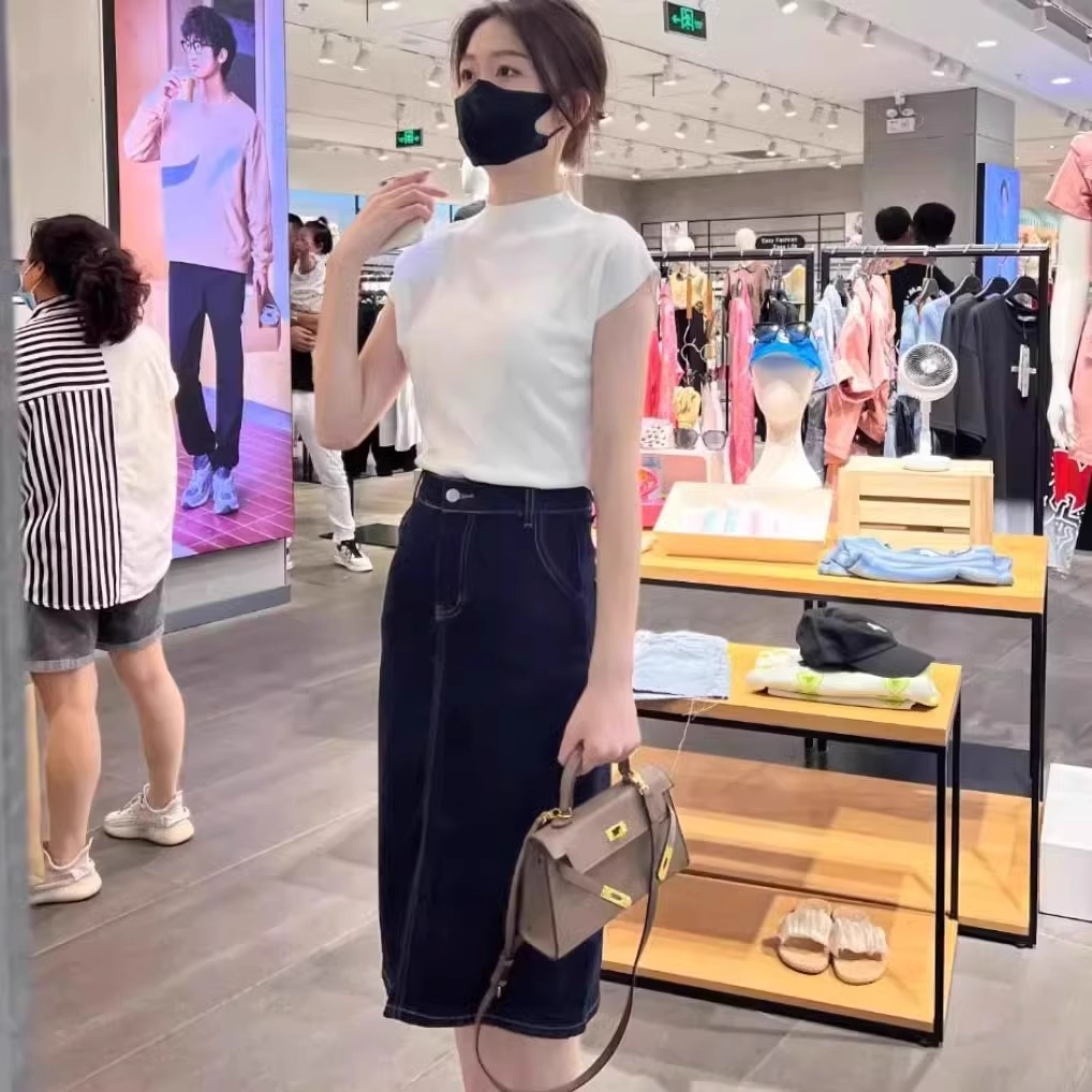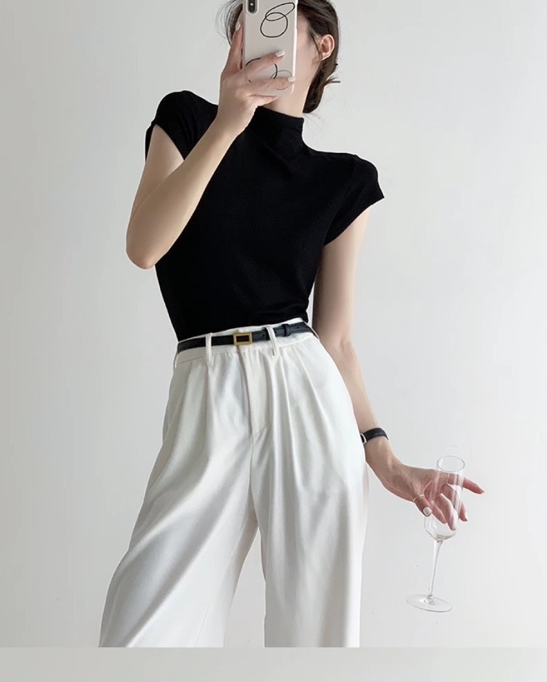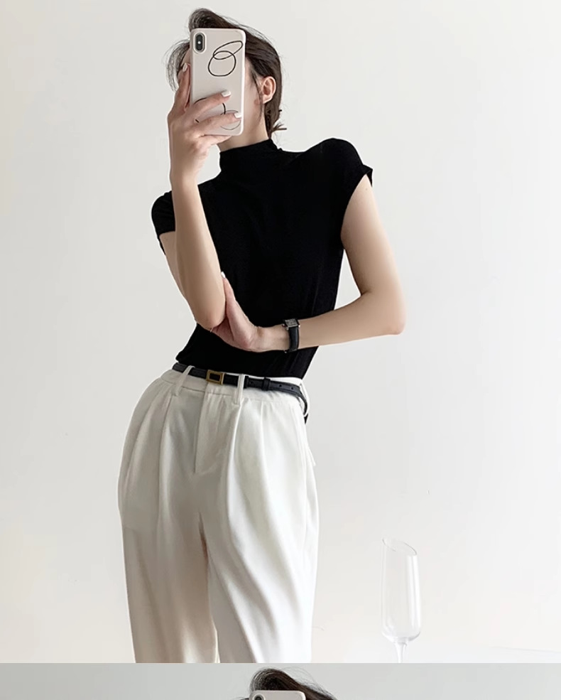 하이 엔드 블랙 하프 하이 넥 반팔 티셔츠 여성용 여름 인테리어 슬림 핏 아이스 실크 니트베이스 셔츠 숄더 탑