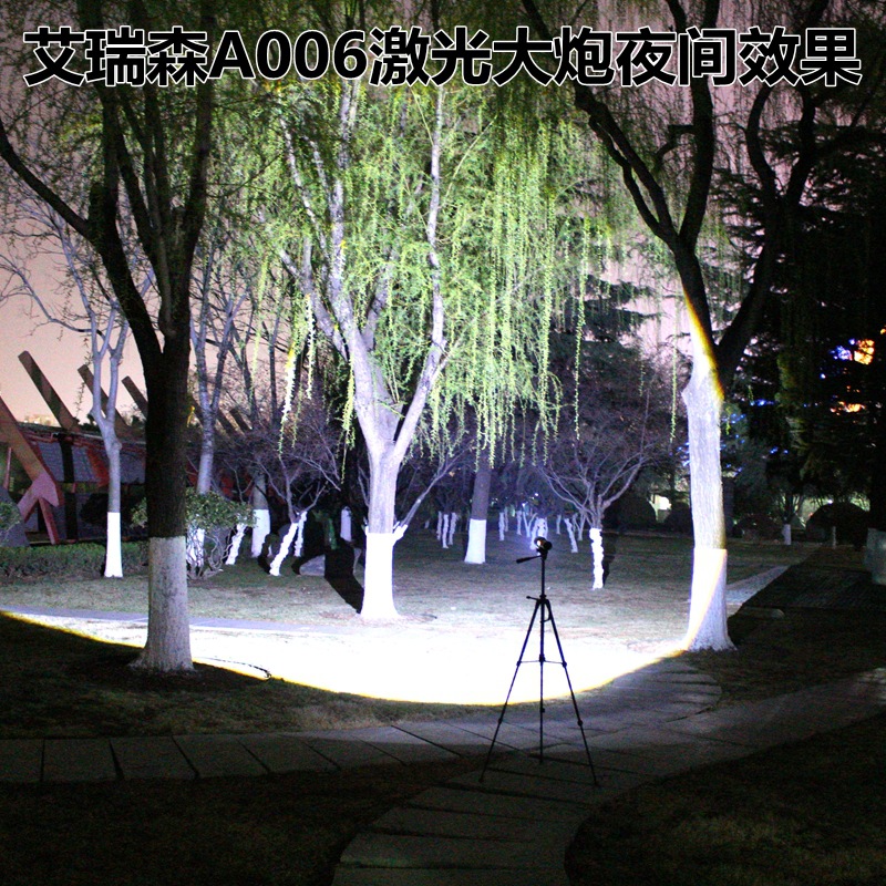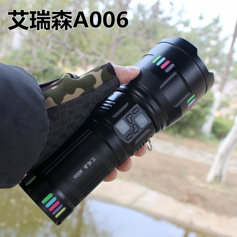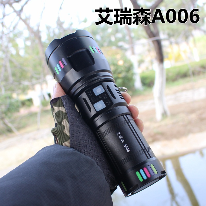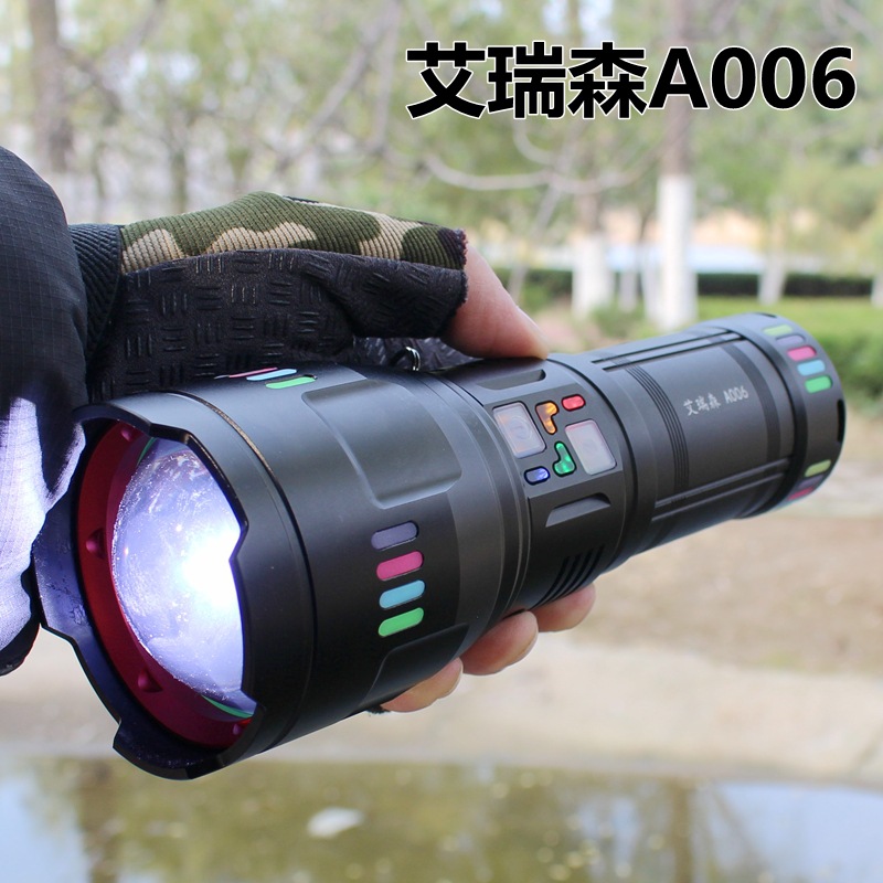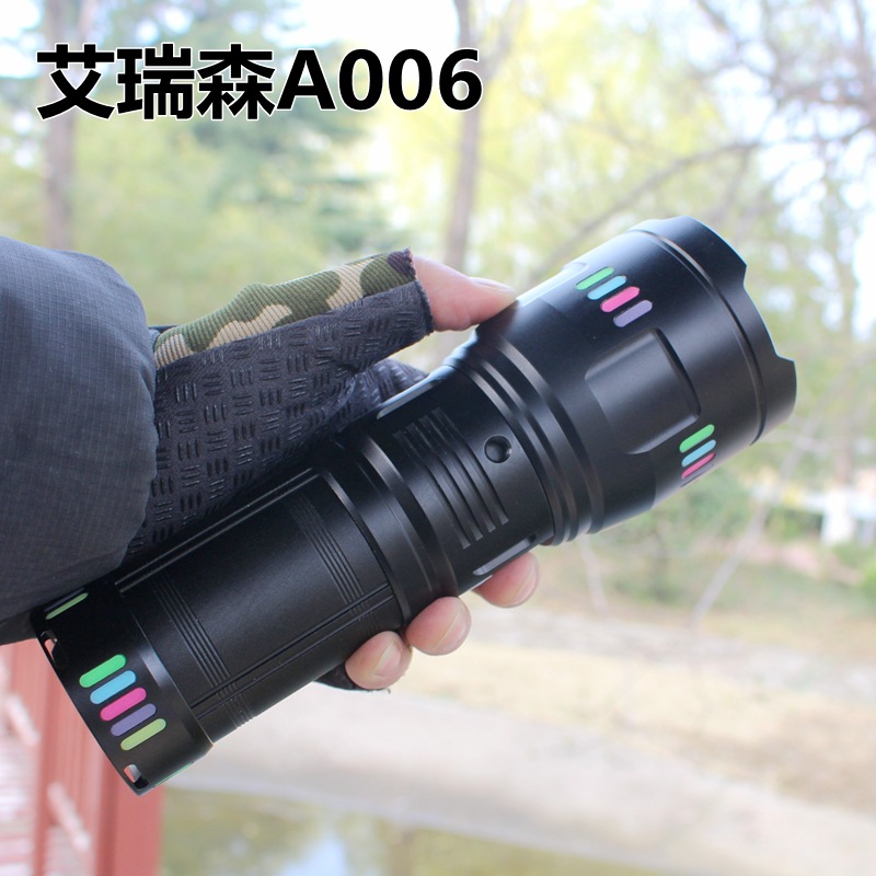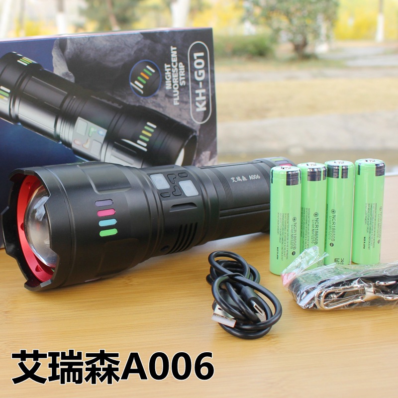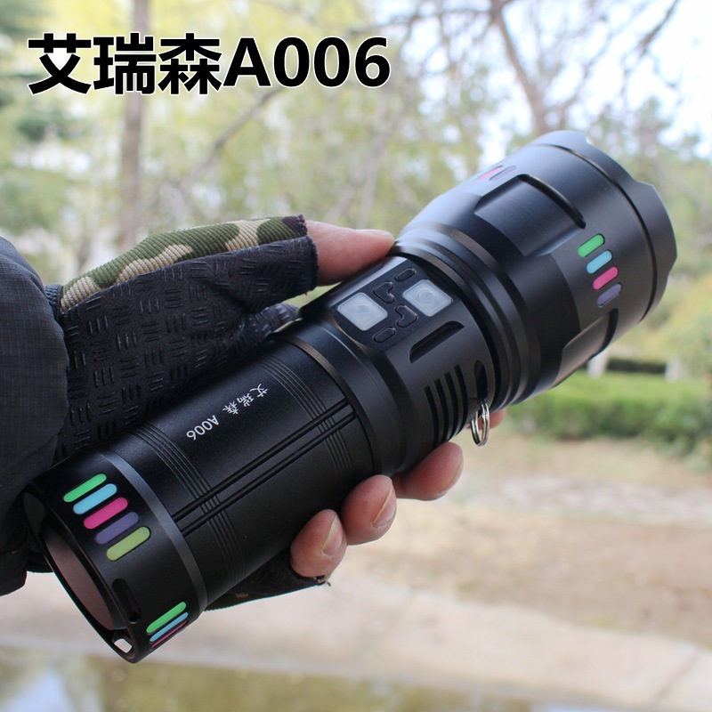 艾瑞森A006户外强光手电筒,进口超亮型白激光灯珠,可以伸缩调节灯光大小,4节18650高容量锂电池,超强光模式下连续照明2.5小时,弱光连续照明6小时左右,强光有效射程1500米,双开关共6个档位(左开关一键启动超强光、双击爆闪,右开关(弱光、中光、强光、求救光、长按开关3秒带有无极调光), Type-c智能快充插孔方便更实用,并支持USB输出,灯身底部配有支架孔,可固定到支架上面使用,灯身前后配有多彩夜光皮垫,尺寸:总长24.5cmX灯头7.5cmX尾部5.5cm,超强防水、抗摔,航空铝材打造精品手电,适合户外巡逻、探险、野营、巡逻、及多种夜间户外照明使用!