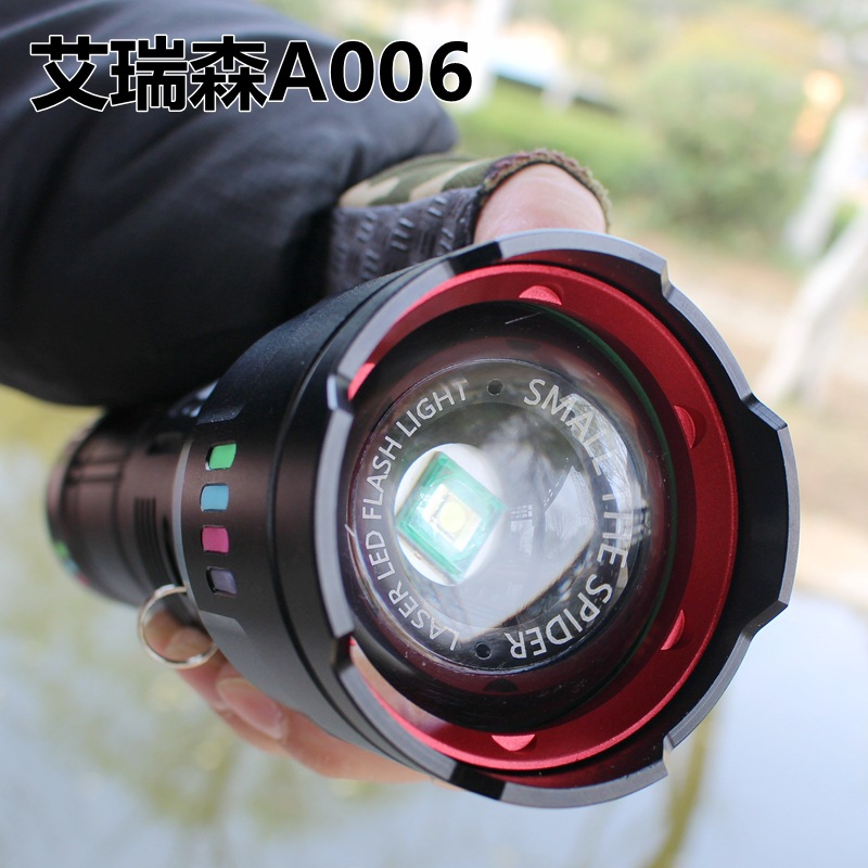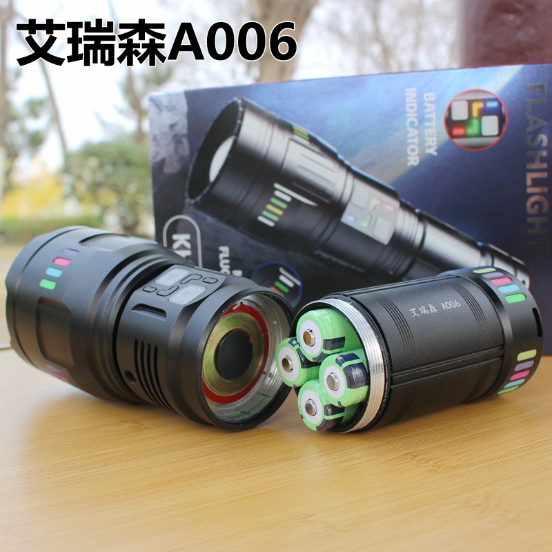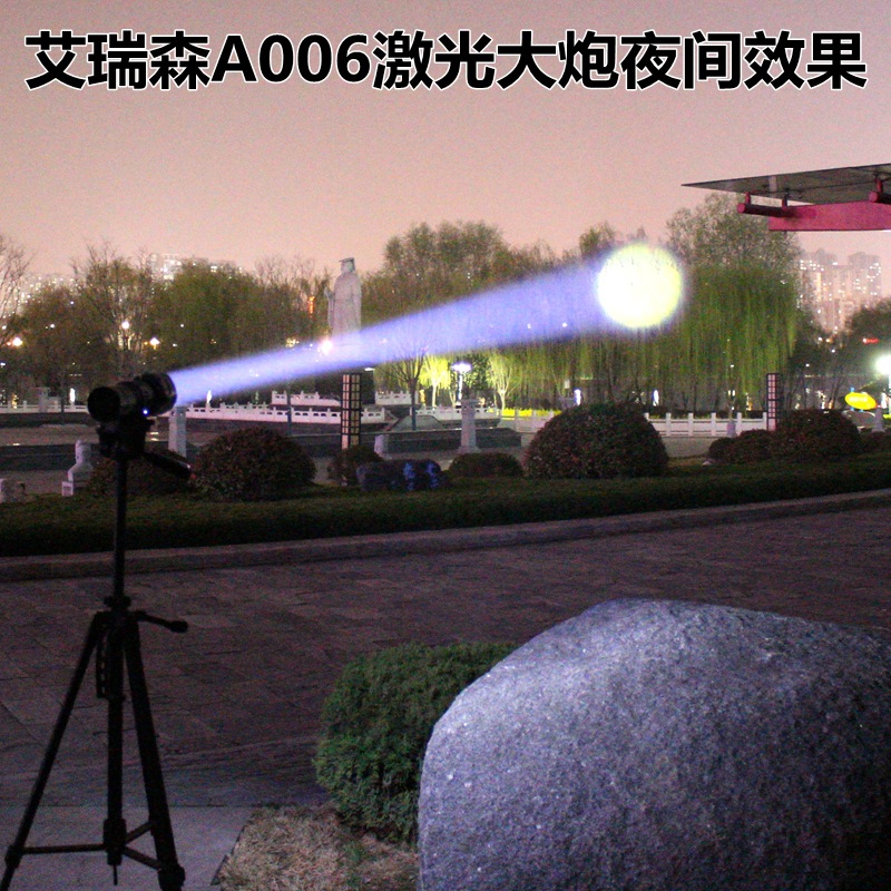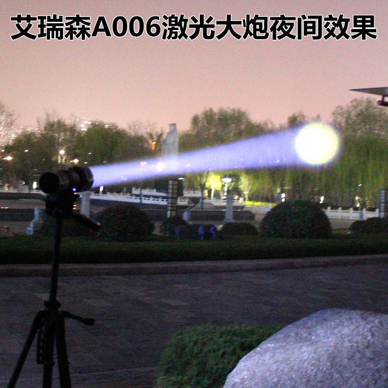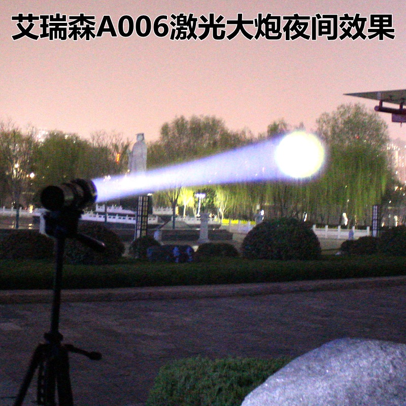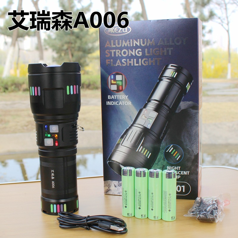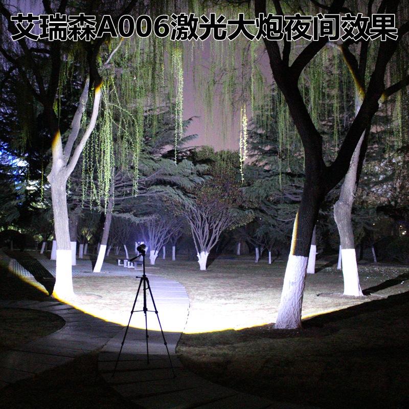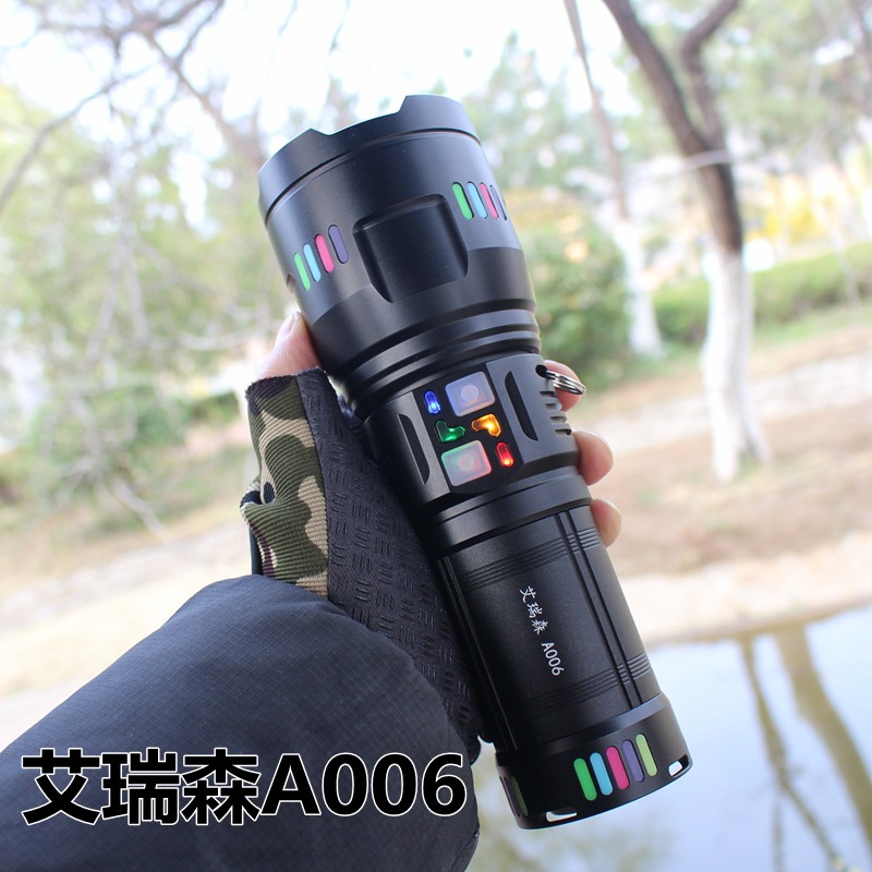 艾瑞森A006户外强光手电筒,进口超亮型白激光灯珠,可以伸缩调节灯光大小,4节18650高容量锂电池,超强光模式下连续照明2.5小时,弱光连续照明6小时左右,强光有效射程1500米,双开关共6个档位(左开关一键启动超强光、双击爆闪,右开关(弱光、中光、强光、求救光、长按开关3秒带有无极调光), Type-c智能快充插孔方便更实用,并支持USB输出,灯身底部配有支架孔,可固定到支架上面使用,灯身前后配有多彩夜光皮垫,尺寸:总长24.5cmX灯头7.5cmX尾部5.5cm,超强防水、抗摔,航空铝材打造精品手电,适合户外巡逻、探险、野营、巡逻、及多种夜间户外照明使用!