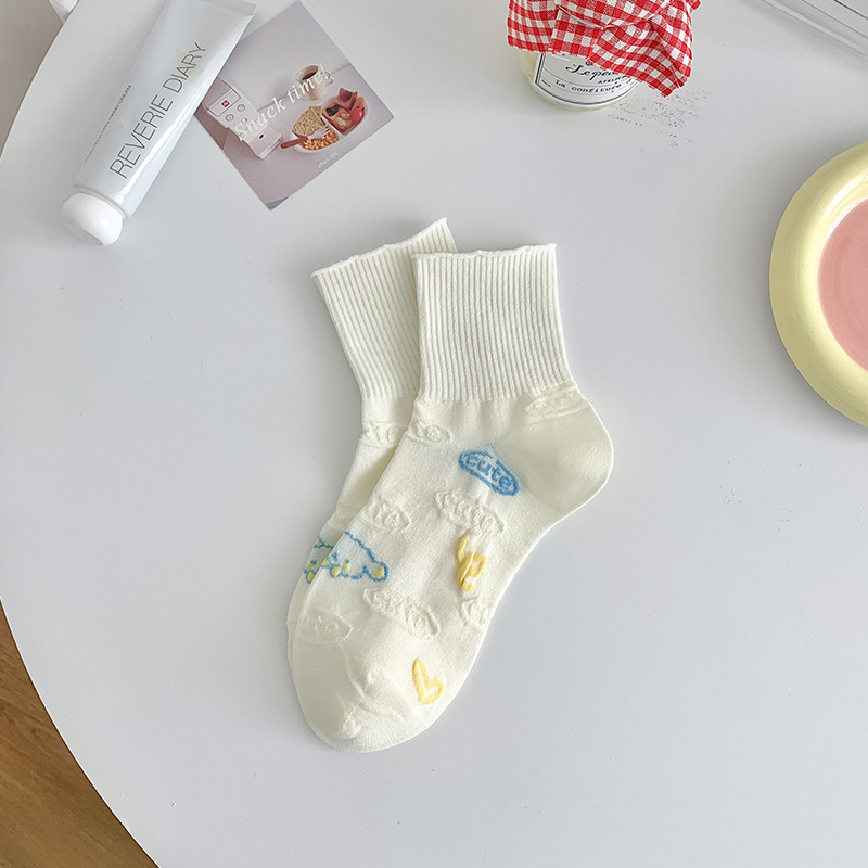 봄과 여름 새 크림 줄무늬 편지 짧은 5 점 양말 여성 통기성 면 양말 한국 자수 만화 여성 양말