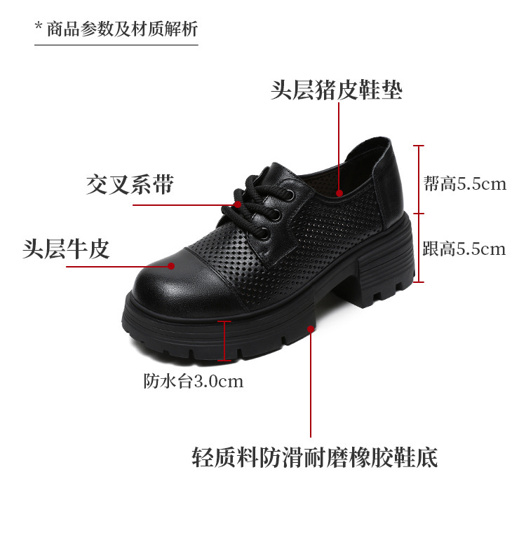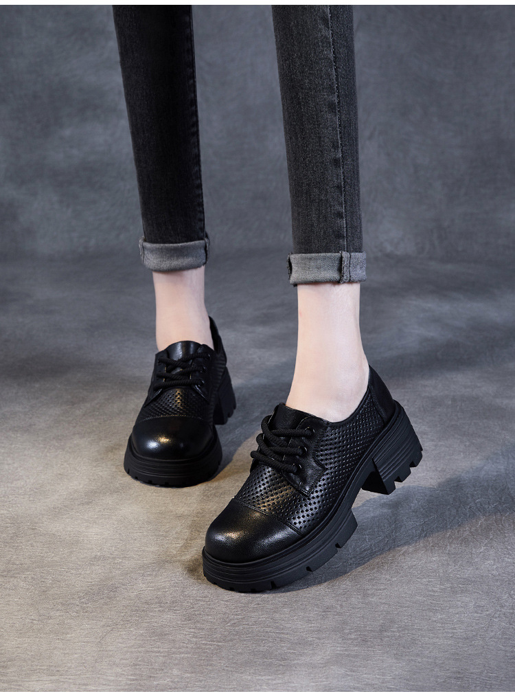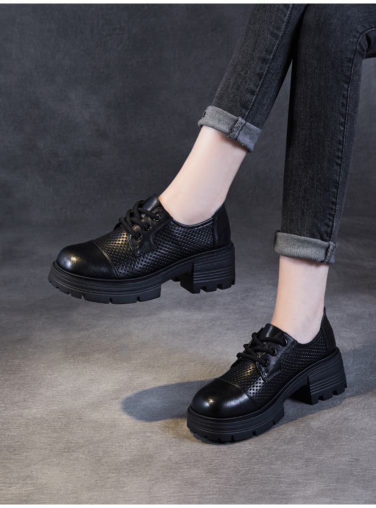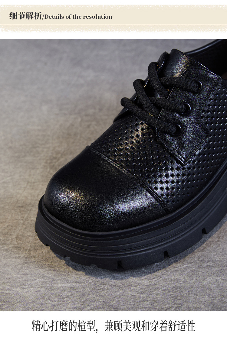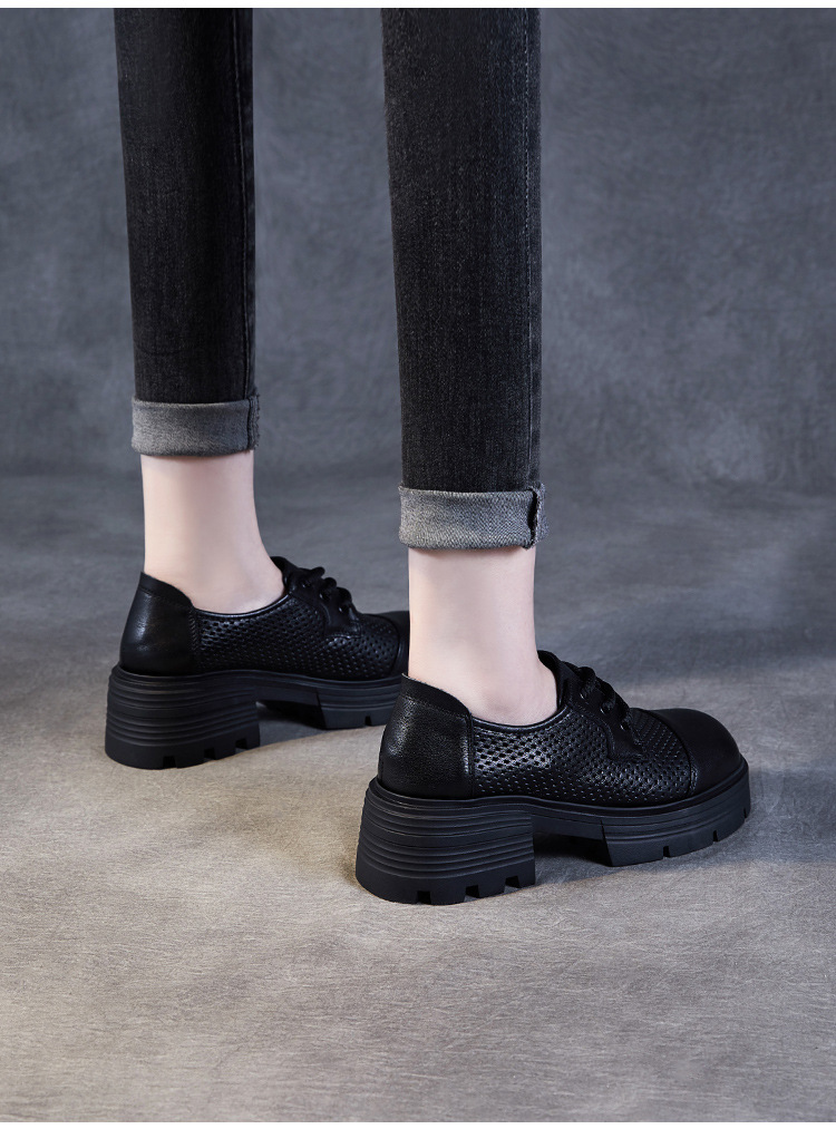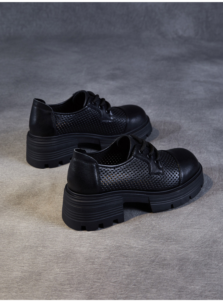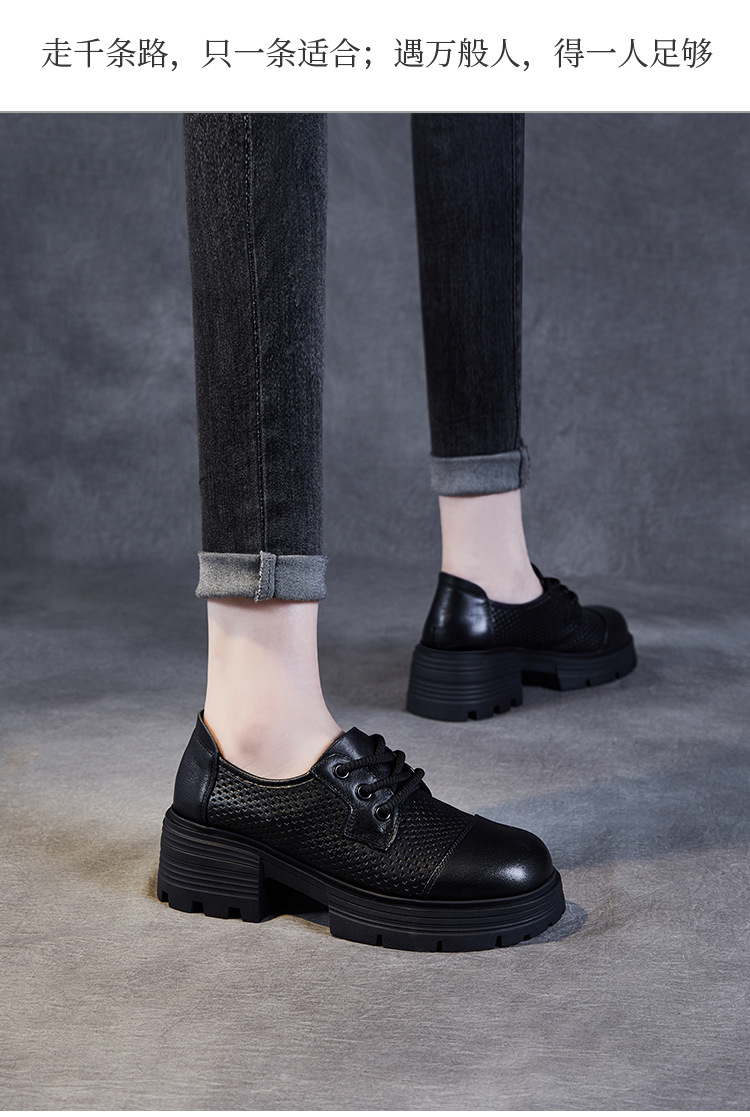 2024 새로운 할로우 캐주얼 작은 가죽 신발 여성 여름 정품 가죽 레이스 업 플랫폼 두꺼운 바닥 통기성 천공 로퍼