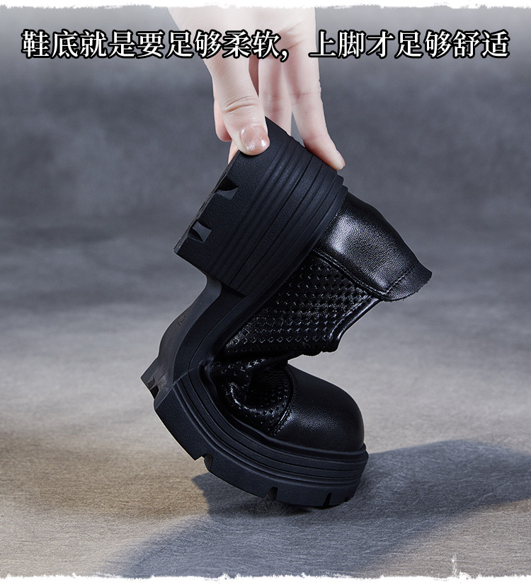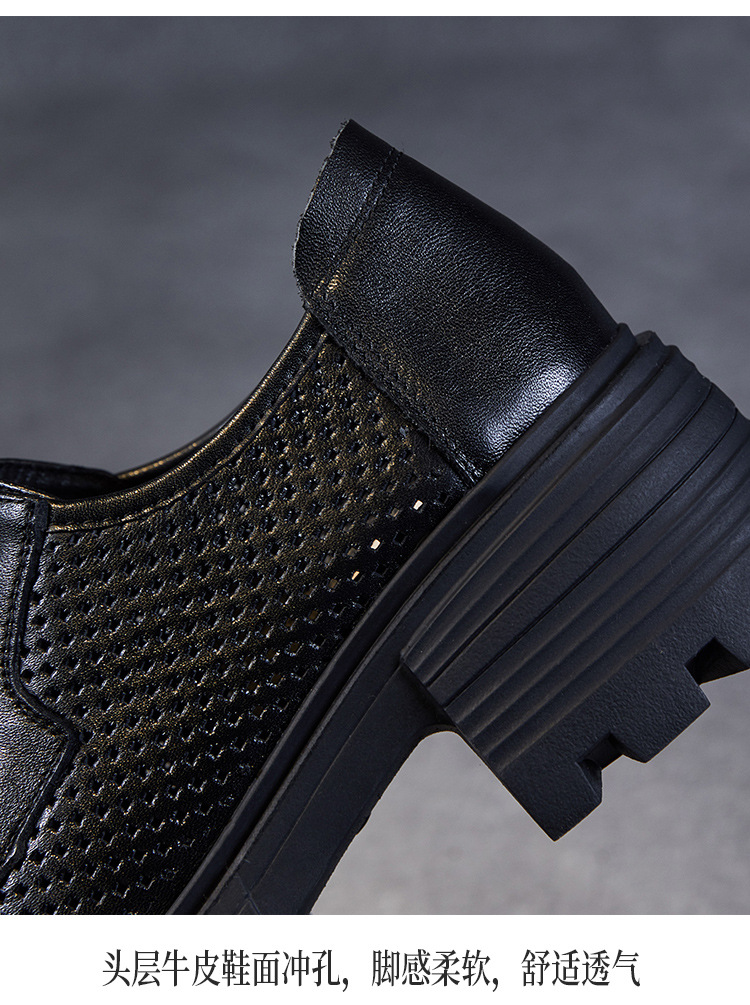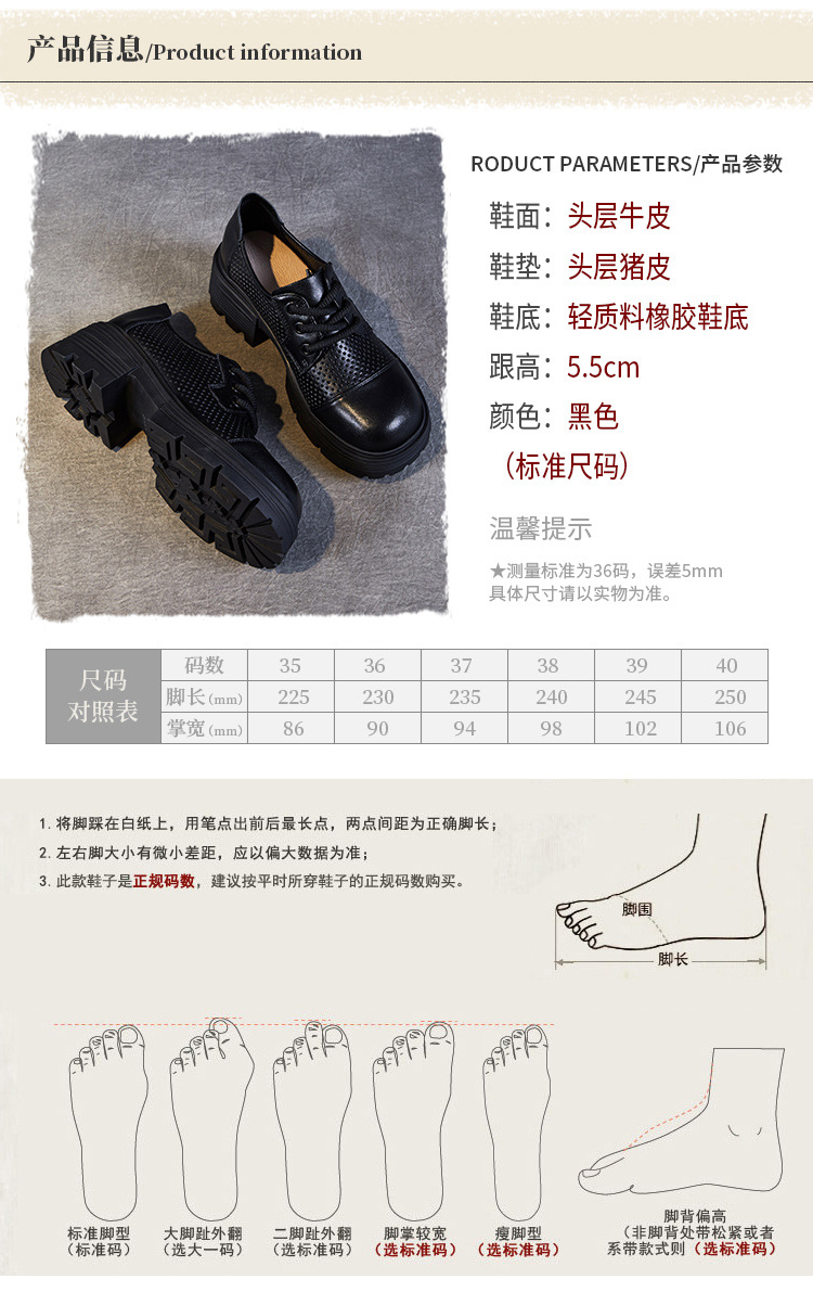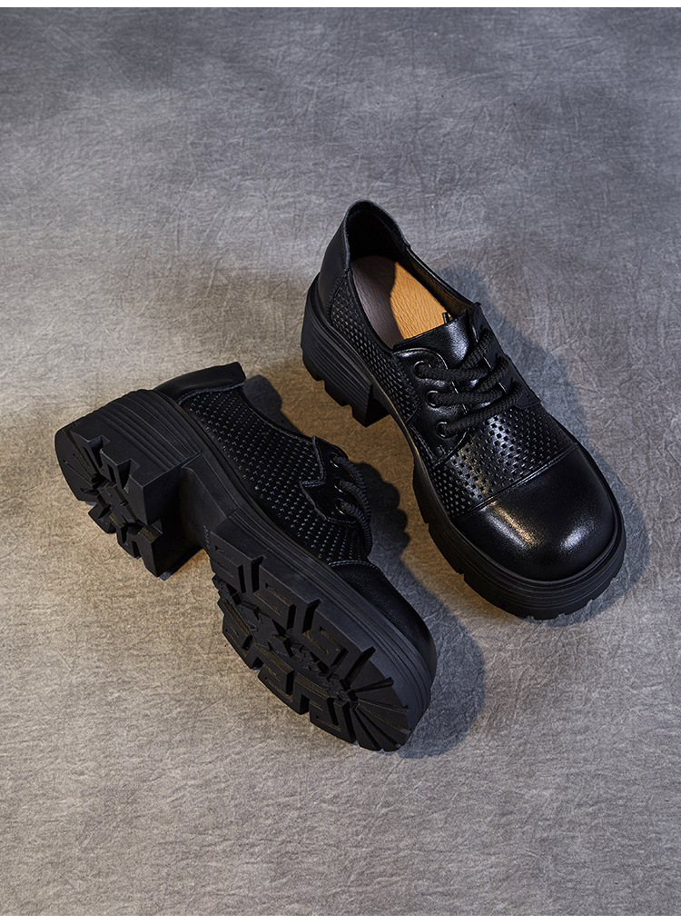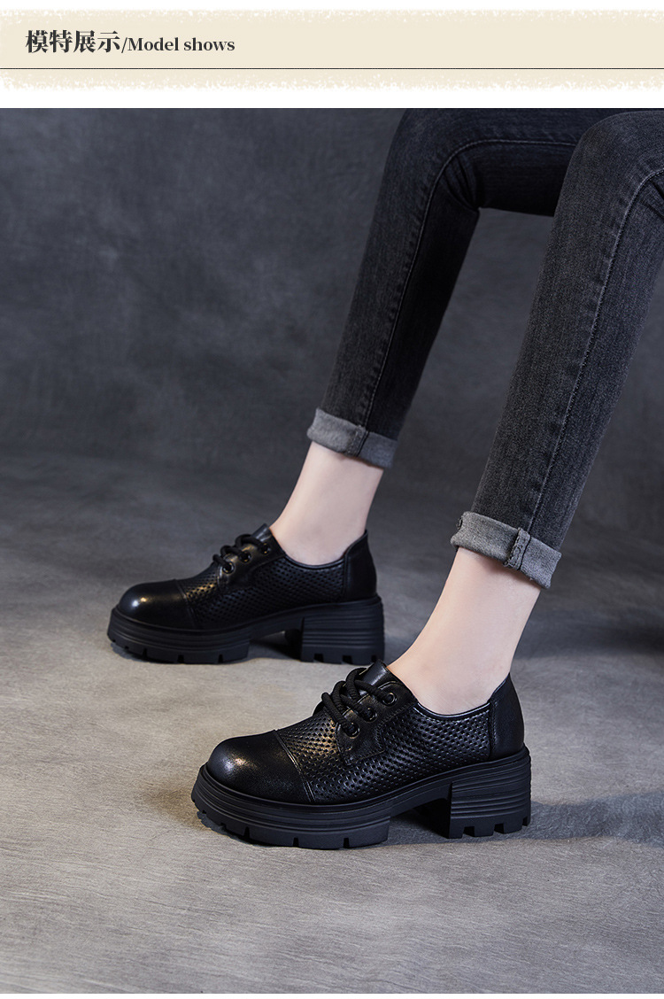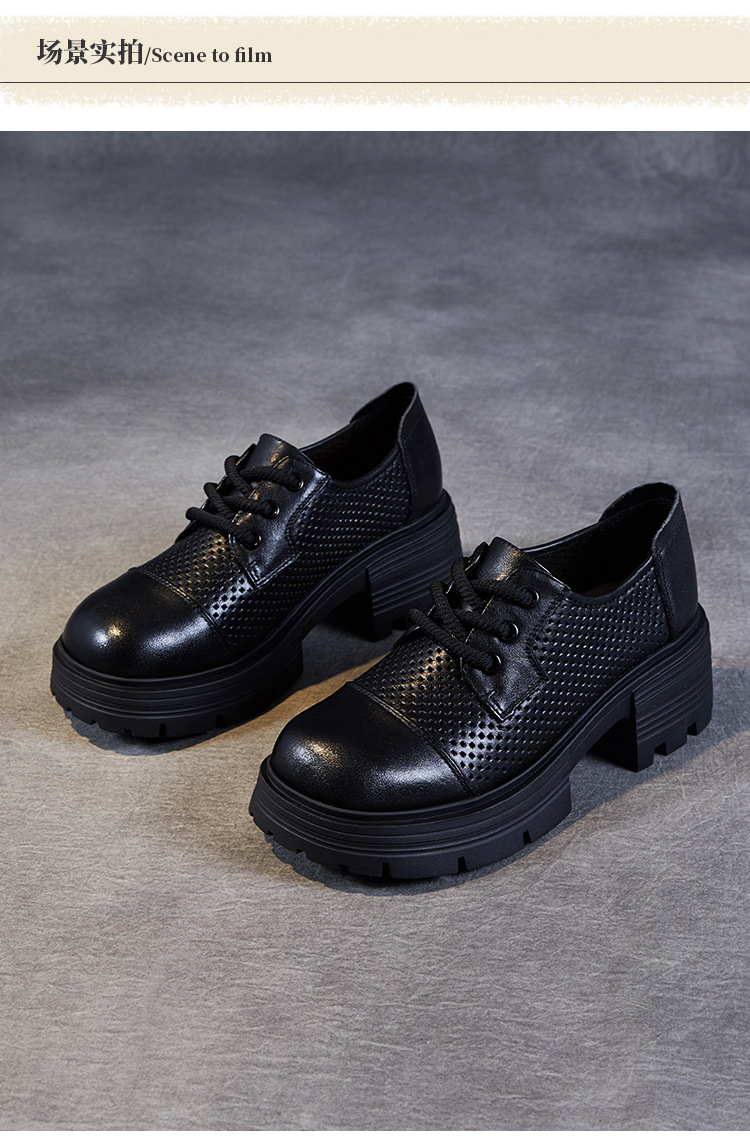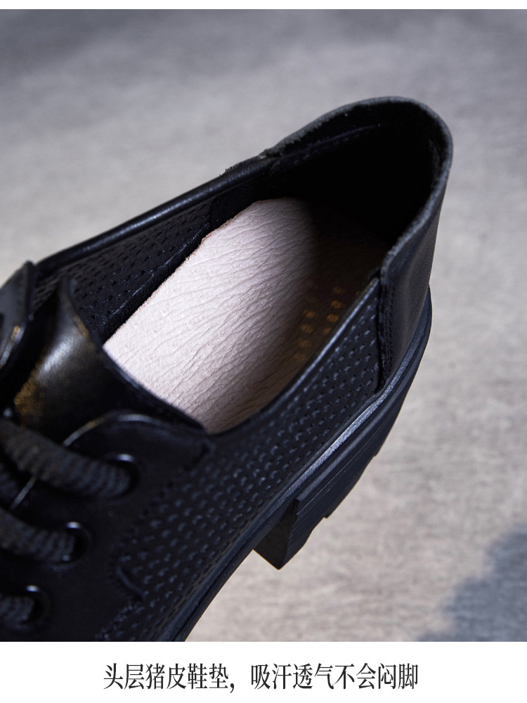 2024 새로운 할로우 캐주얼 작은 가죽 신발 여성 여름 정품 가죽 레이스 업 플랫폼 두꺼운 바닥 통기성 천공 로퍼