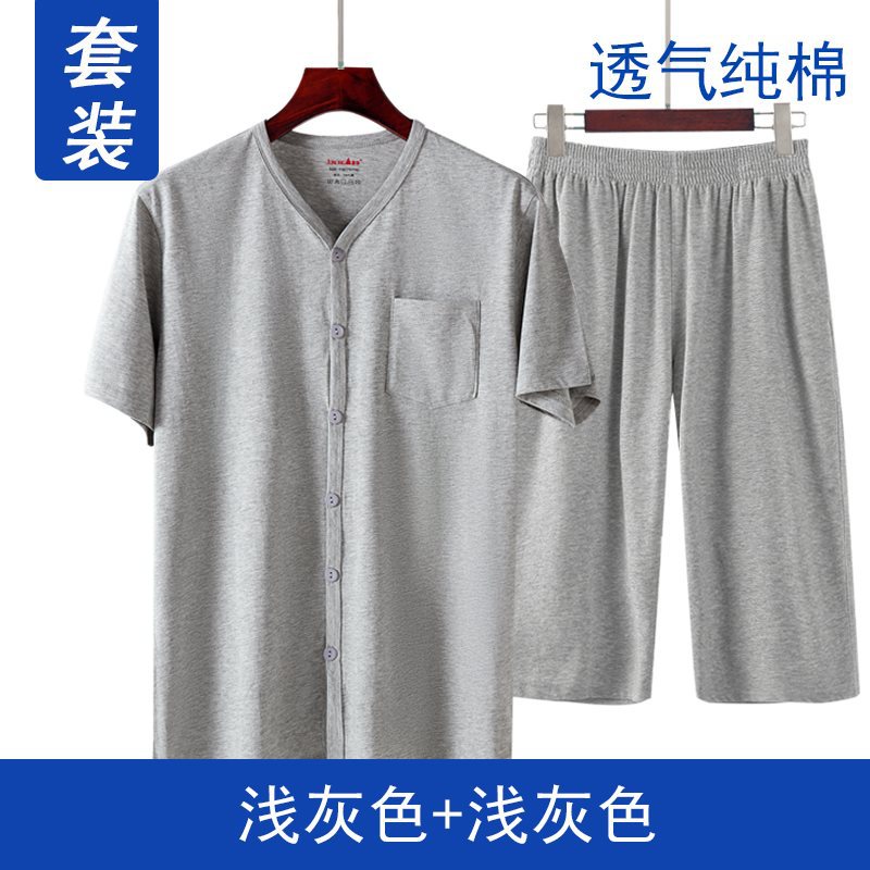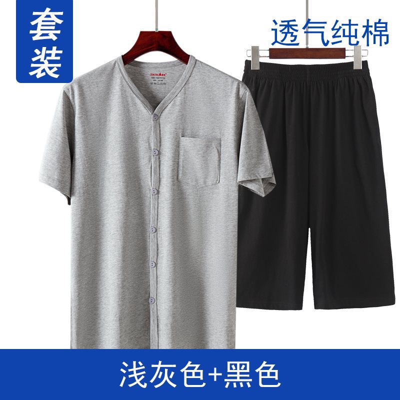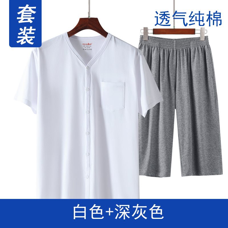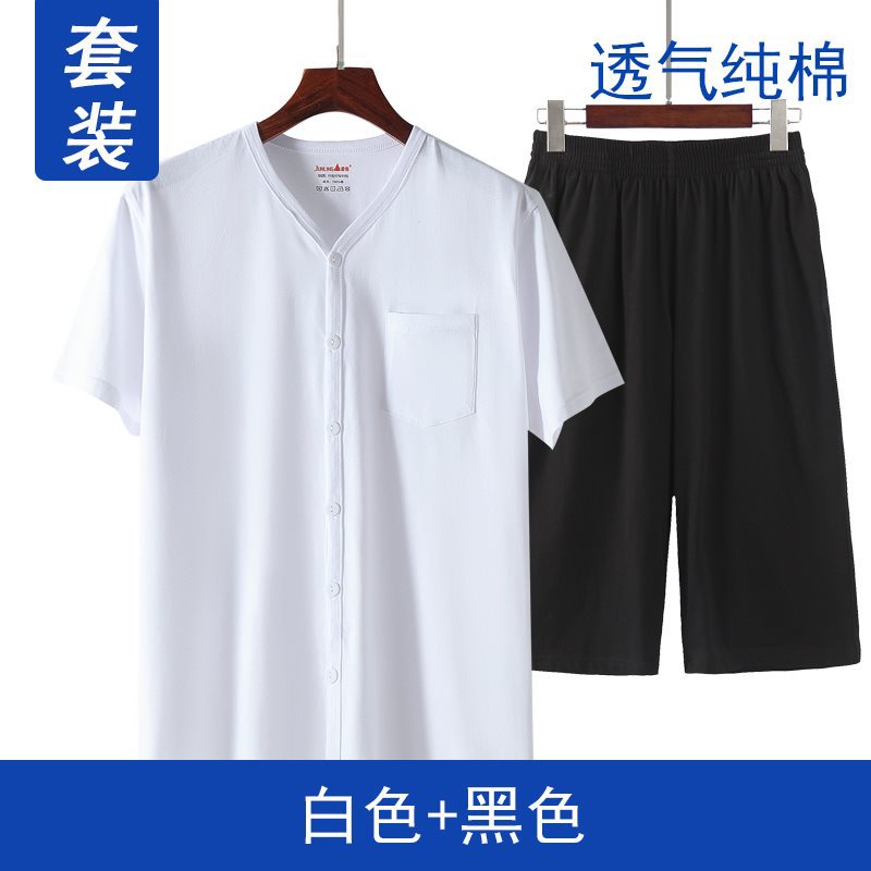 중년 및 노인 세트 반팔 티셔츠 남성용 티셔츠 버클 카디건 블레이드 투피스 세트 할아버지의 더블 브레스트 반팔 올드 헤드 라인 셔츠