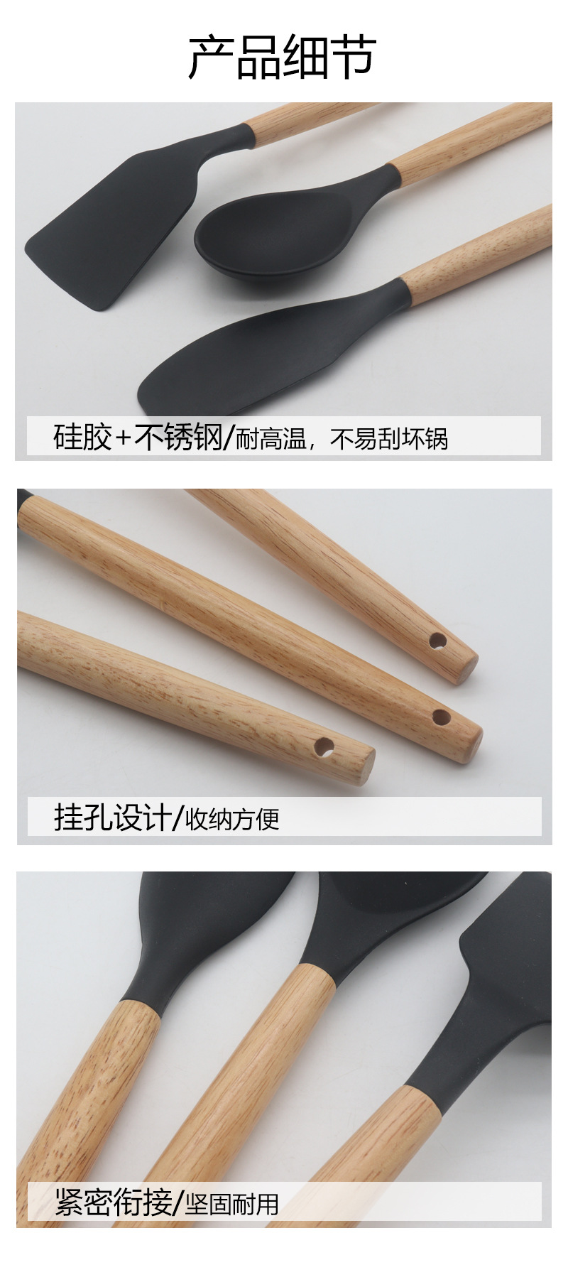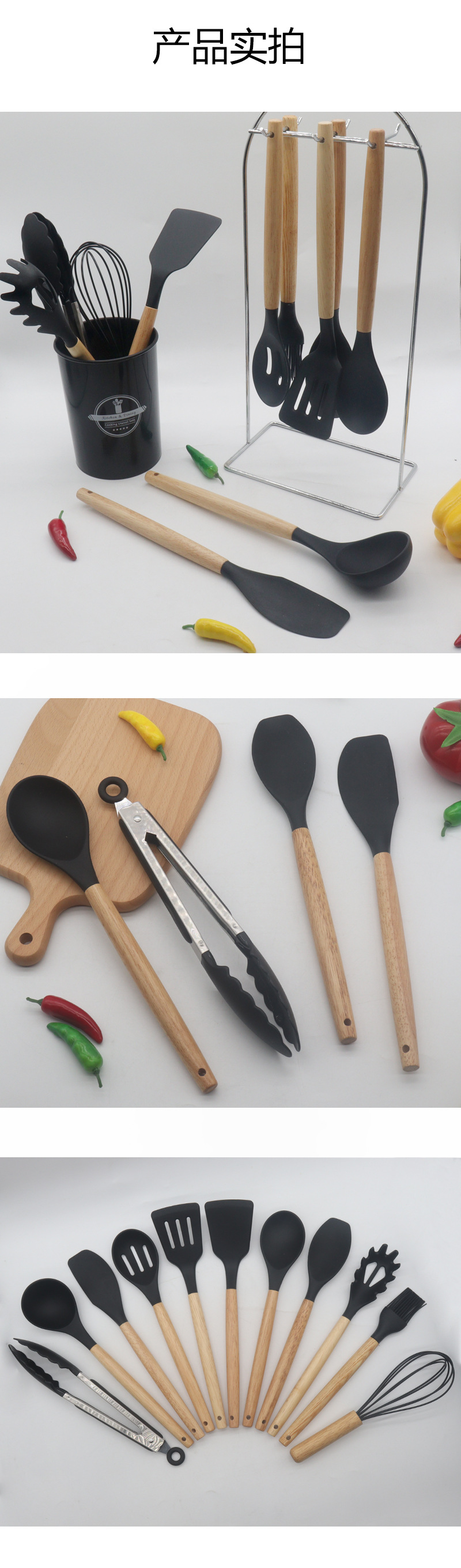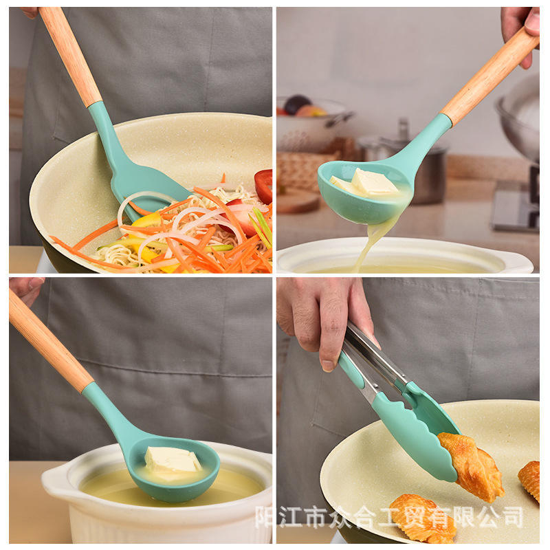 730g 실리콘 주방 용품 12 조각 세트 나무 손잡이 비 스틱 팬 고온 내성 요리 숟가락 삽 보관 배럴 주방 도구 세트스토어 가기