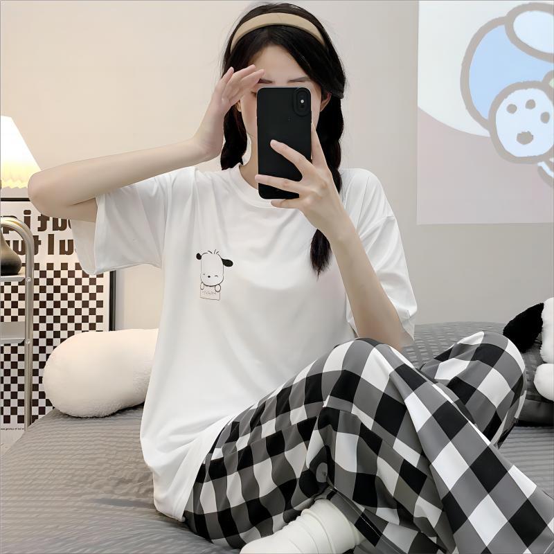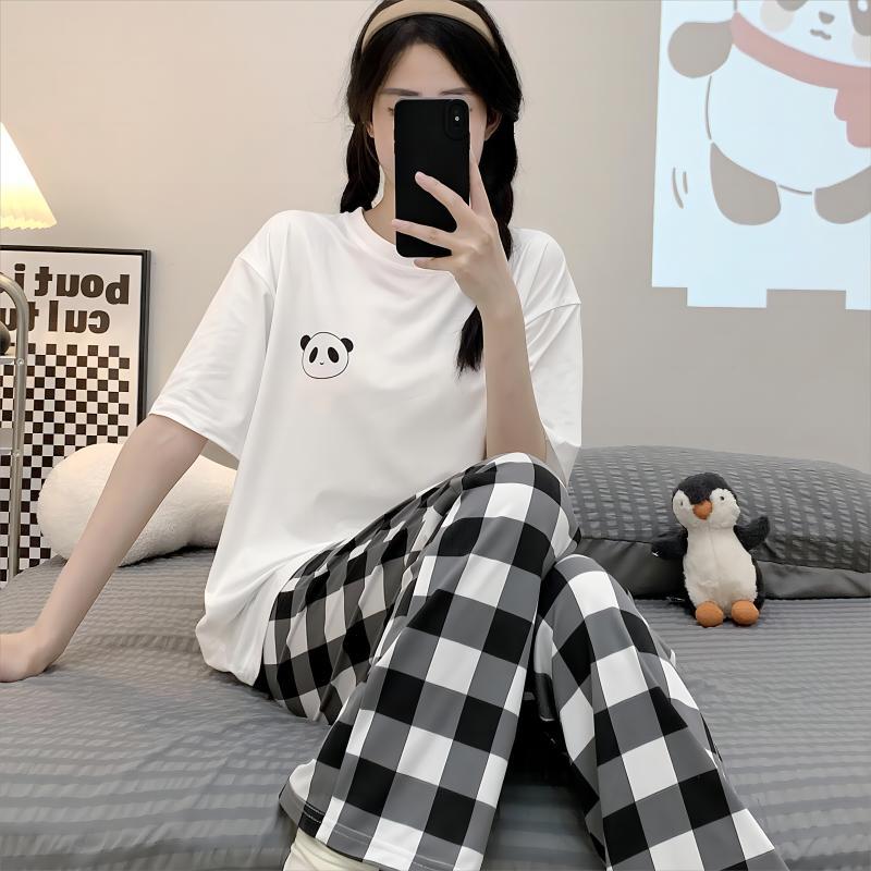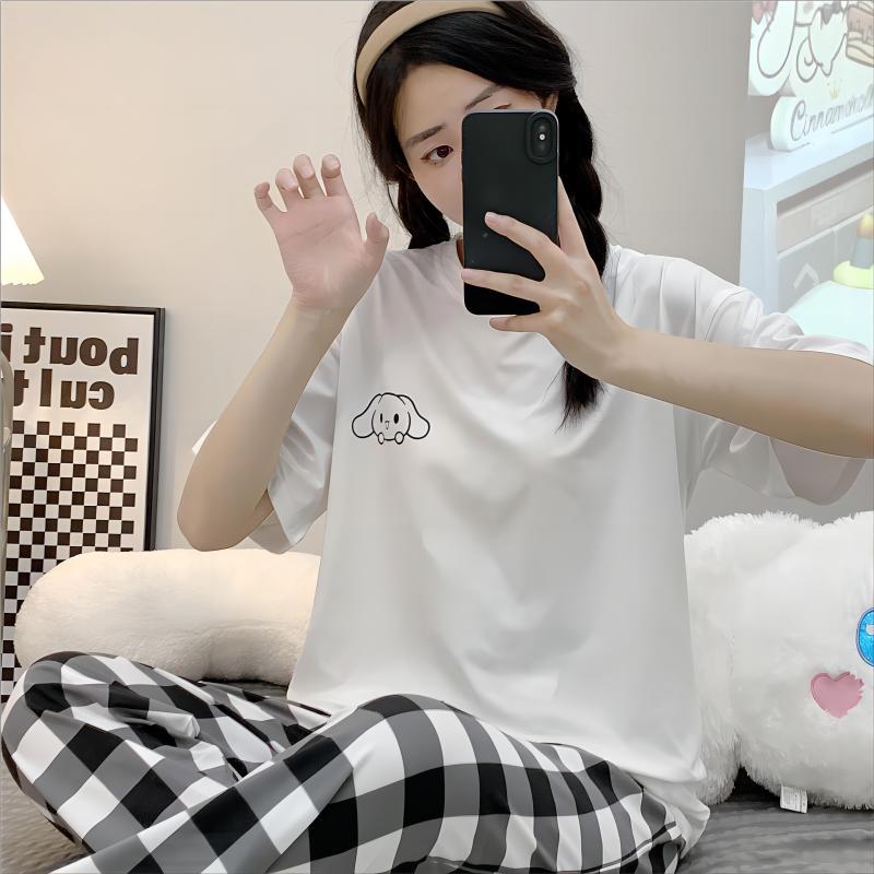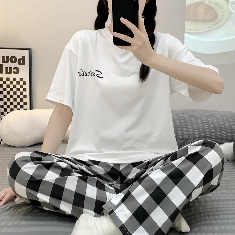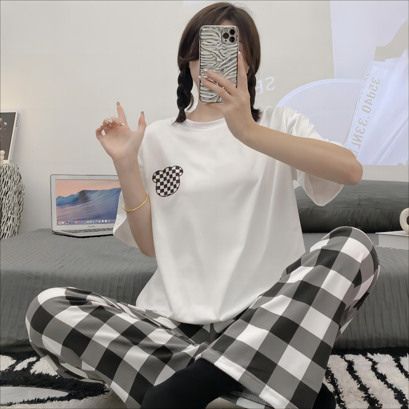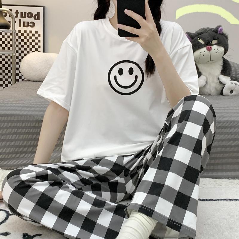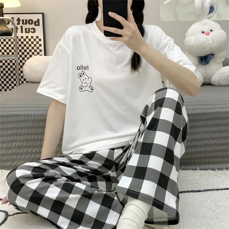국경 간 여름 잠옷 여성의 새로운 반팔 체크 무늬 바지 캐주얼 홈 의류는 2 피스 대외 무역 도매로 착용 할 수 있습니다.스토어 가기