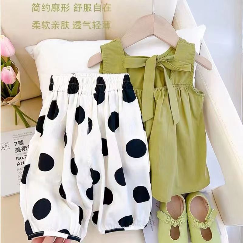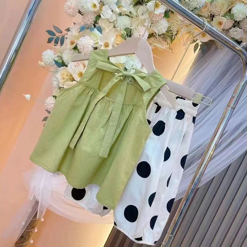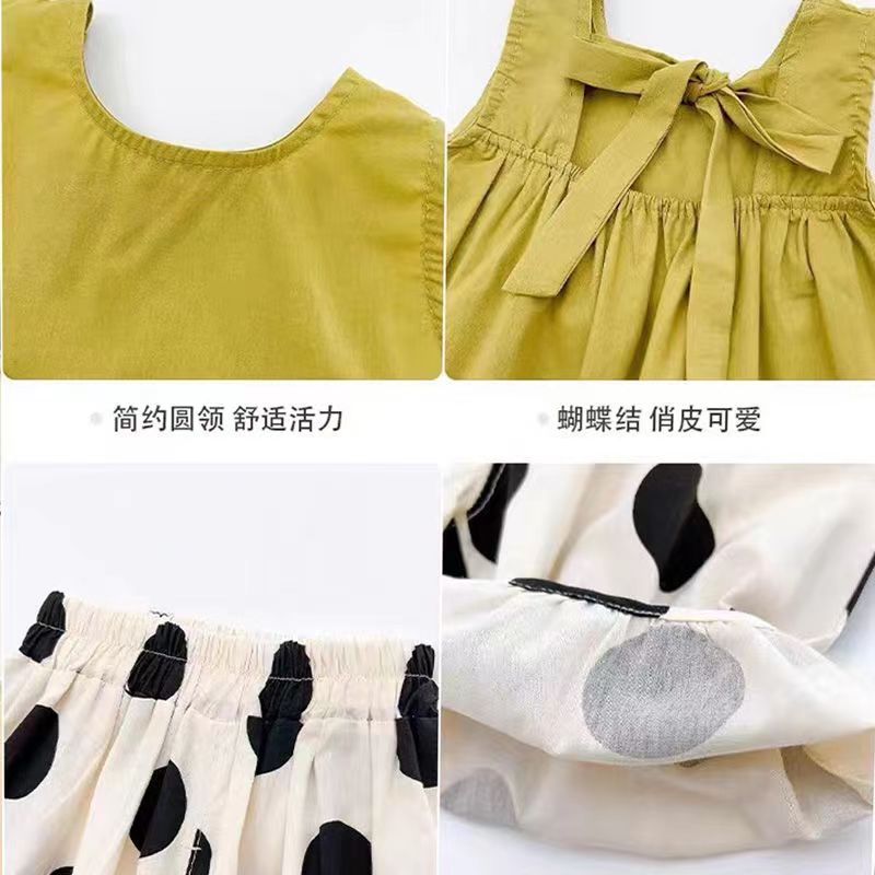 소녀 여름 새 아동복 2024 아기 소녀의 세트 조끼 민소매 옷 폴라 도트 블루머의 투피스 세트