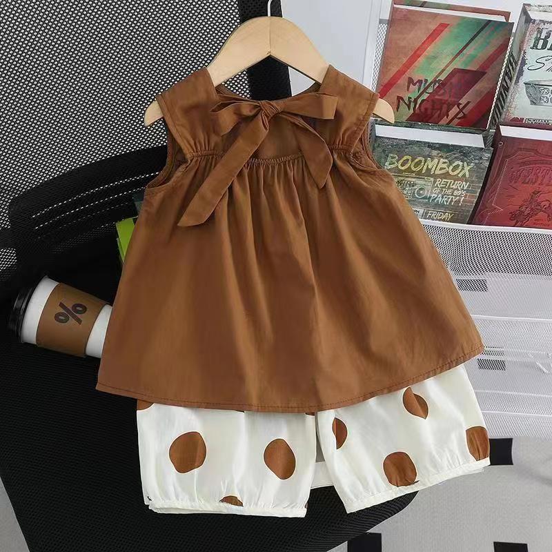소녀 여름 새 아동복 2024 아기 소녀의 세트 조끼 민소매 옷 폴라 도트 블루머의 투피스 세트스토어 가기