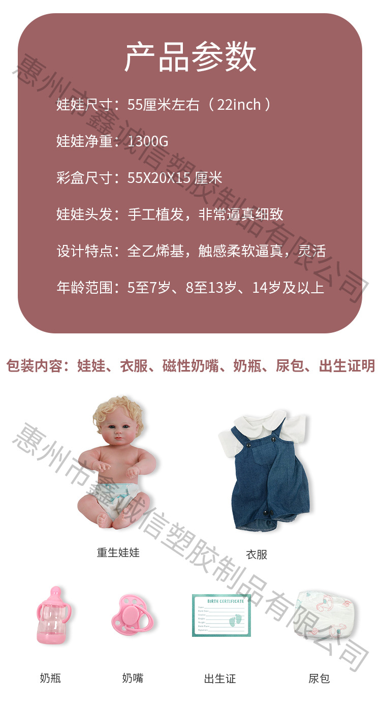 包装内容:娃娃、衣服、磁性奶嘴、奶瓶、出生证明