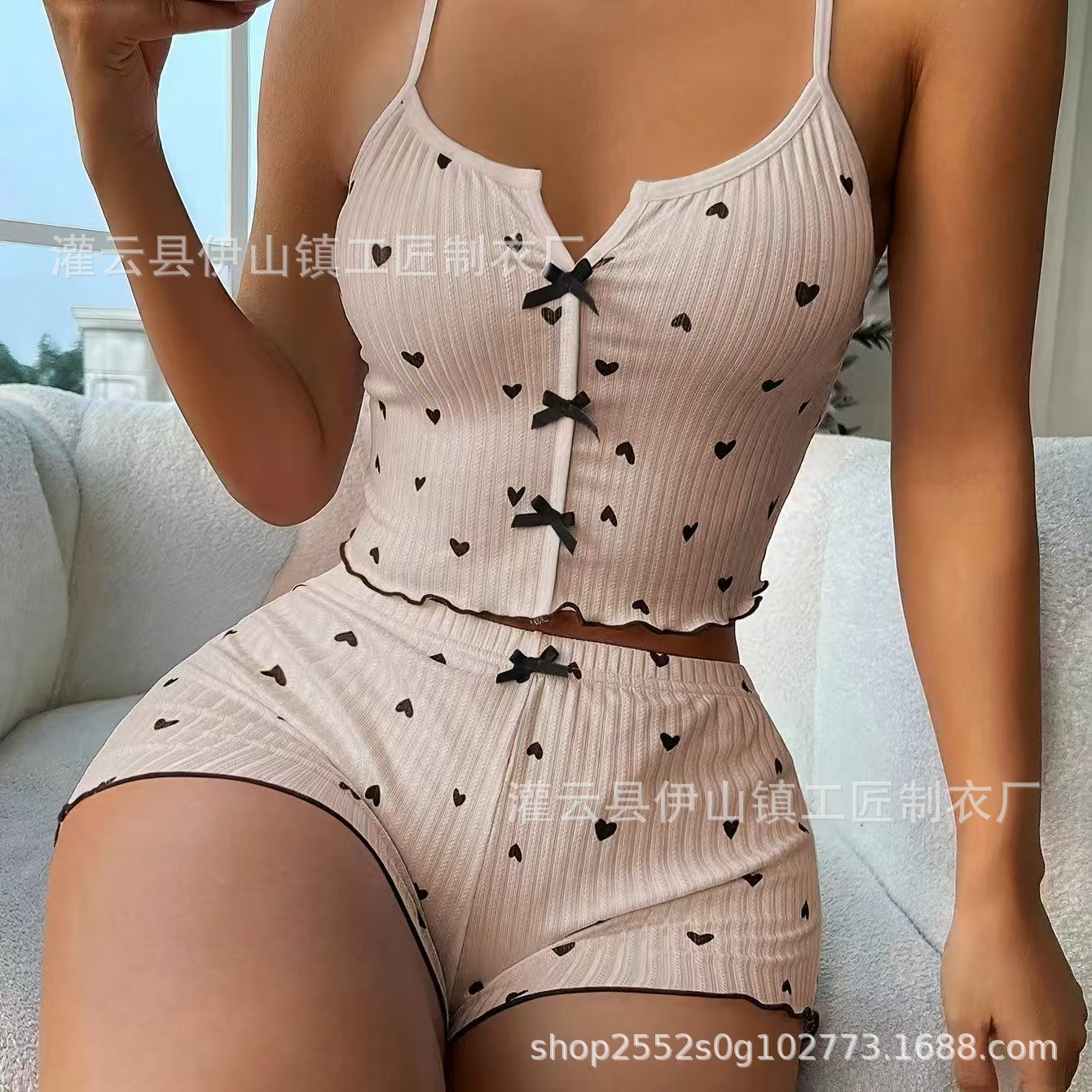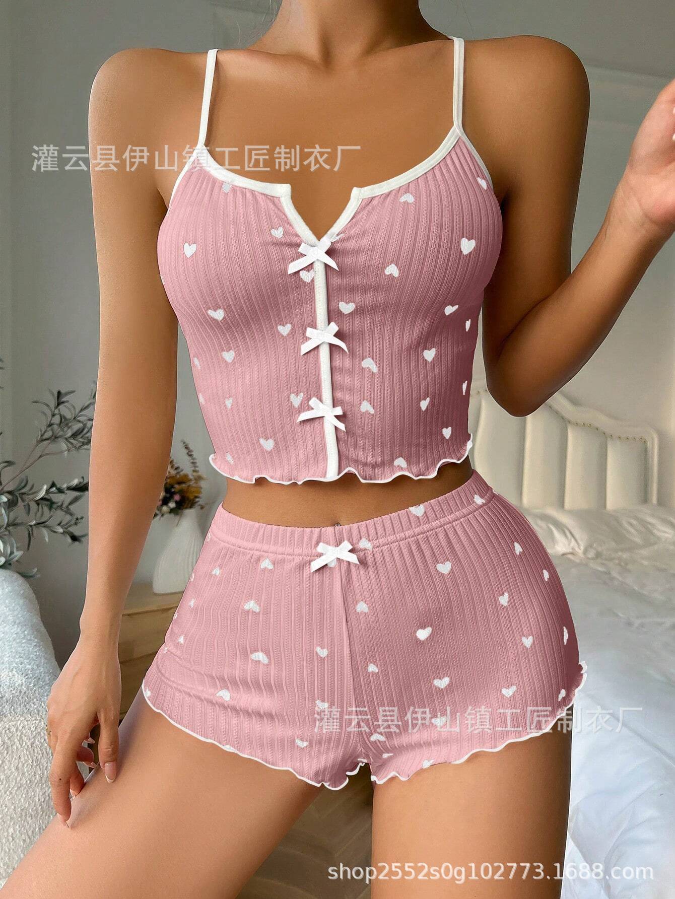국경 간 여름 여성의 새로운 잠옷 섹시한 멀티 컬러 프린트 보우 서스펜더 반바지 밀크 실크 정장 홈웨어스토어 가기