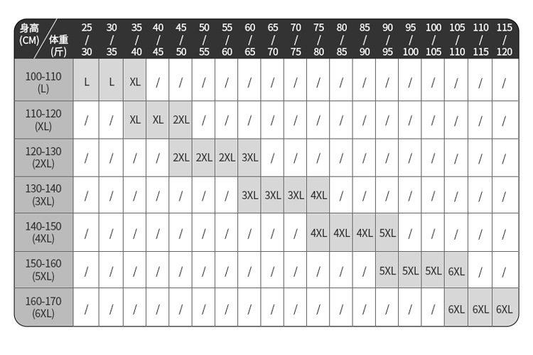 • 5XL(권장 키 150-165cm, 몸무게 45-55kgcm) 탈착식 가슴 패드 포함