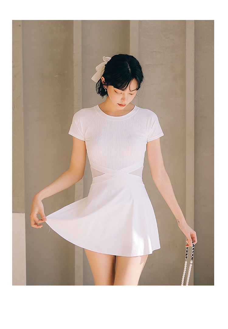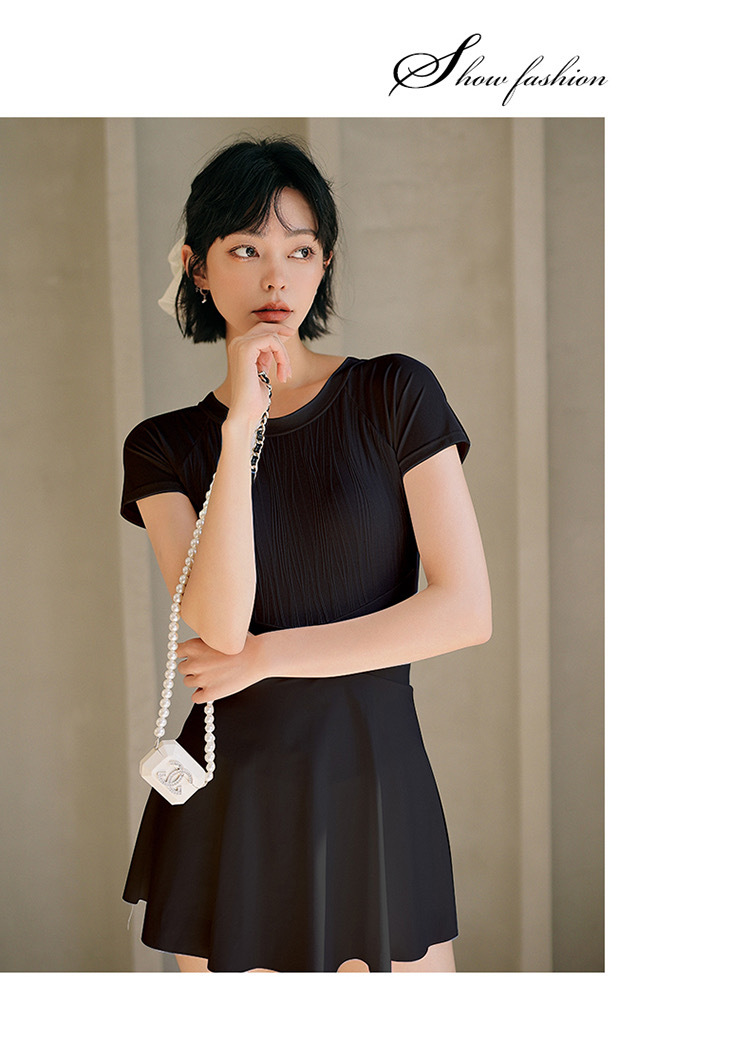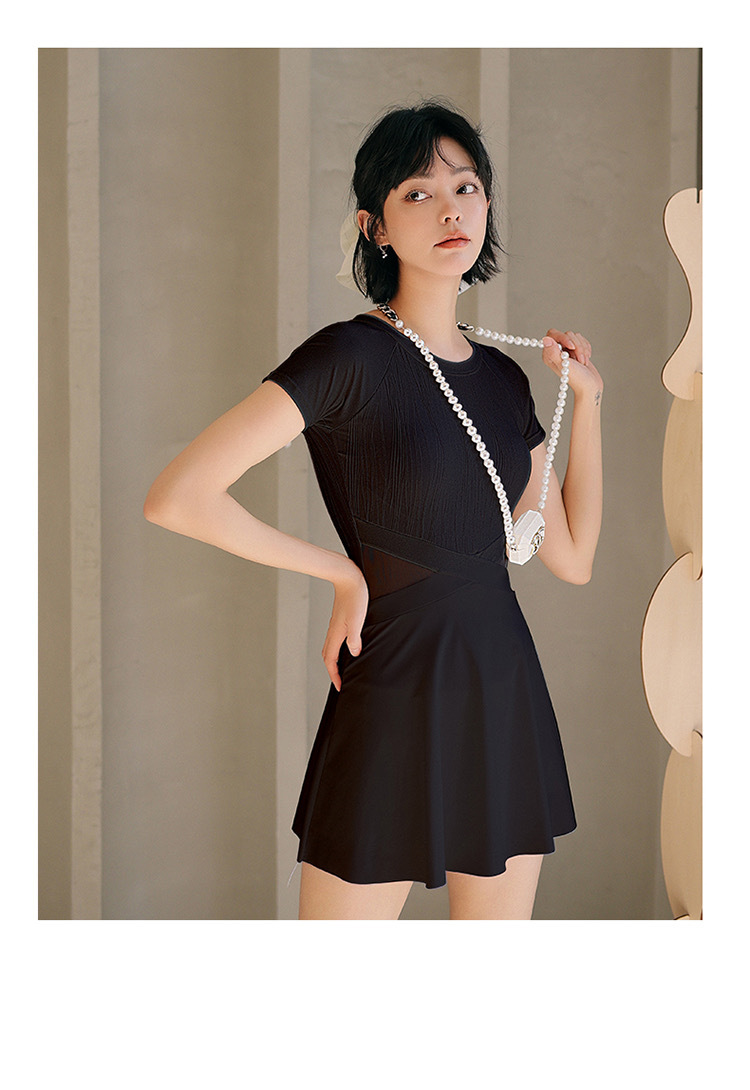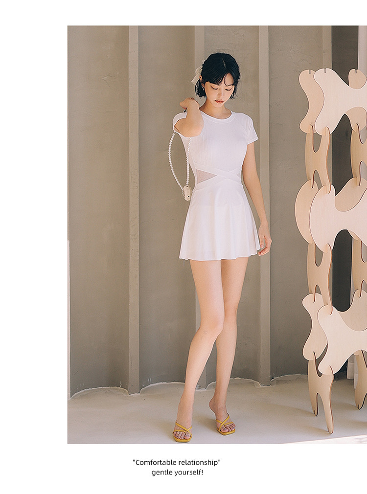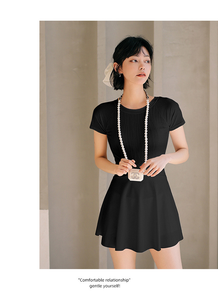 여성용 원피스 스커트 스타일의 단색 수영복 반소매 배꼽 커버 슬리밍 가슴 모양의 온천 한국 요정 팬 인 수영