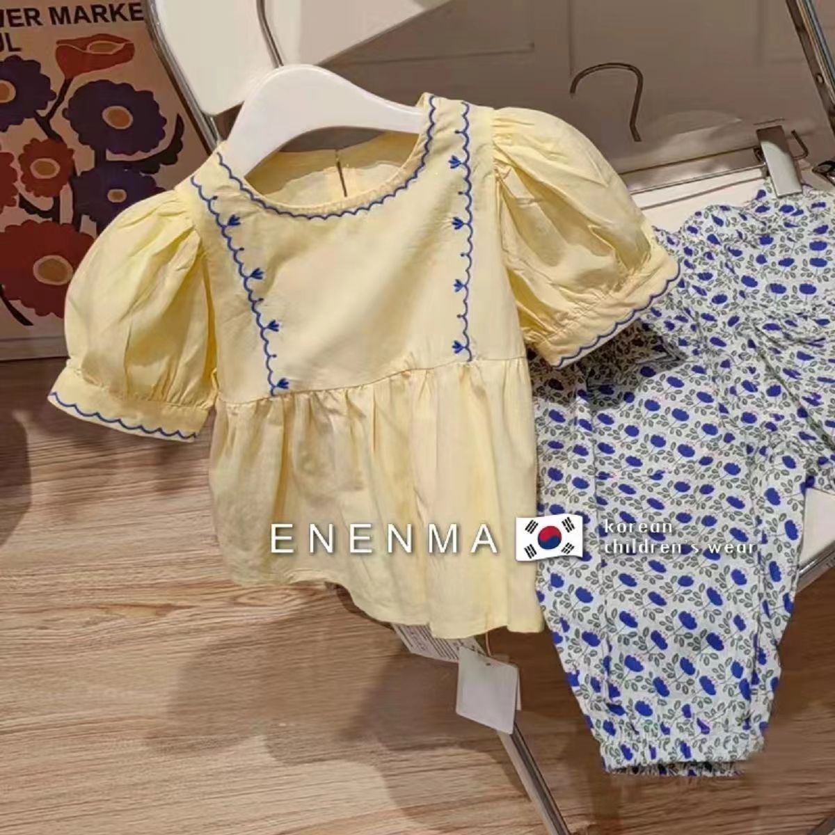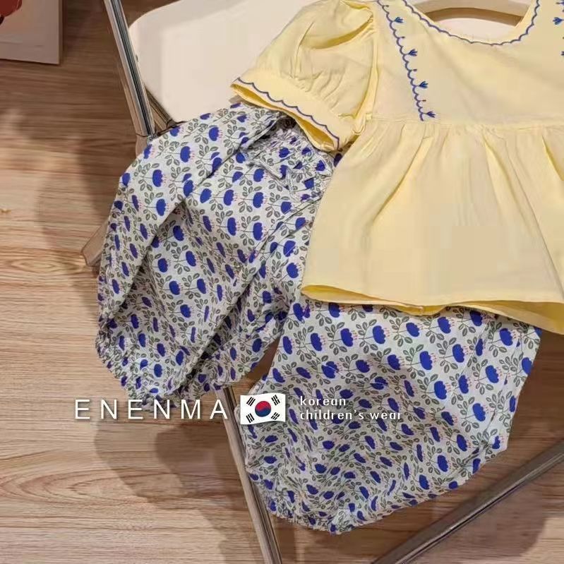24 년 여름 새로운 아동복 아기 소녀 귀여운 신선한 노란색 자수 탑 꽃 바지 투피스 세트스토어 가기