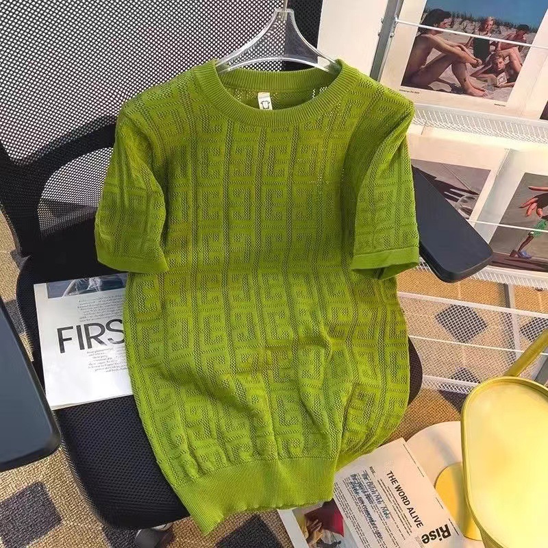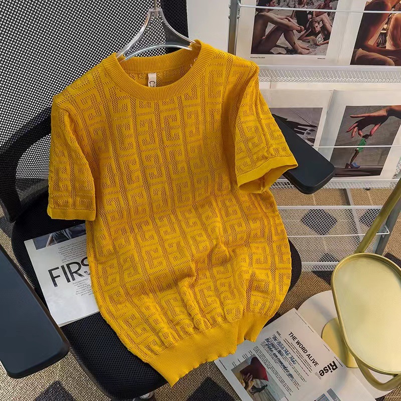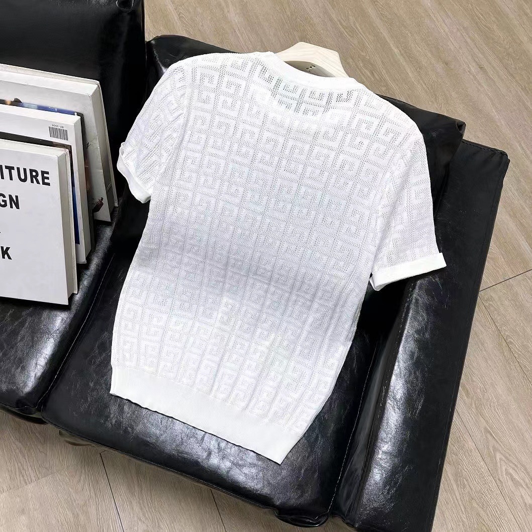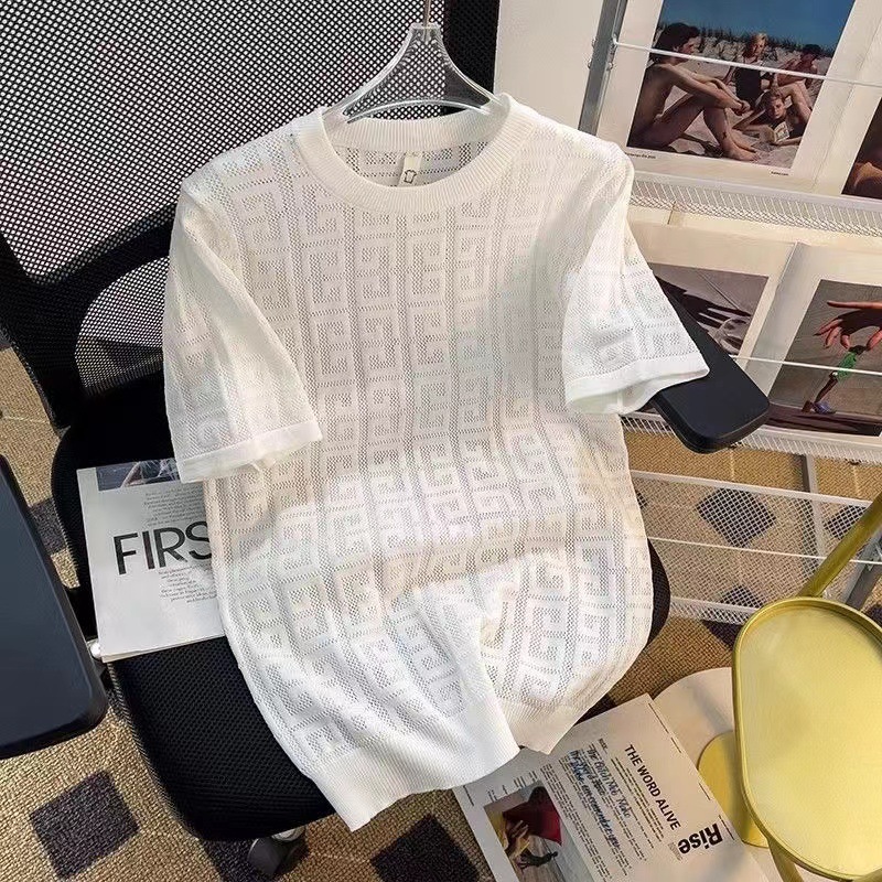 남성용 크루 넥 풀오버 반팔 솔리드 컬러 스웨터 슬림 핏 할로우 아웃 아이스 실크 슬림 핏 얇은 탑