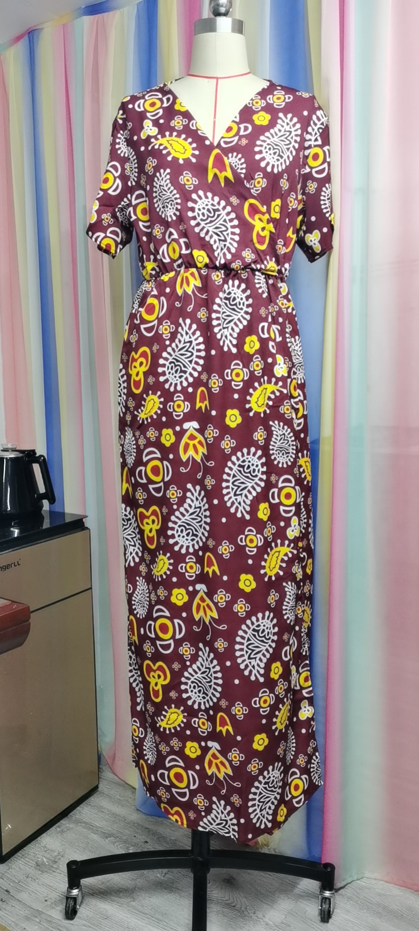 국경 간 여성 보헤미안 인쇄 반팔 하이 웨이스트 스티칭 V 넥 비치 휴가 슬리밍 여성 원피스
