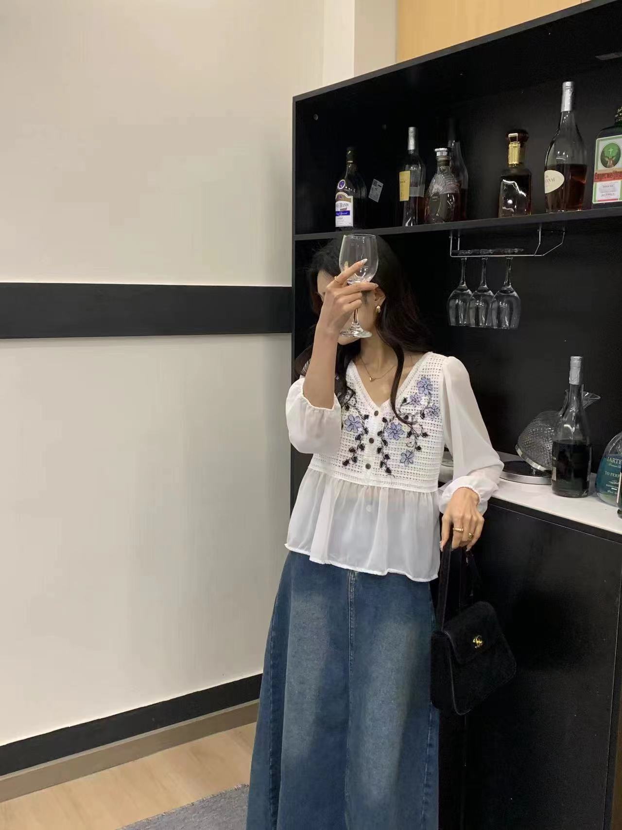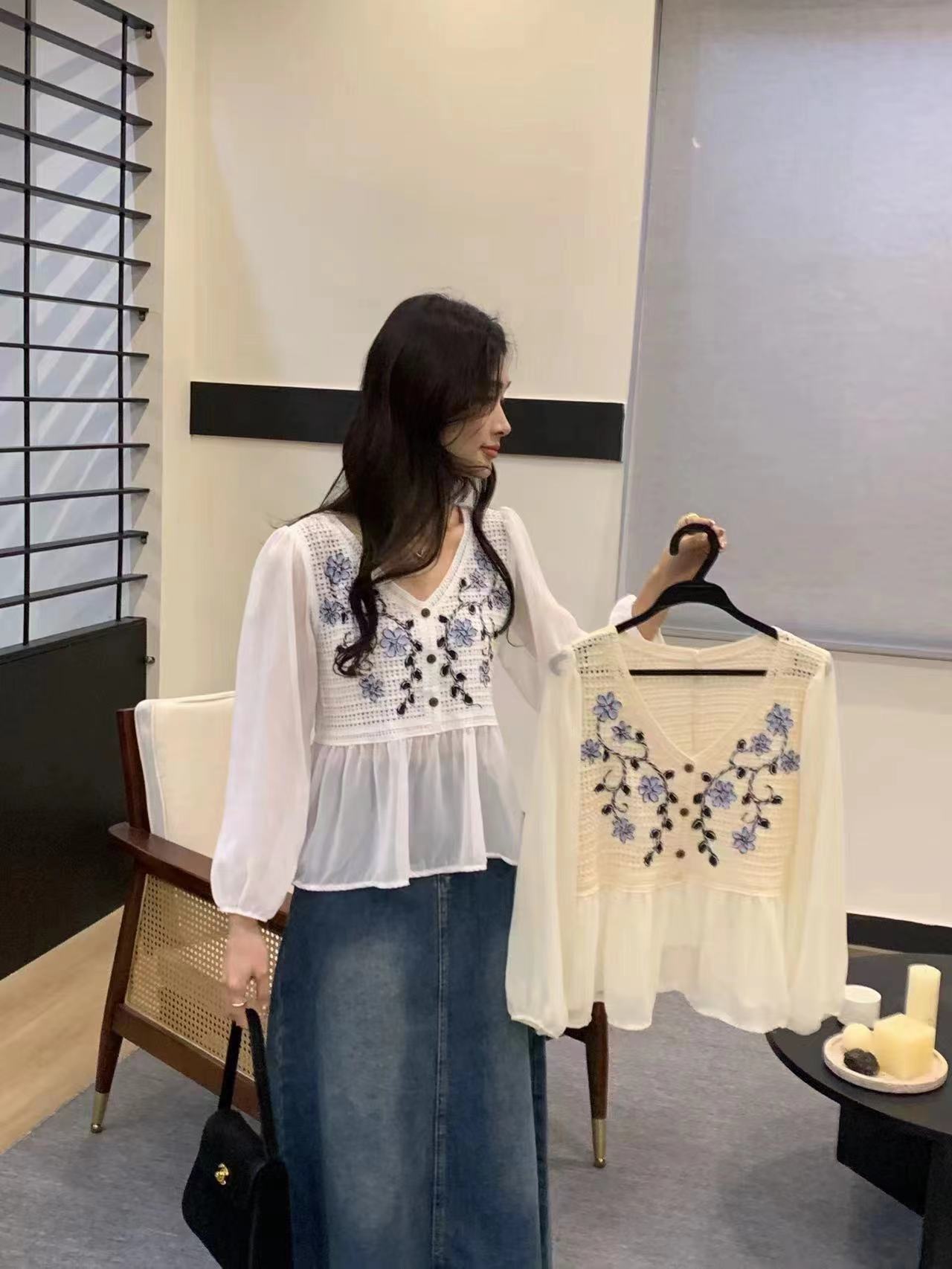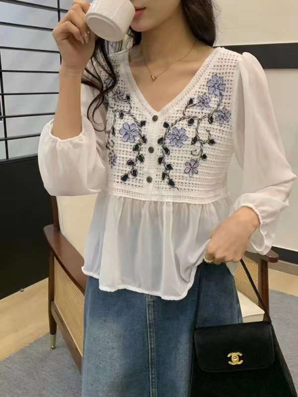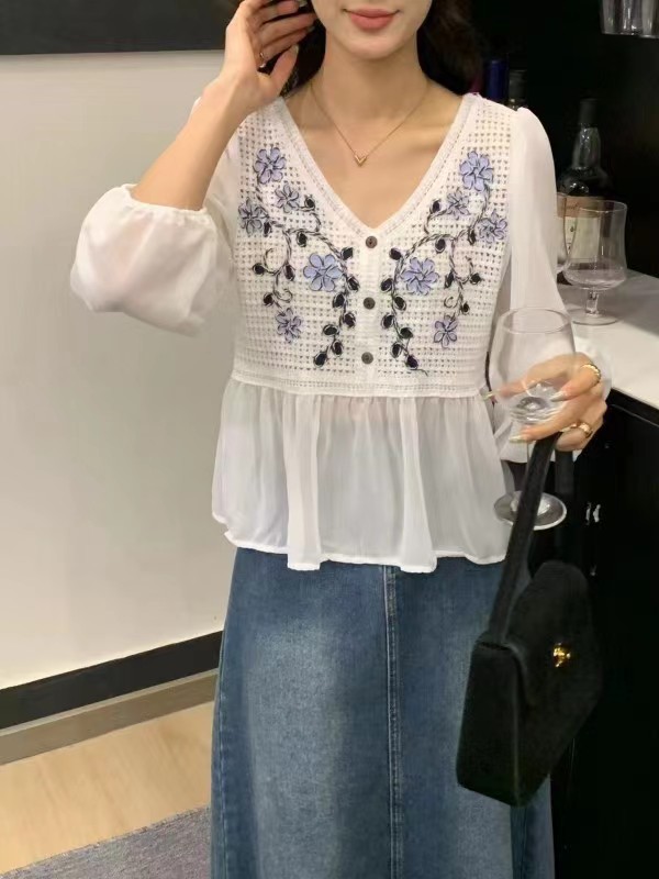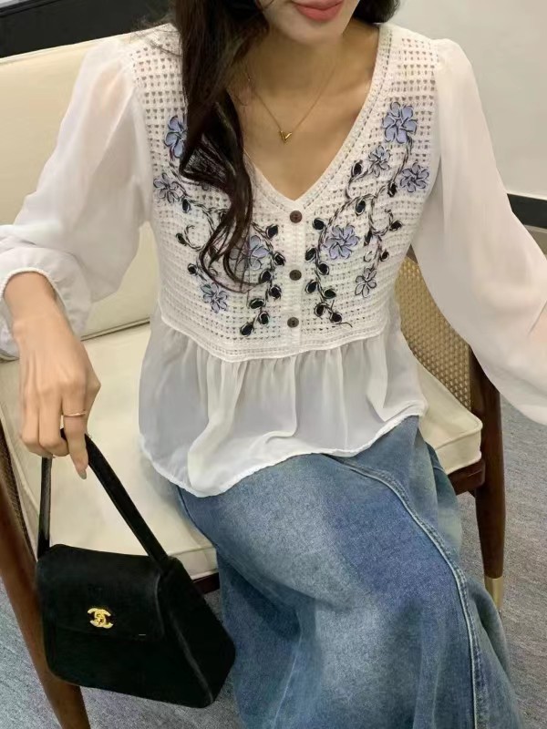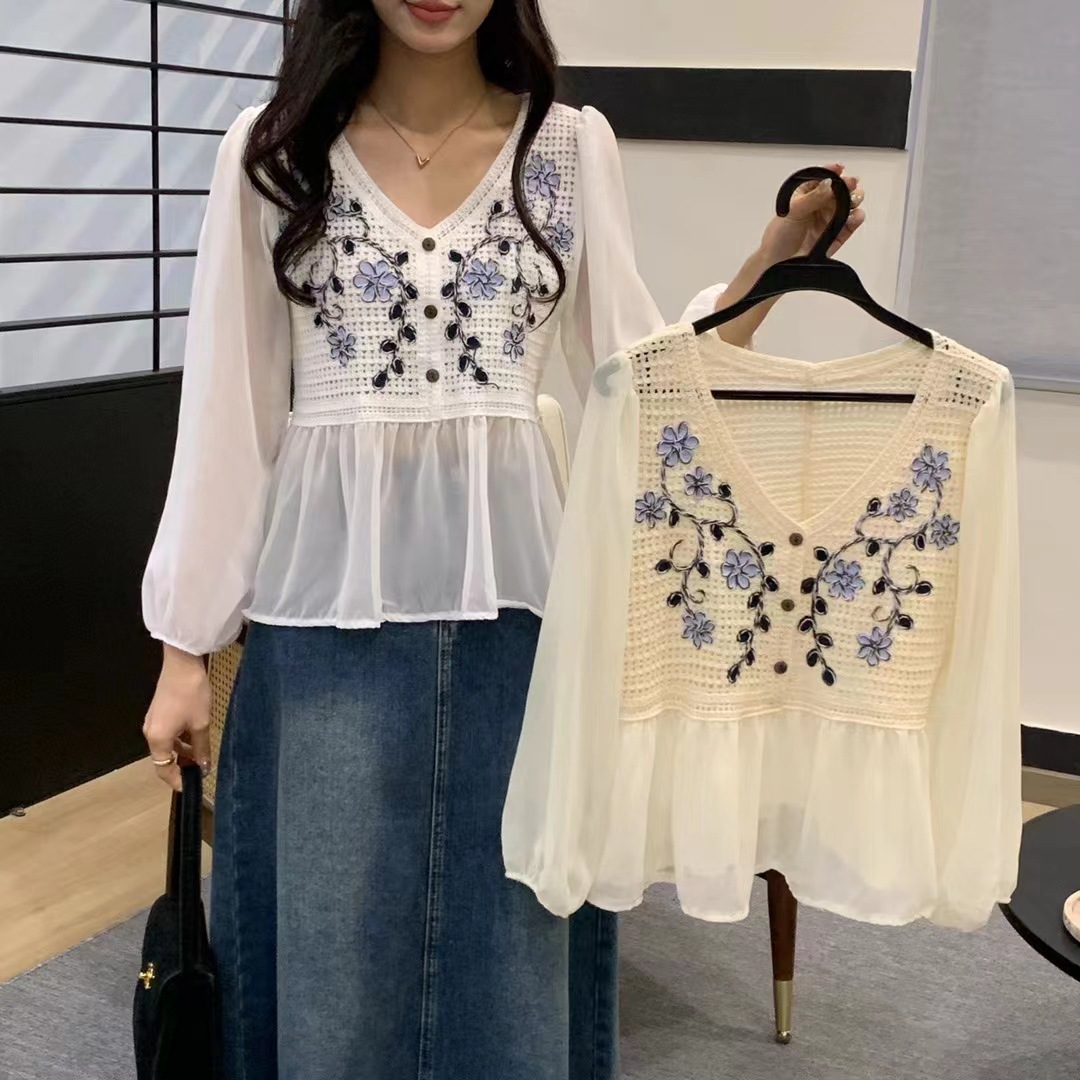 디자인 센스 니쉬 스위트 레이스 크로 셰 뜨개질 할로우 쉬폰 셔츠 여성의 세련된 셔츠 탑 여름 2024 새로운스토어 가기